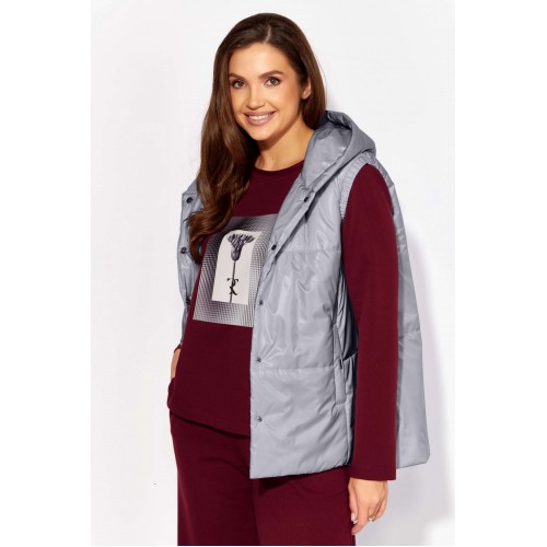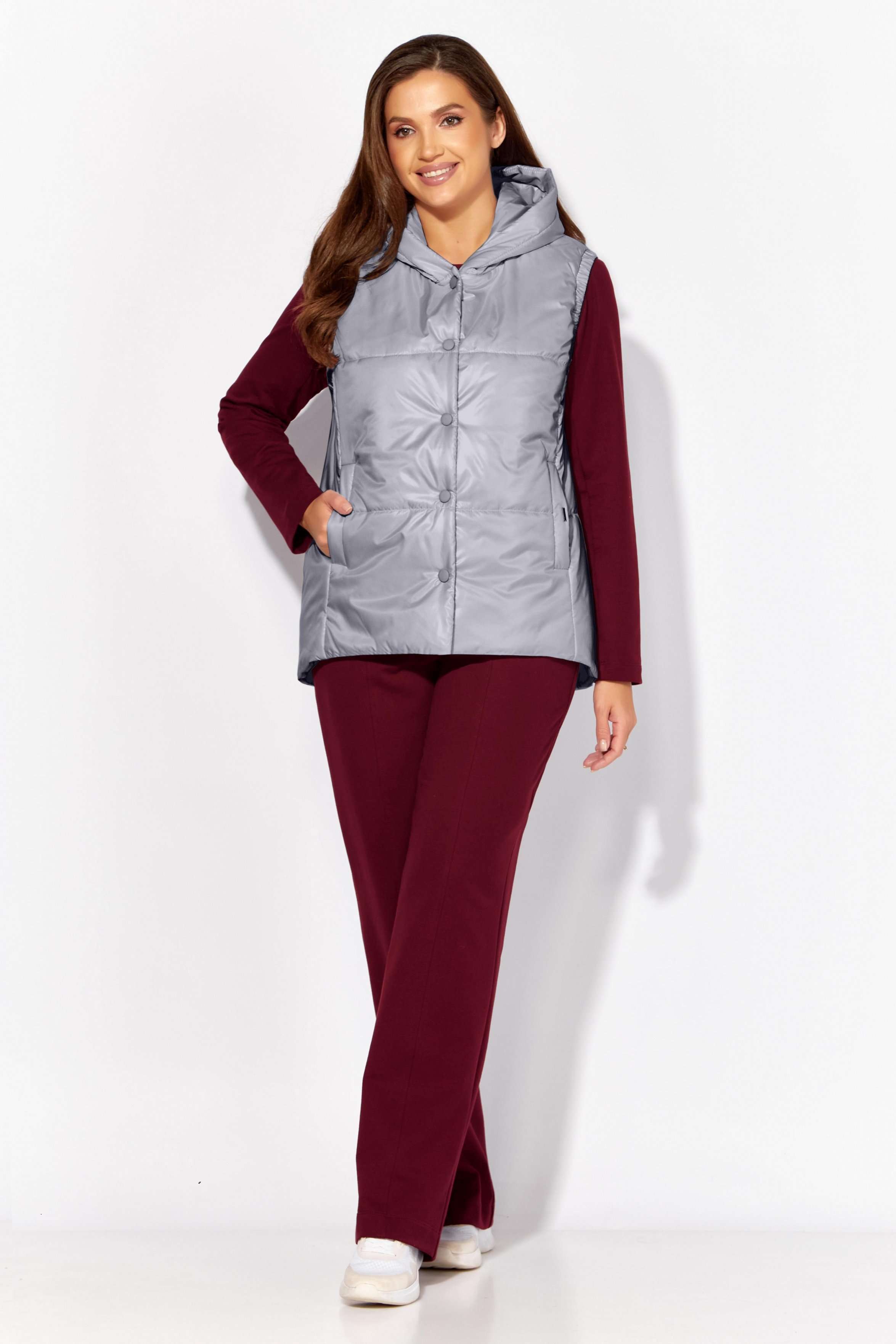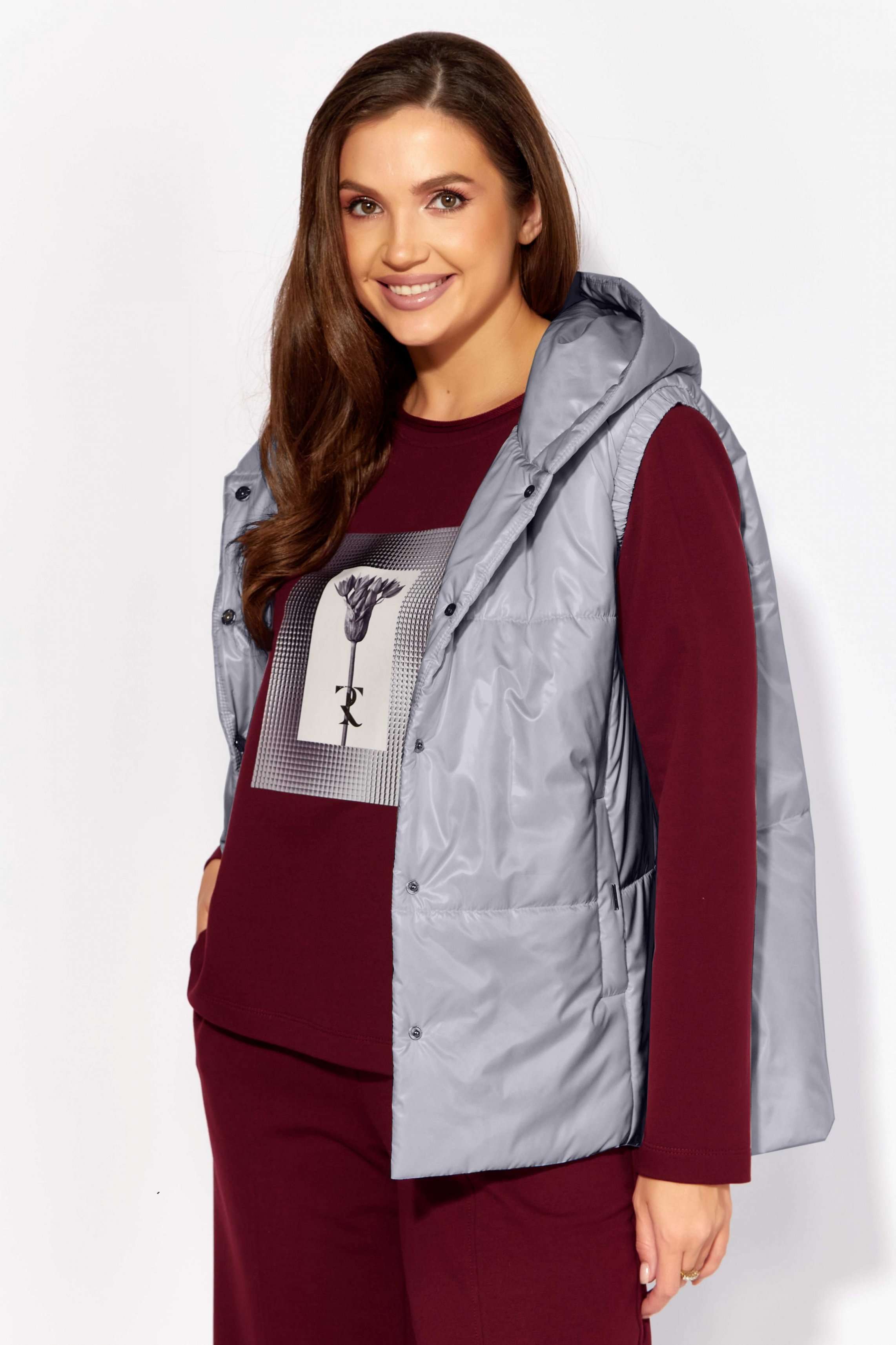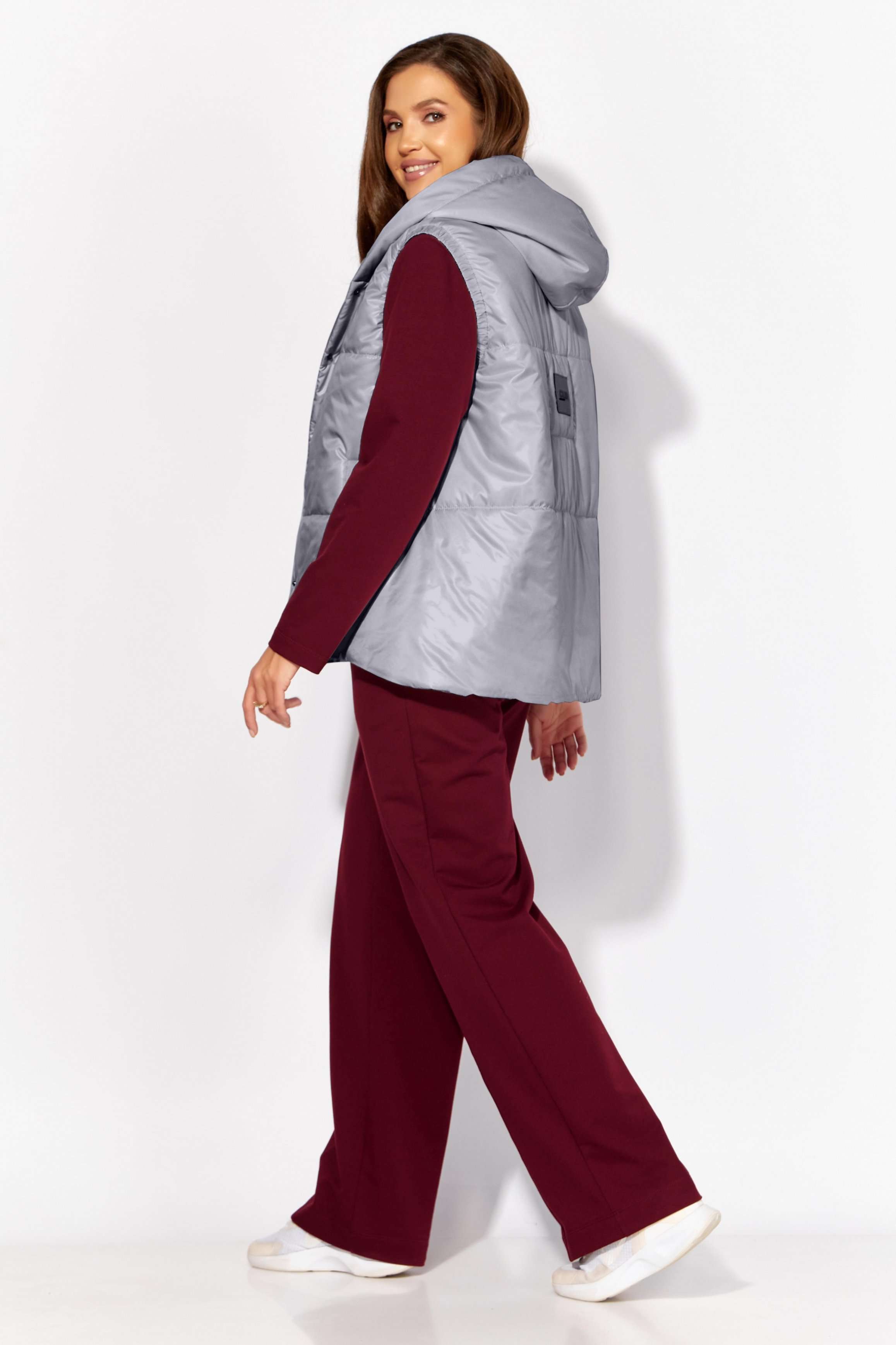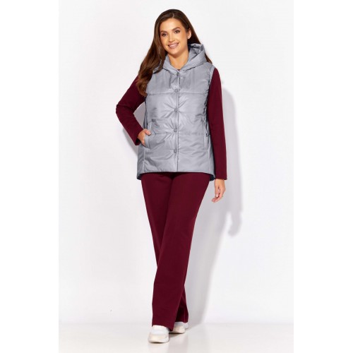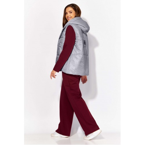 Комплект женский, 3х предметный, состоящий из жилета, свитшота и брюк. Жилет прямого силуэта, плащевка на синтепоне (VS-100), простеган широкими горизонтальными строчками, на подкладке. По переду рельефы и карманы с "листочкой" Застежка центральная на кнопки. Горловина оформлена капюшоном. На спинке отделочная деталь с нашивкой. Низ жилета сзади удлинён. Свитшот прямого силуэта с длинным втачным рукавом. Перед задекорирован принтом. Горловина круглой формы с подрезной бейкой с открытым краем. Брюки прямые с наклонными карманами. По центру передних деталей рельефы с отделочными строчками. Пояс притачной, по переду гладкий, дальше на резинке по кругу.