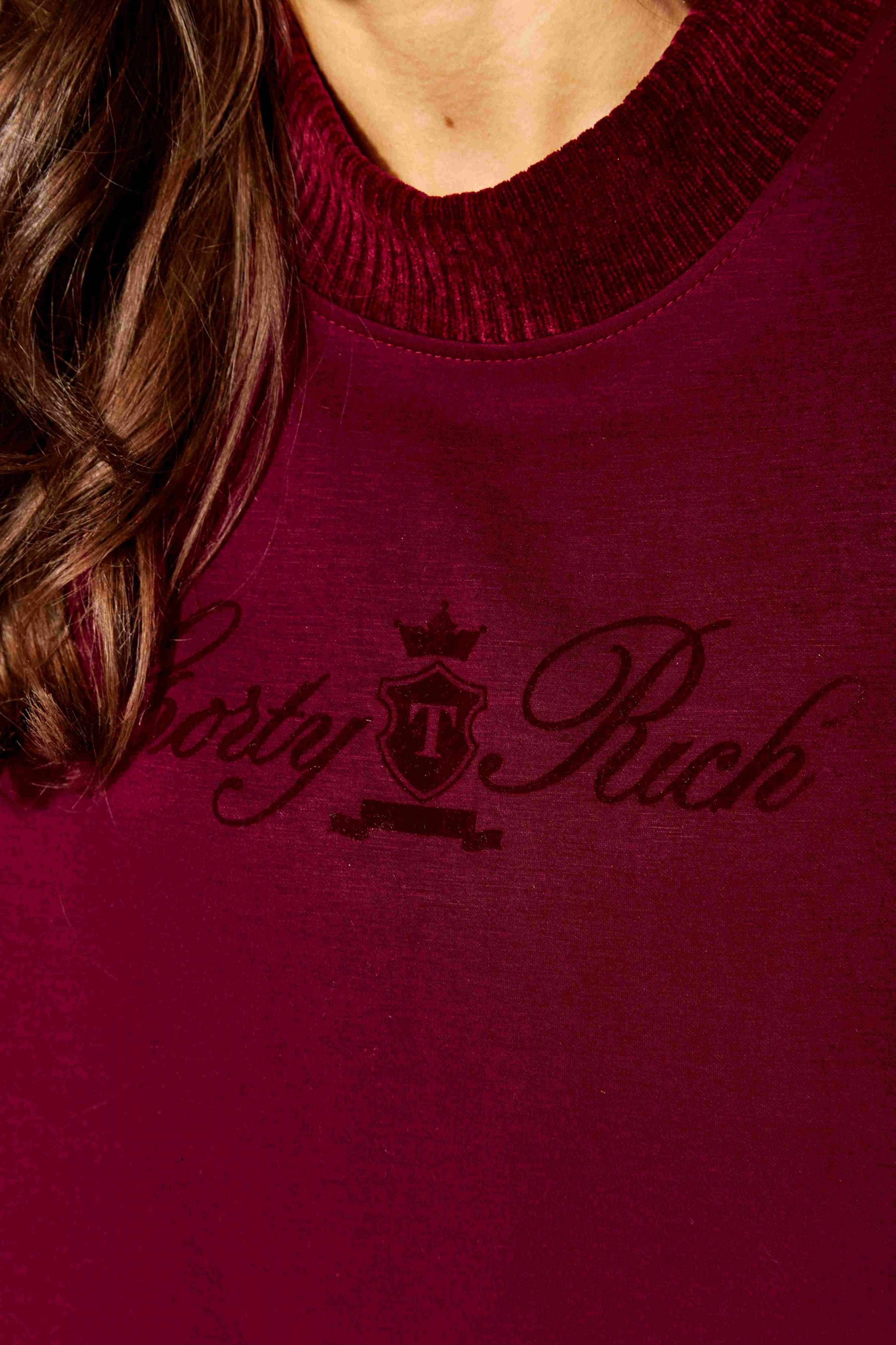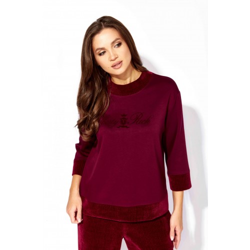Комплект женский, 2х предметный, состоящий из джемпера и брюк, в сочетании двух видов трикотажного полотна. Джемпер прямого силуэта, с рукавом длинной 3/4. Рукав со спущенной линией плеча. По низу отрезная манжета. Горловина круглой формы, с широкой подрезной бейкой. По низу переда отрезная планка. Перед задекорирован принтом. Манжеты рукавов, бейка горловины и планка низа из отделочного трикотажного полотна. Спинка без особенностей. Брюки прямые. По переду наклонные карманы. Пояс притачной с резинкой и кулисой.