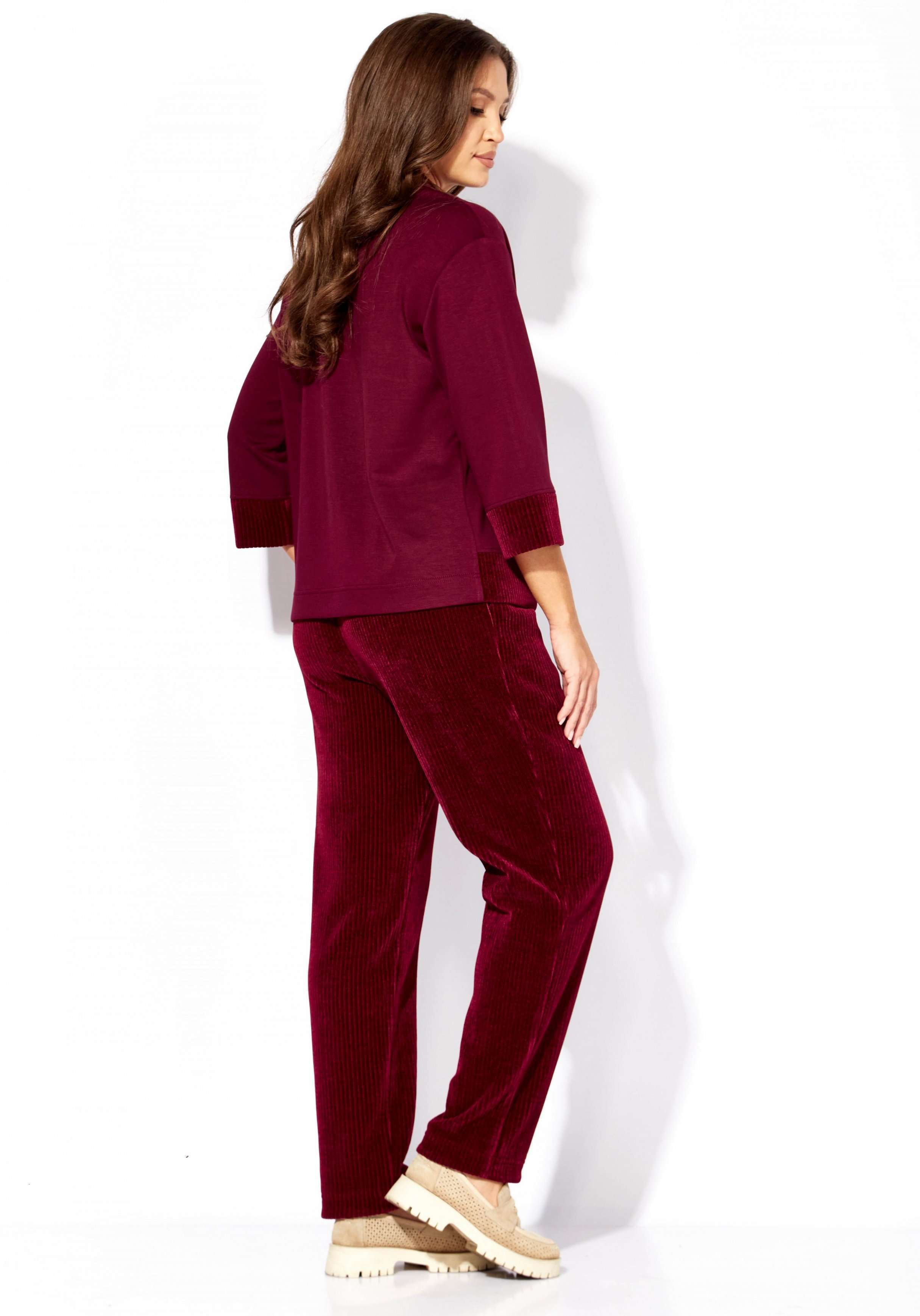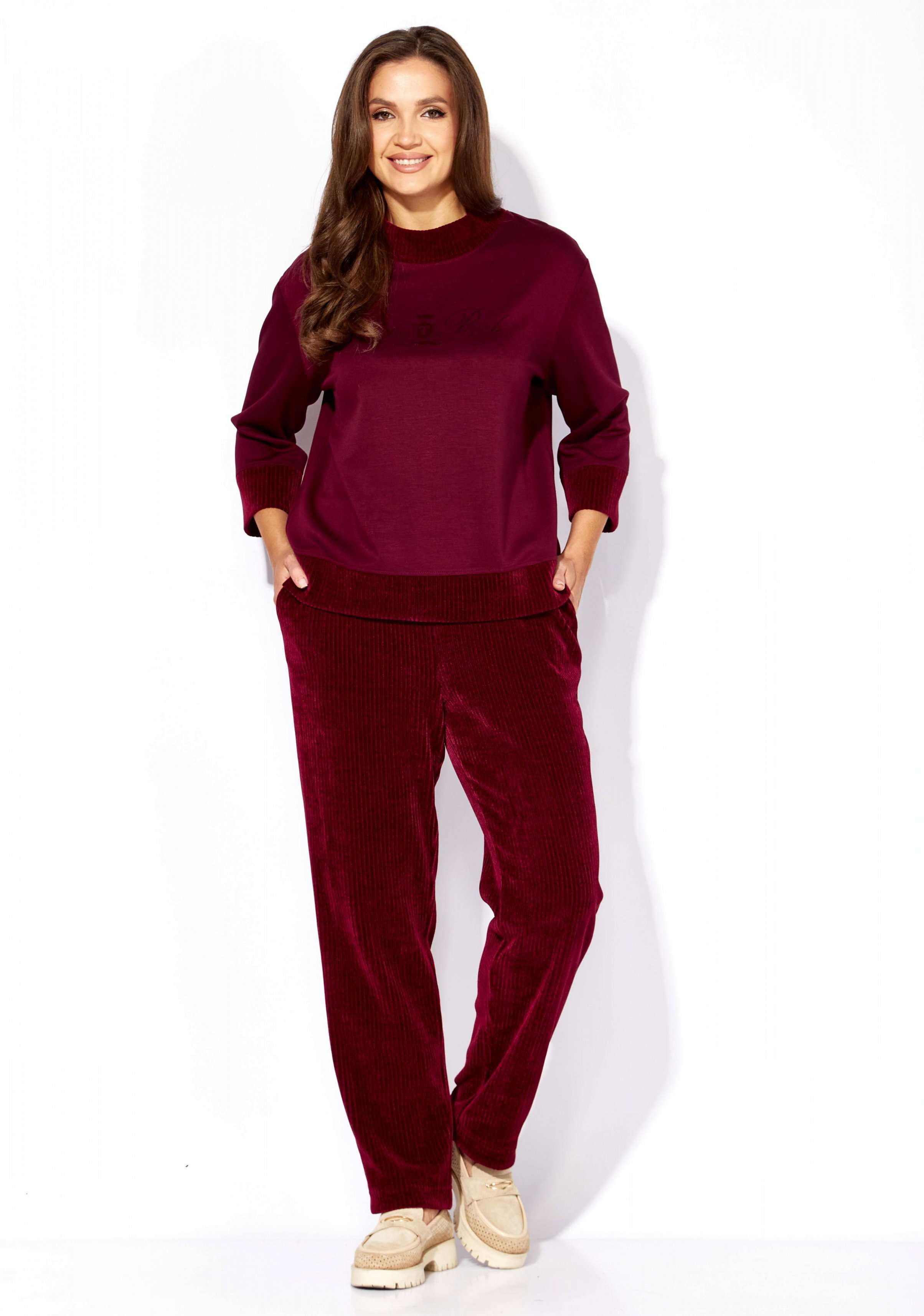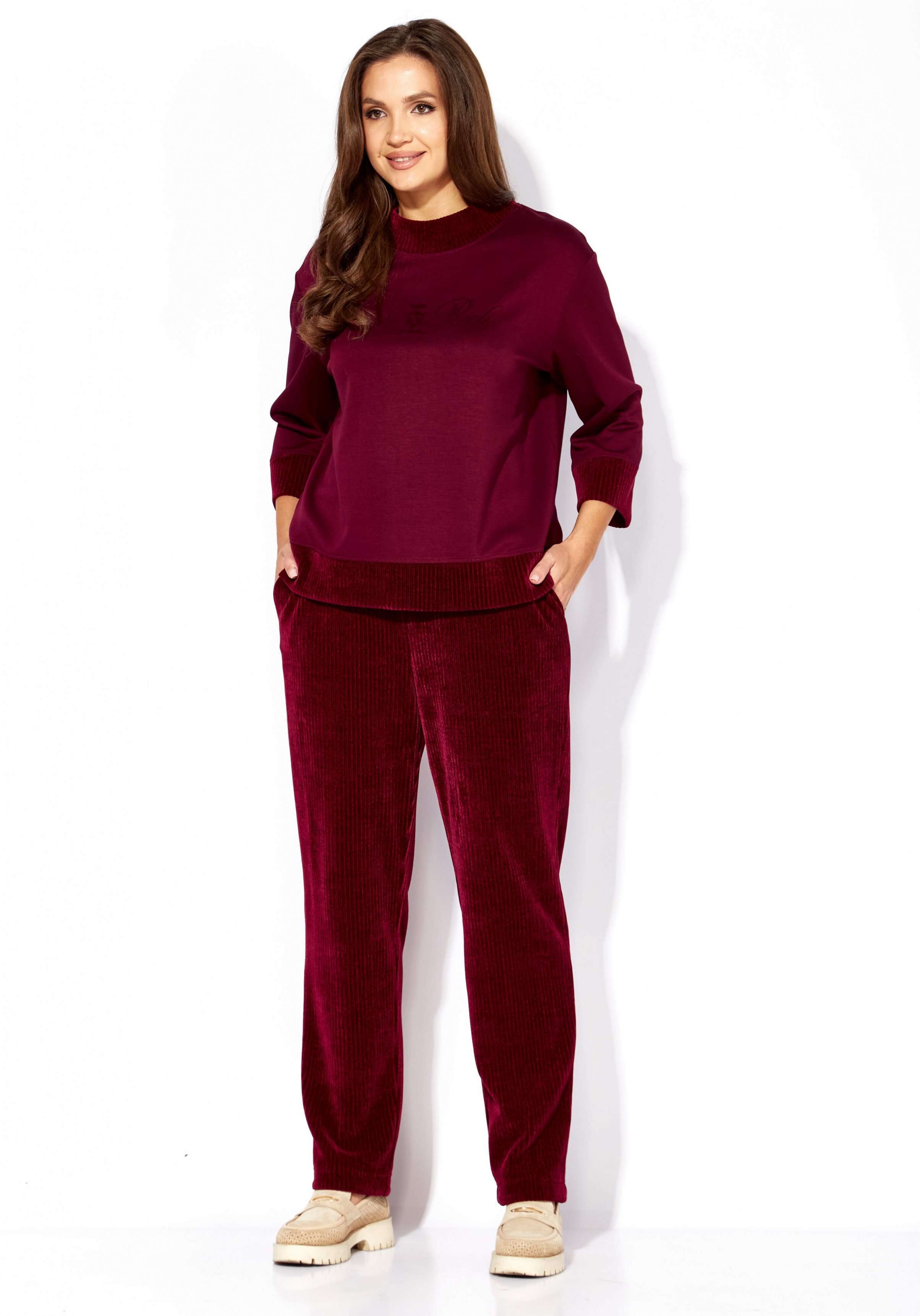 Состав: Джемпер: вискоза 67%, нейлон 28%, спандекс 5%. Брюки: полиэстер 65%, вискоза 33%, спандекс 2%.