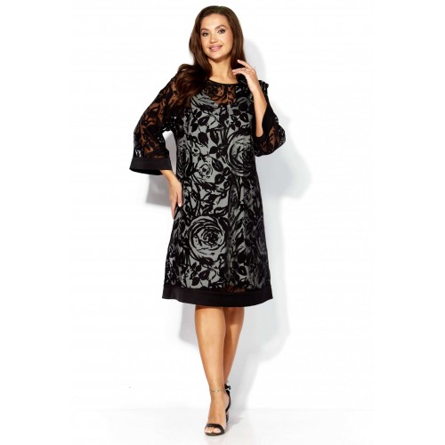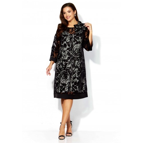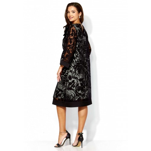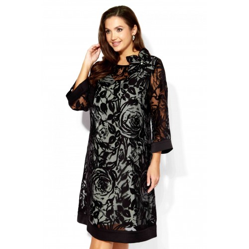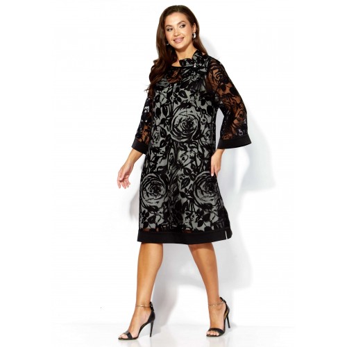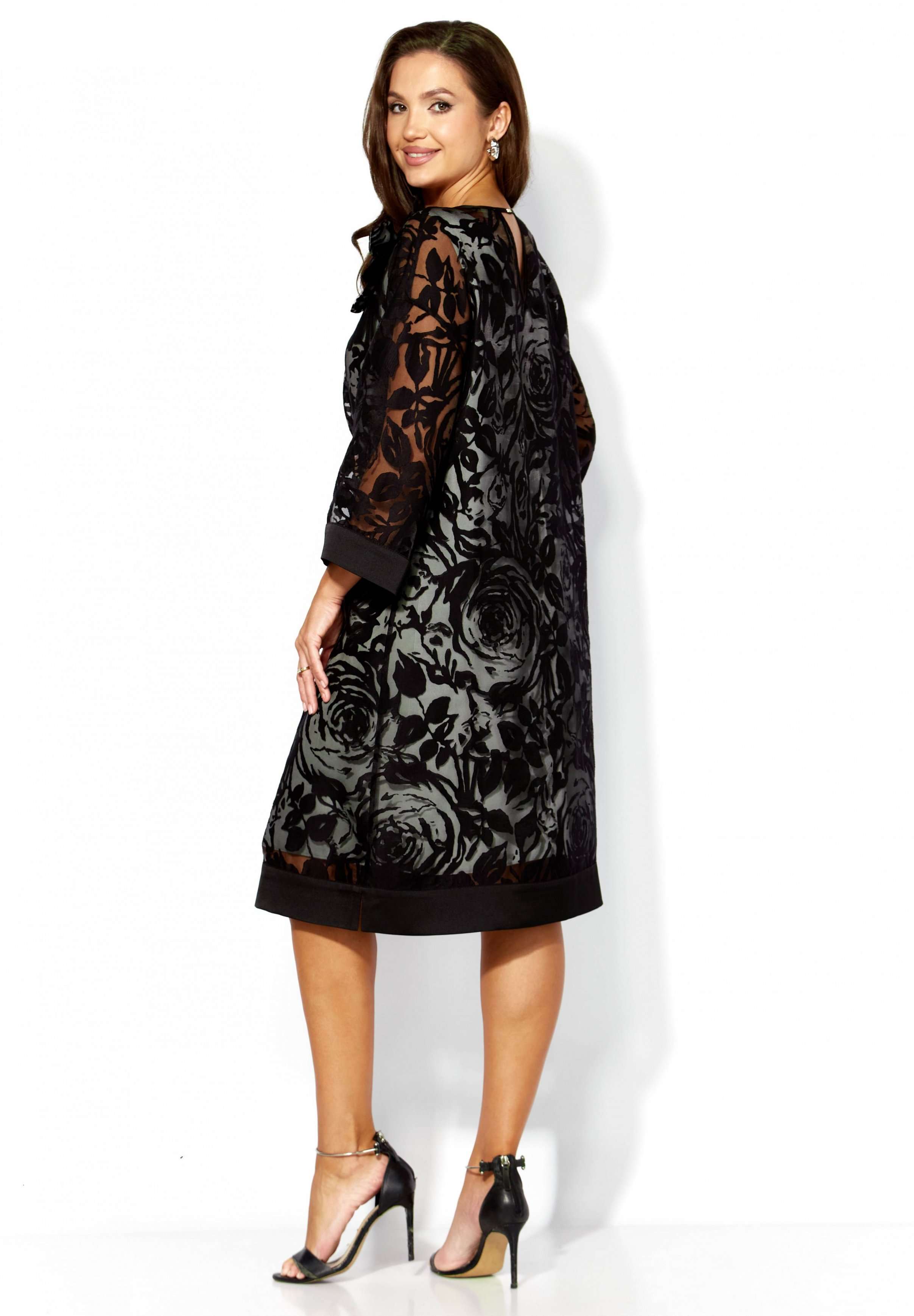 Комплект женский, 2х предметный, состоит из верхнего и нижнего платья. Верхнее платье выполнено из ткани органза. Платье А-силуэта с рукавом длинной 3/4. Рукав со спущенной линией плеча. По низу рукава и платья отделочные планки из атласа. Вырез горловины по переду "лодочка", по спинке фигурный акцентирован атласной бейкой. По спинке декоративная нашивка. Декором служит съемный цветок. Нижнее платье из вискозного атласа А-силуэта с выточками нагрудными, без рукавов. Вырез горловины по переду У-образной формы, закругленный, по спинке острый. По спинке средний шов.