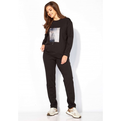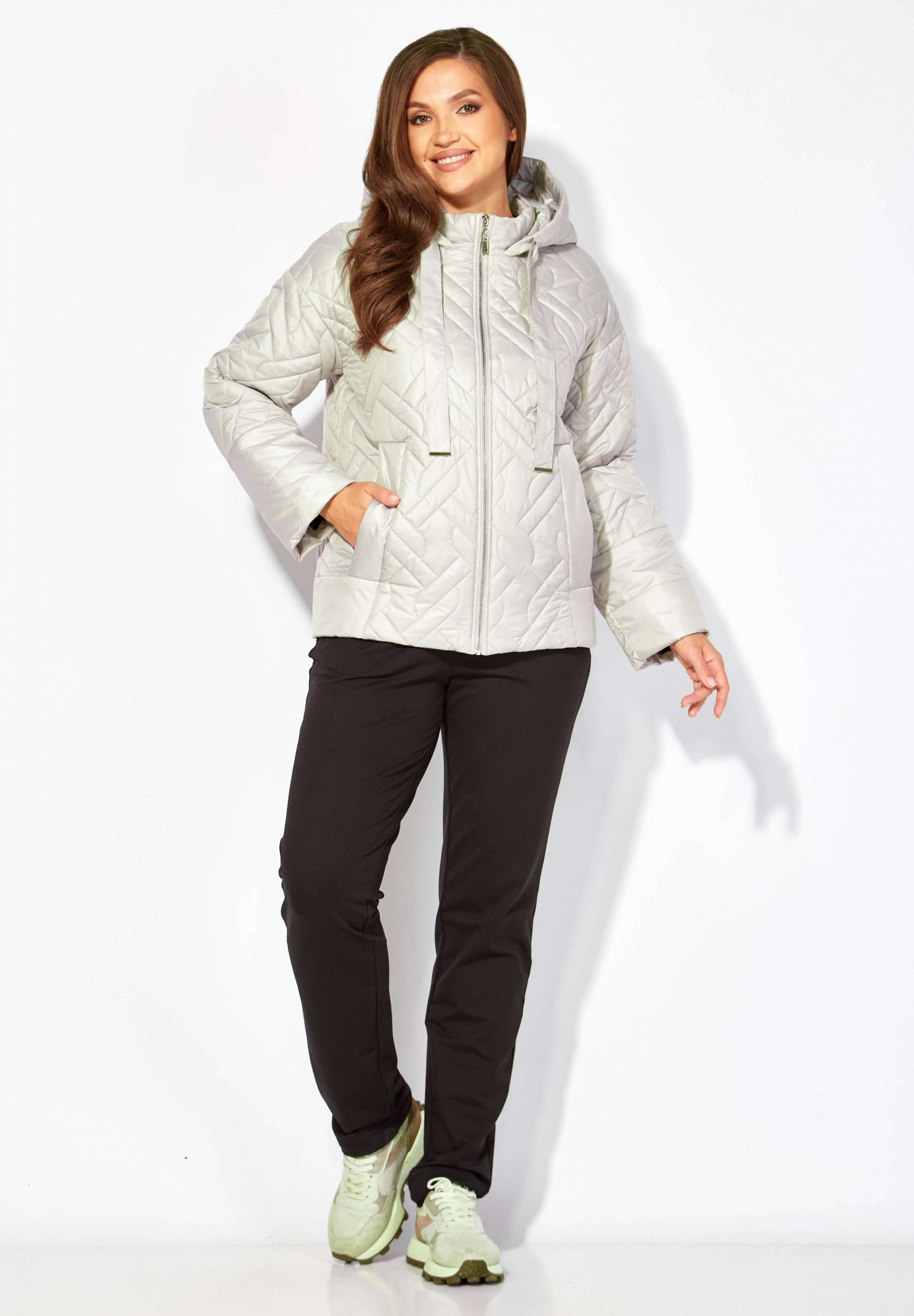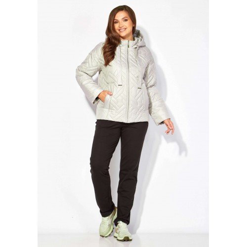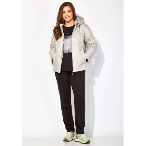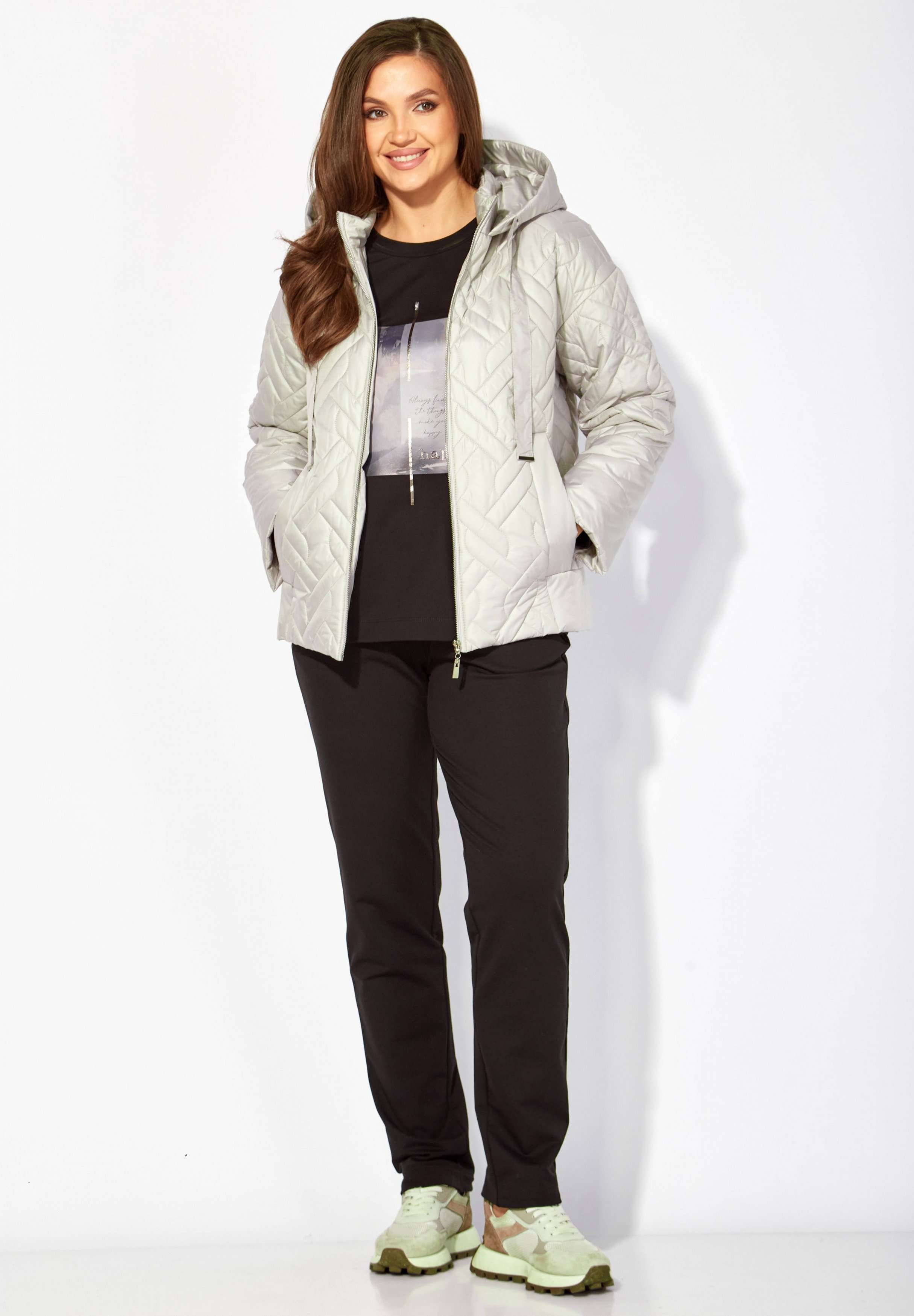 Комплект женский трехпредметный, состоящий из куртки, свитшота и брюк. Куртка женская, прямого силуэта с длинным рукавом. Рукав со спущенной линией плеча и широкой манжетой по низу. Горловина оформлена стойкой и капюшоном с кулисой. Застежка центральная на "молнию" Спереди карманы "листочки" По низу отрезная деталь в виде пояса. Спинка задекорирована отделочной нашивкой.Свитшот прямого силуэта с длинным рукавом. Рукав со спущенной линией плеча, снизу на манжете. По переду и спинке смещенные рельефы. Перед задекорирован выразительным принтом. Вырез горловины круглой формы с подрезной бейкой. Брюки длинные, прямые. По бокам наклонные карманы. Пояс притачной с резинкой по кругу.