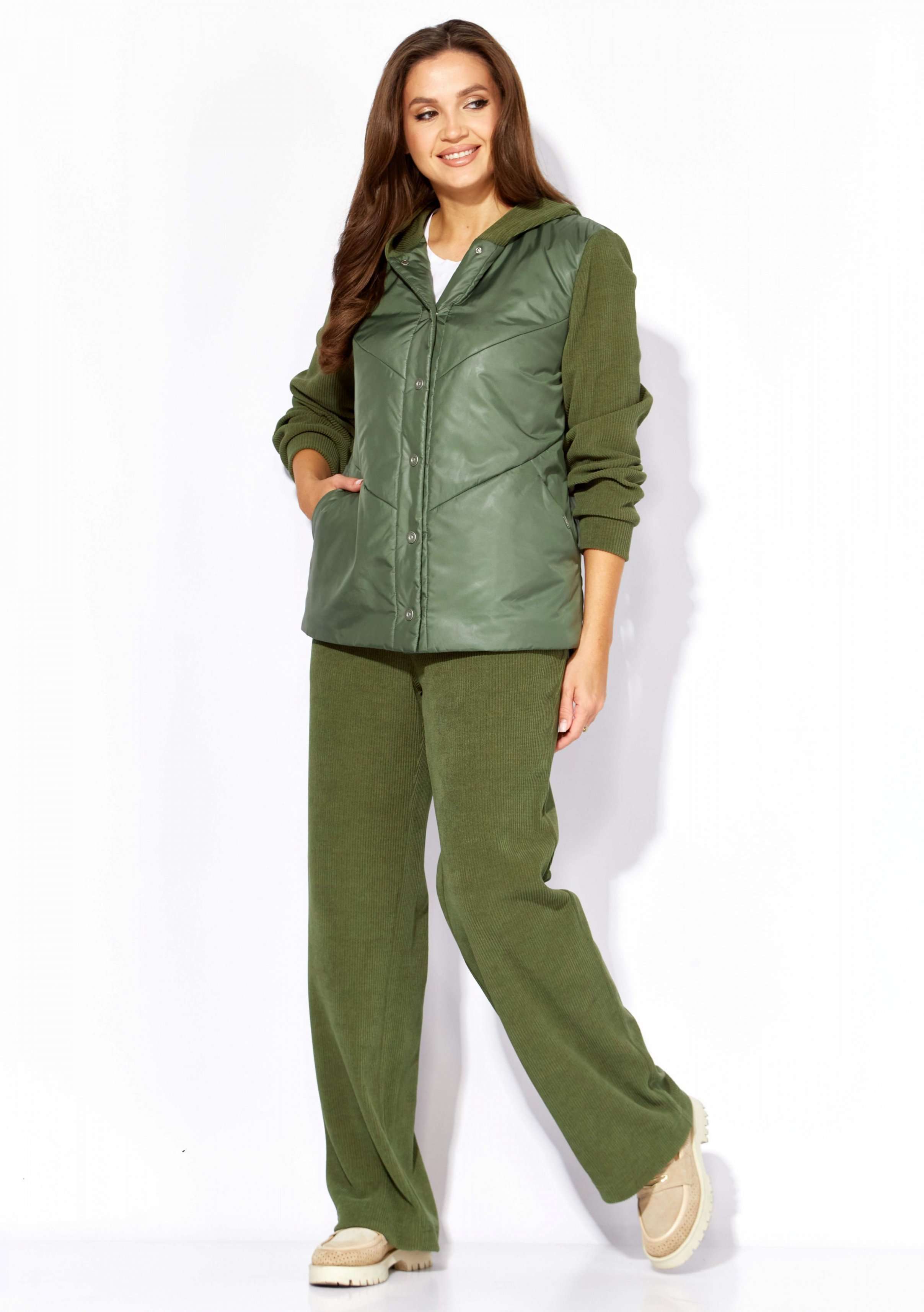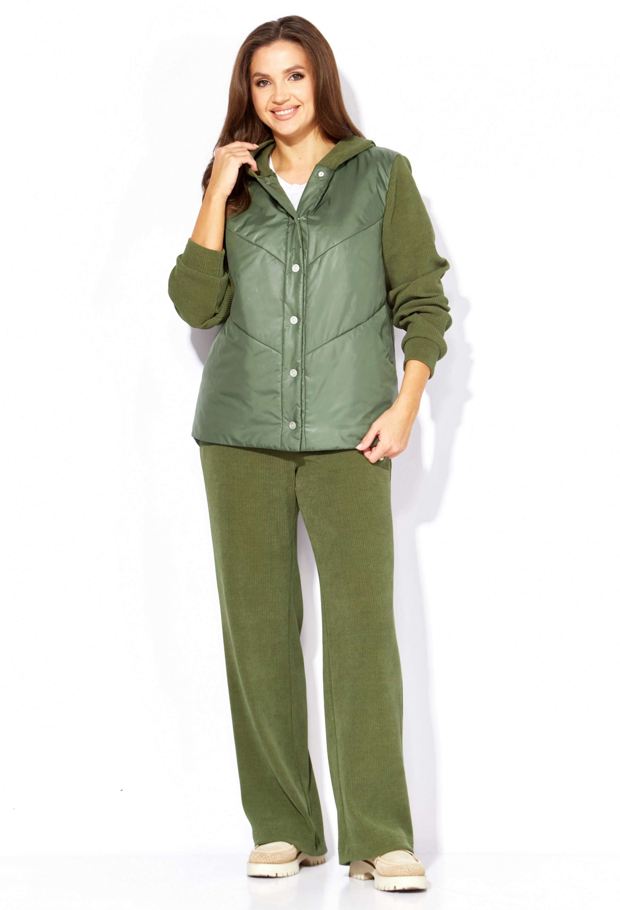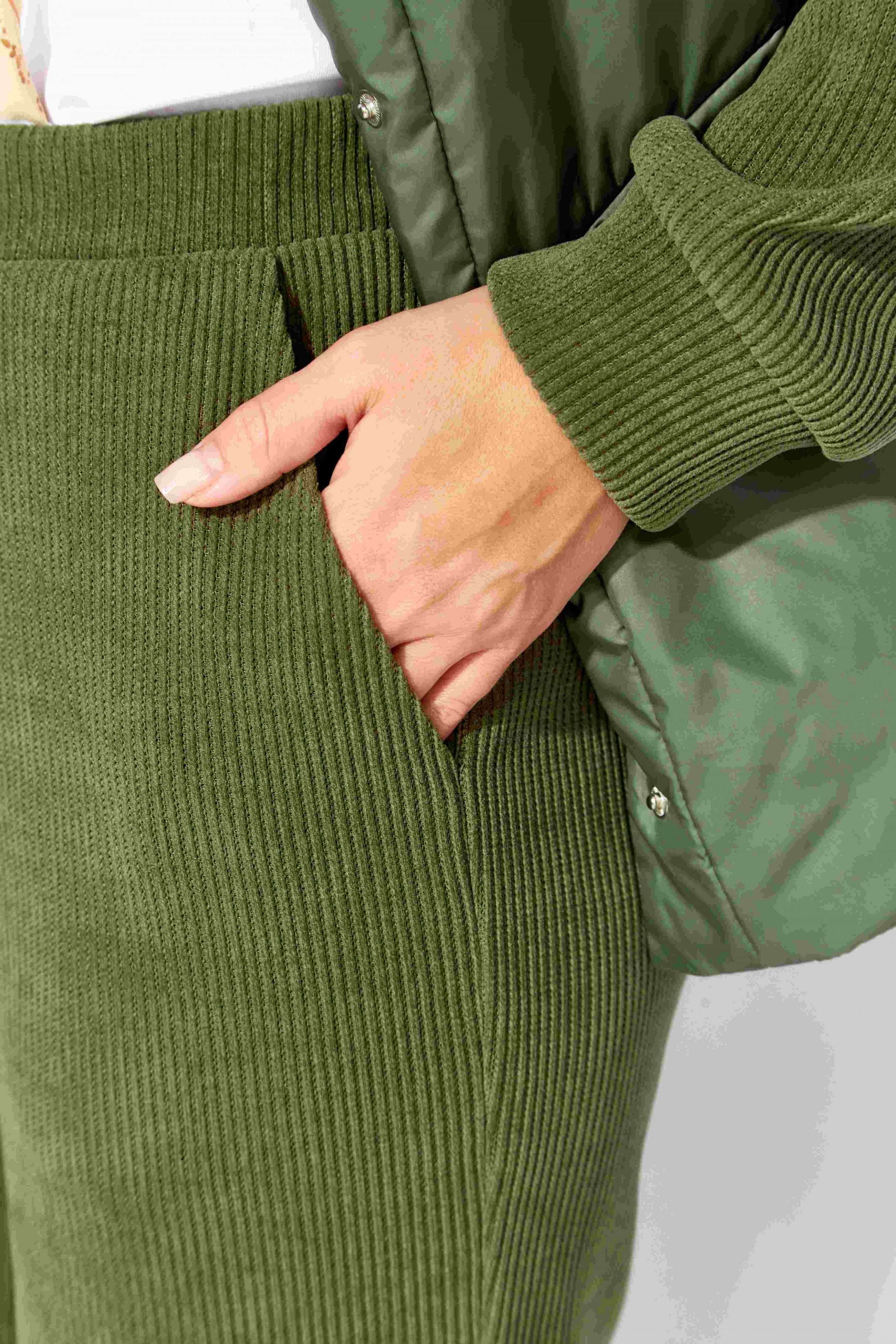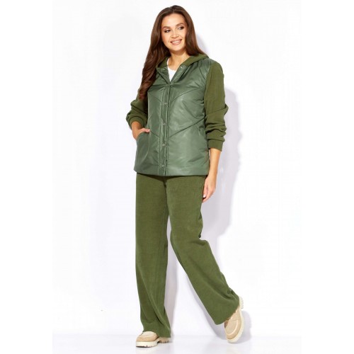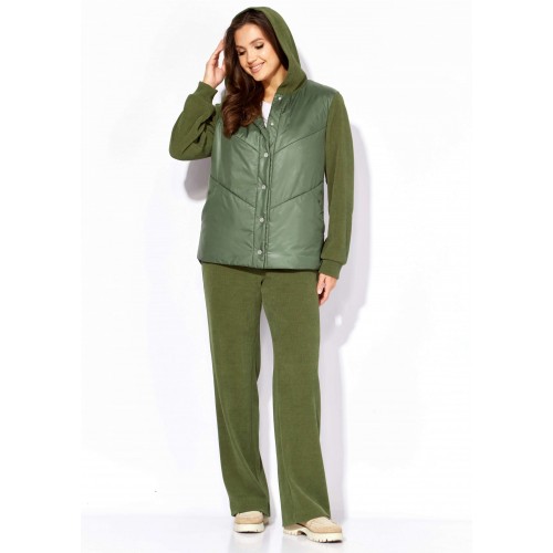 Комплект женский, 2х предметный, состоящий из куртки и брюк, выполнен из двух видов ткани- плащевка на синтепоне и вельвет на трикотажной основе. Куртка прямого силуэта. По переду наклонные рельефы и функциональные карманы. Застежка центральная, с отрезной планкой на кнопки. Рукав длинный, втачной с манжетой по кругу. Горловина оформлена манжетой по низу. Горловина оформлена капюшоном. Спинка с широкой стежкой, чуть удлиненная по низу. Перед спинки на подкладке. Брюки прямые, с карманами по переду. Пояс притачной с резиной по кругу.