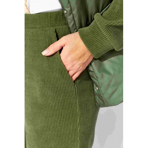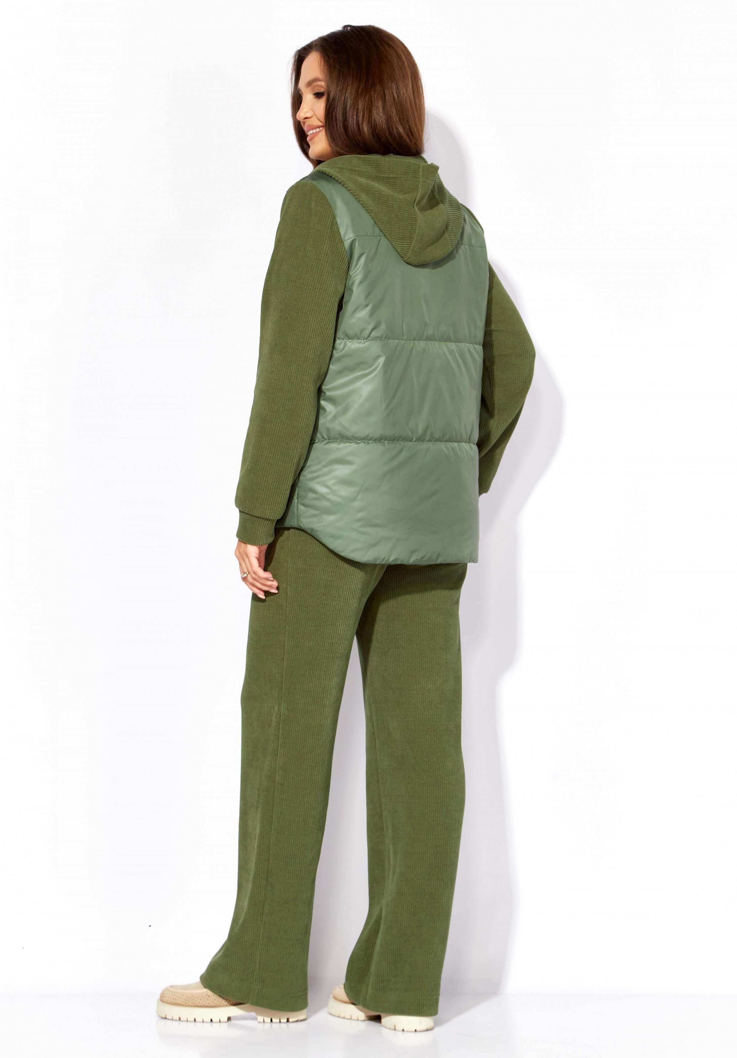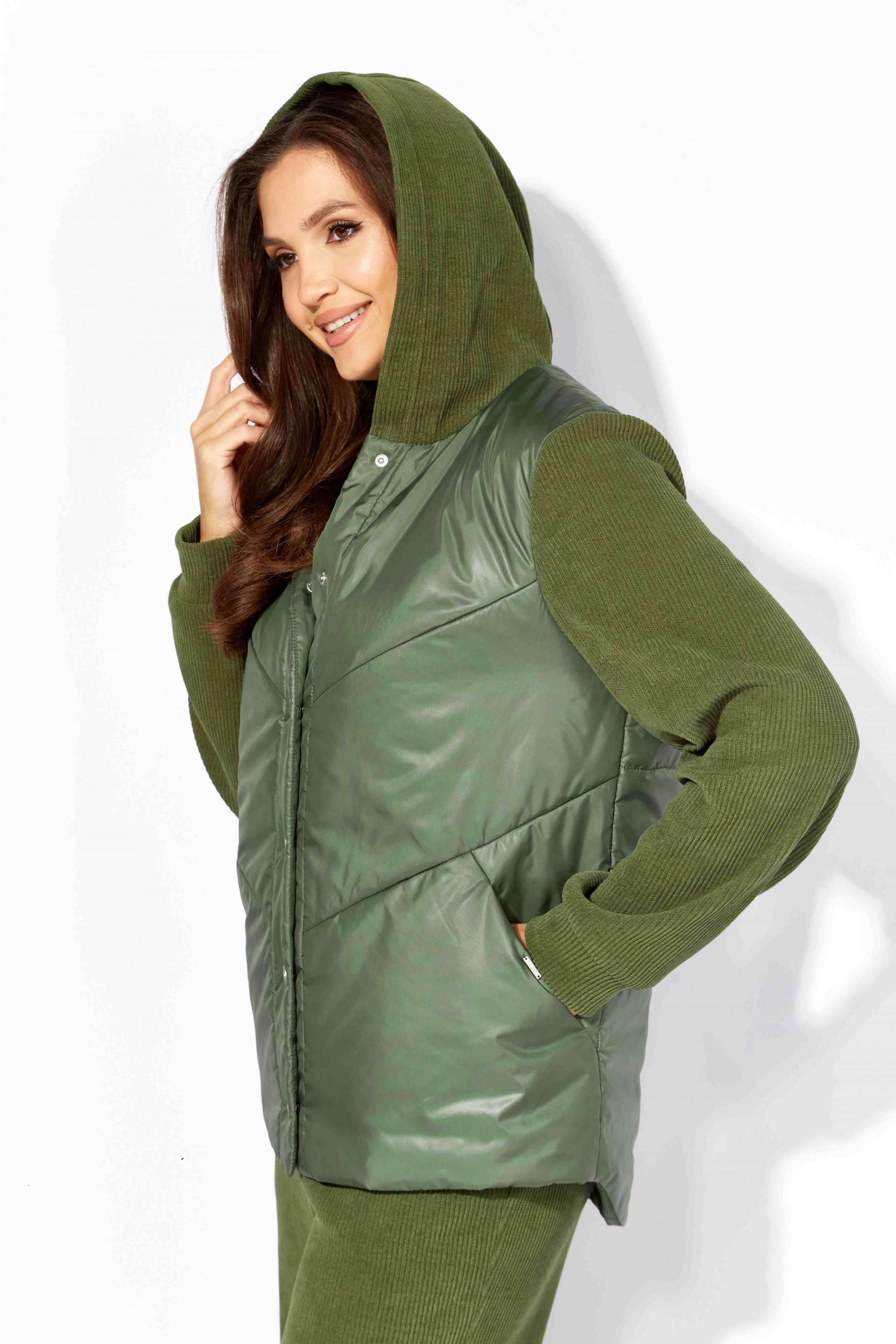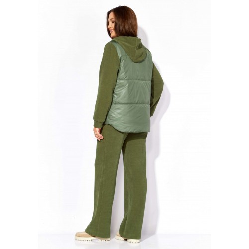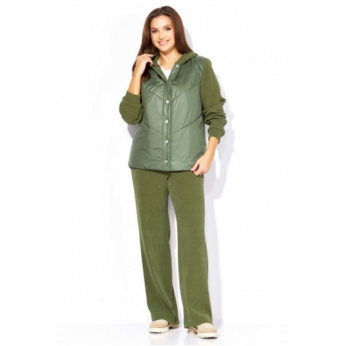 Комплект женский, 2х предметный, состоящий из куртки и брюк, выполнен из двух видов ткани- плащевка на синтепоне и вельвет на трикотажной основе. Куртка прямого силуэта. По переду наклонные рельефы и функциональные карманы. Застежка центральная, с отрезной планкой на кнопки. Рукав длинный, втачной с манжетой по кругу. Горловина оформлена манжетой по низу. Горловина оформлена капюшоном. Спинка с широкой стежкой, чуть удлиненная по низу. Перед спинки на подкладке. Брюки прямые, с карманами по переду. Пояс притачной с резиной по кругу.