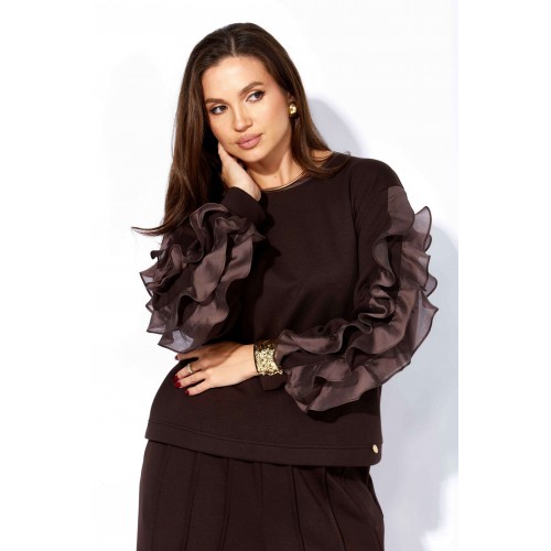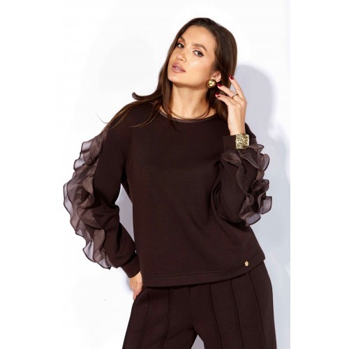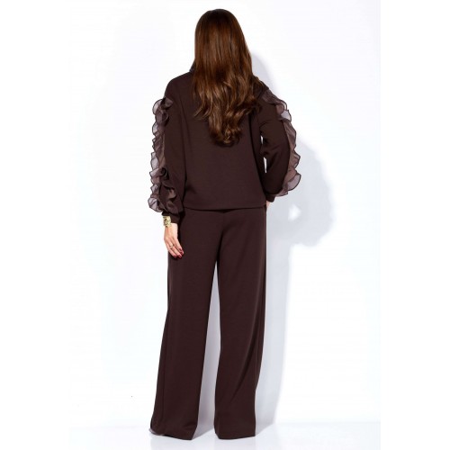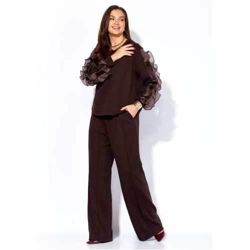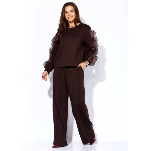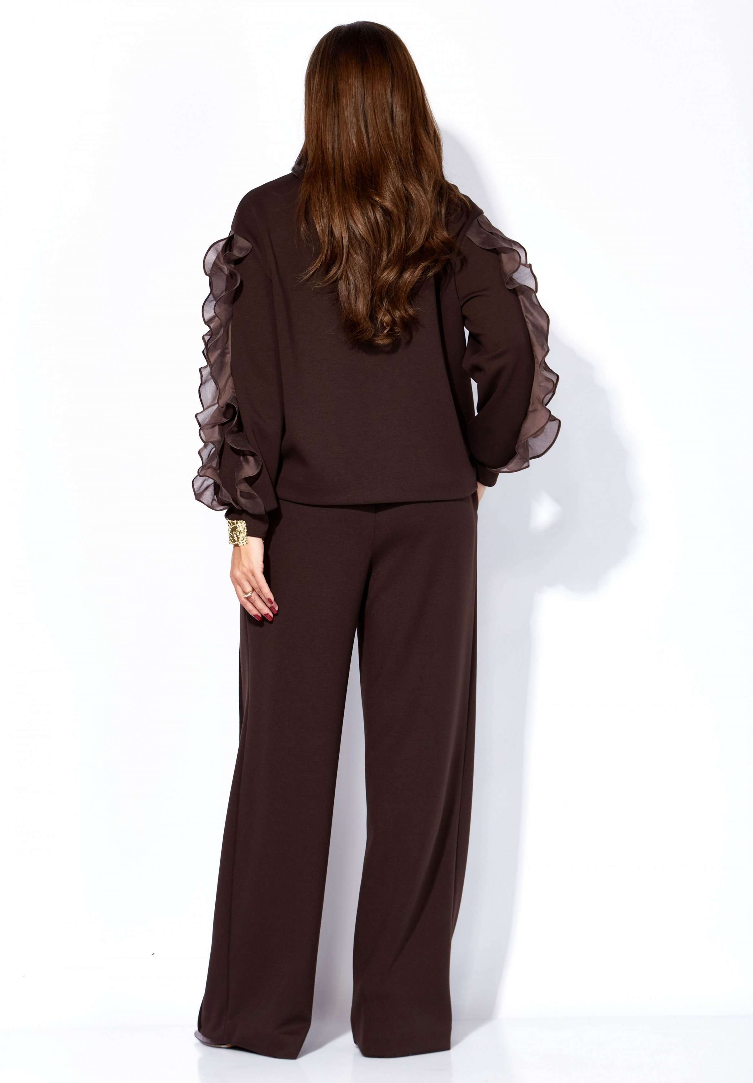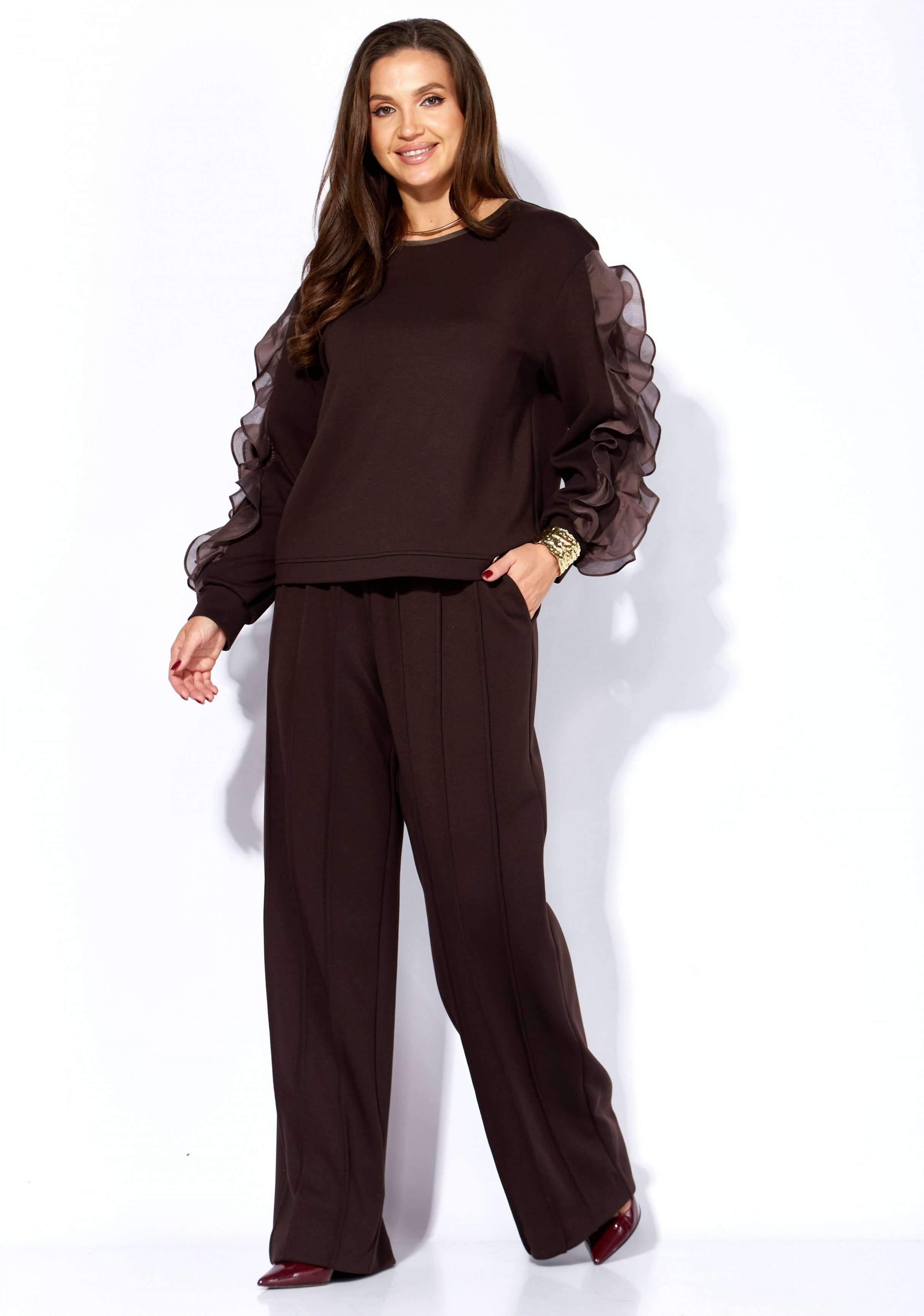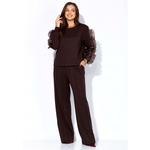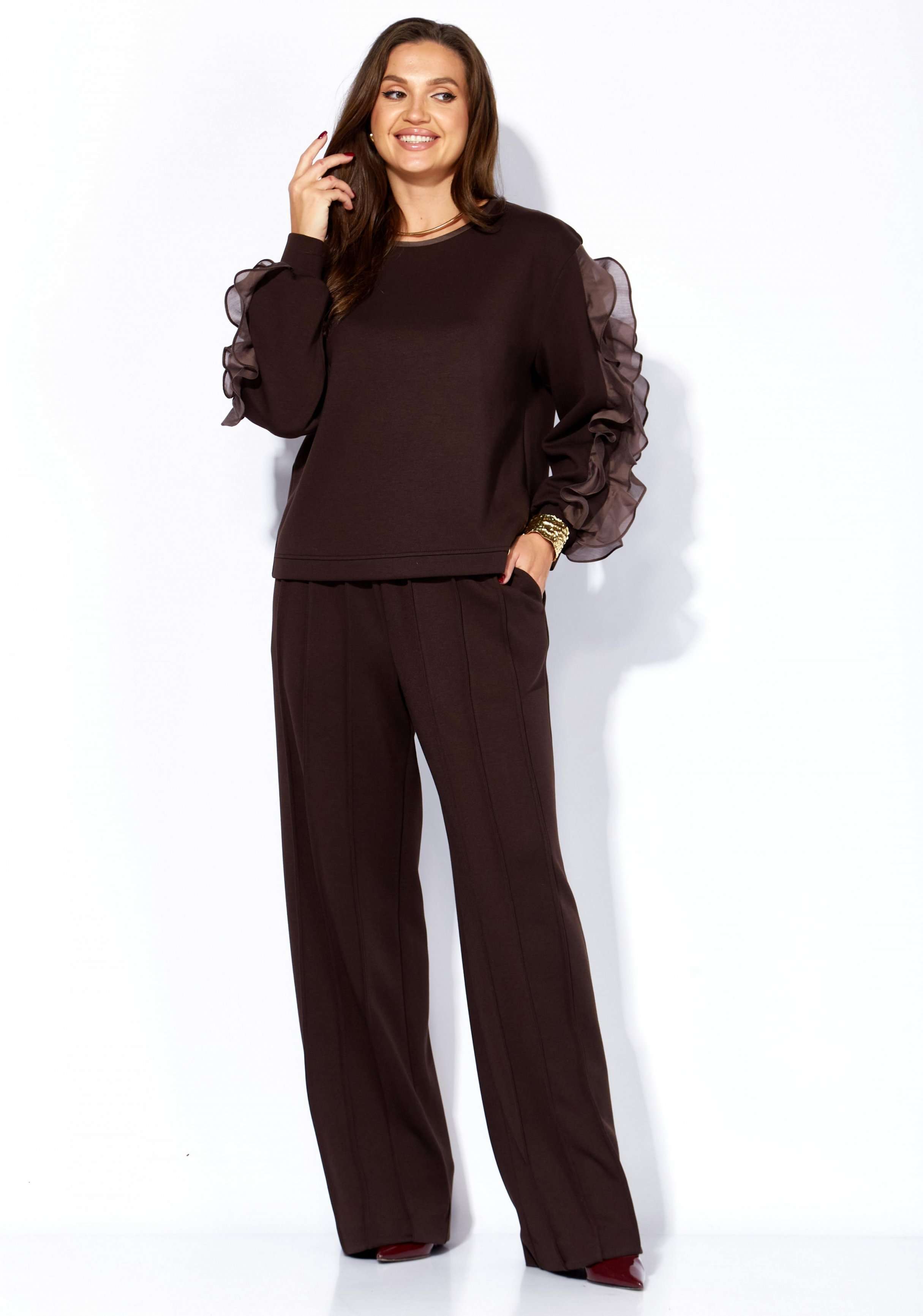 Комплект женский, 2х предметный, состоящий из джемпера и брюк, из трикотажного полотна. Джемпер прямого силуэта, с длинным рукавом. Рукава с чуть спущенной линией плеча, по низу на манжете, задекорирован по центру тремя рядами рюш из отделочной ткани. Вырез горловины круглой формы, с отделочной бейкой по переду. По низу переда подрезная планка. Спинка без особенностей. Брюки прямые, широкие. По переду по три ряда широких, застроченных "на ребро" рельефов и функциональные карманы. Пояс притачной с резинкой по кругу.