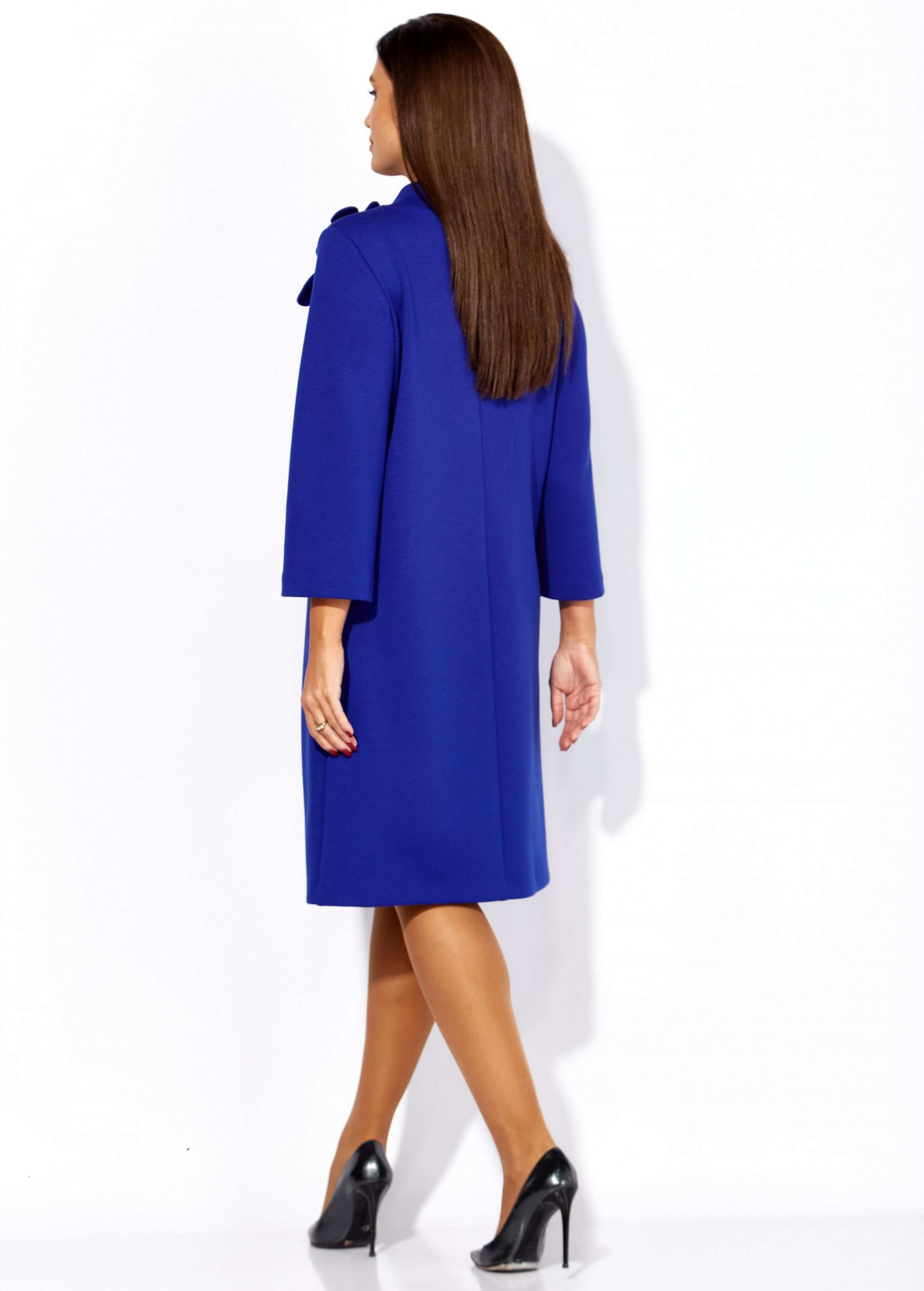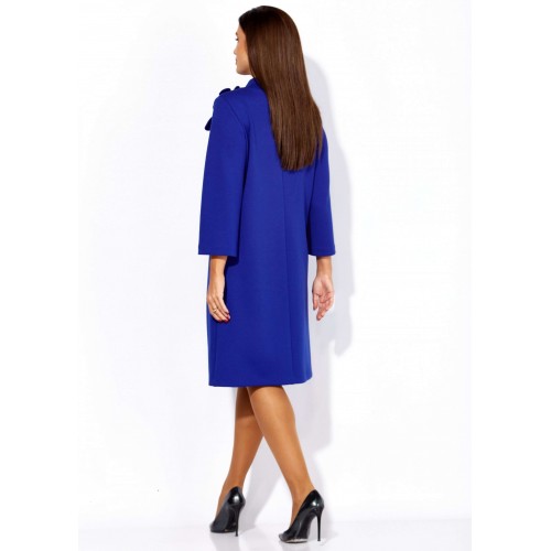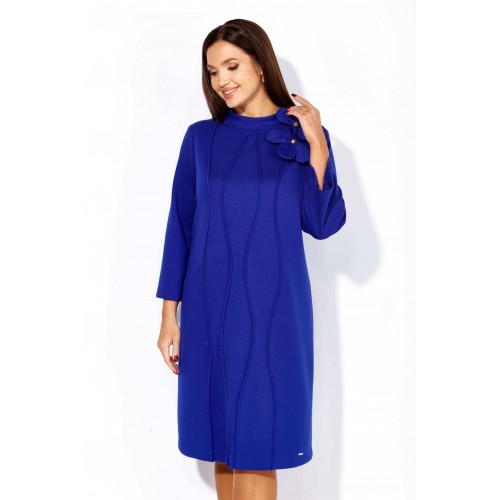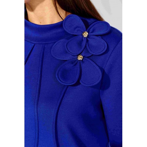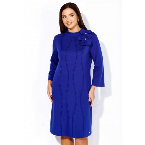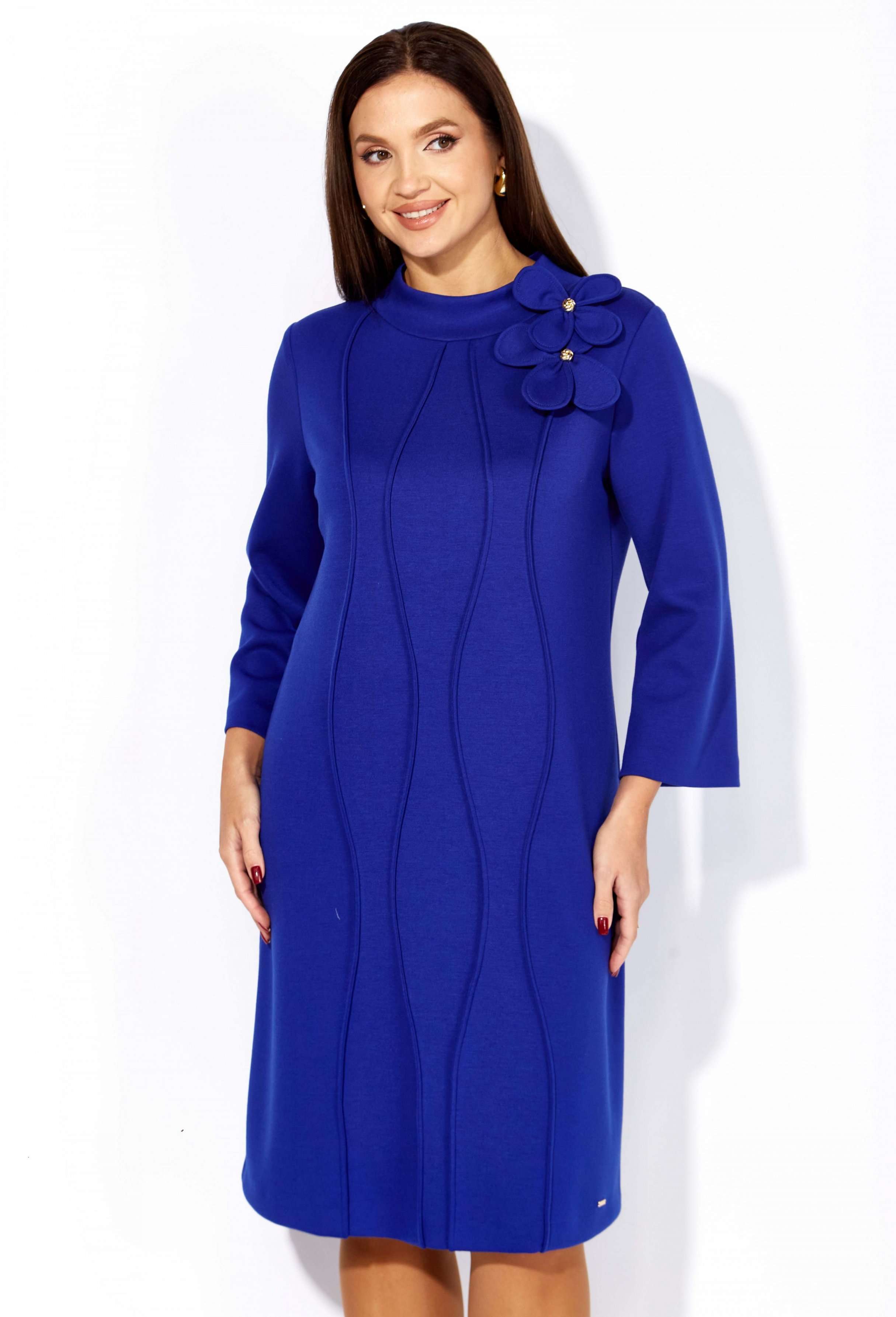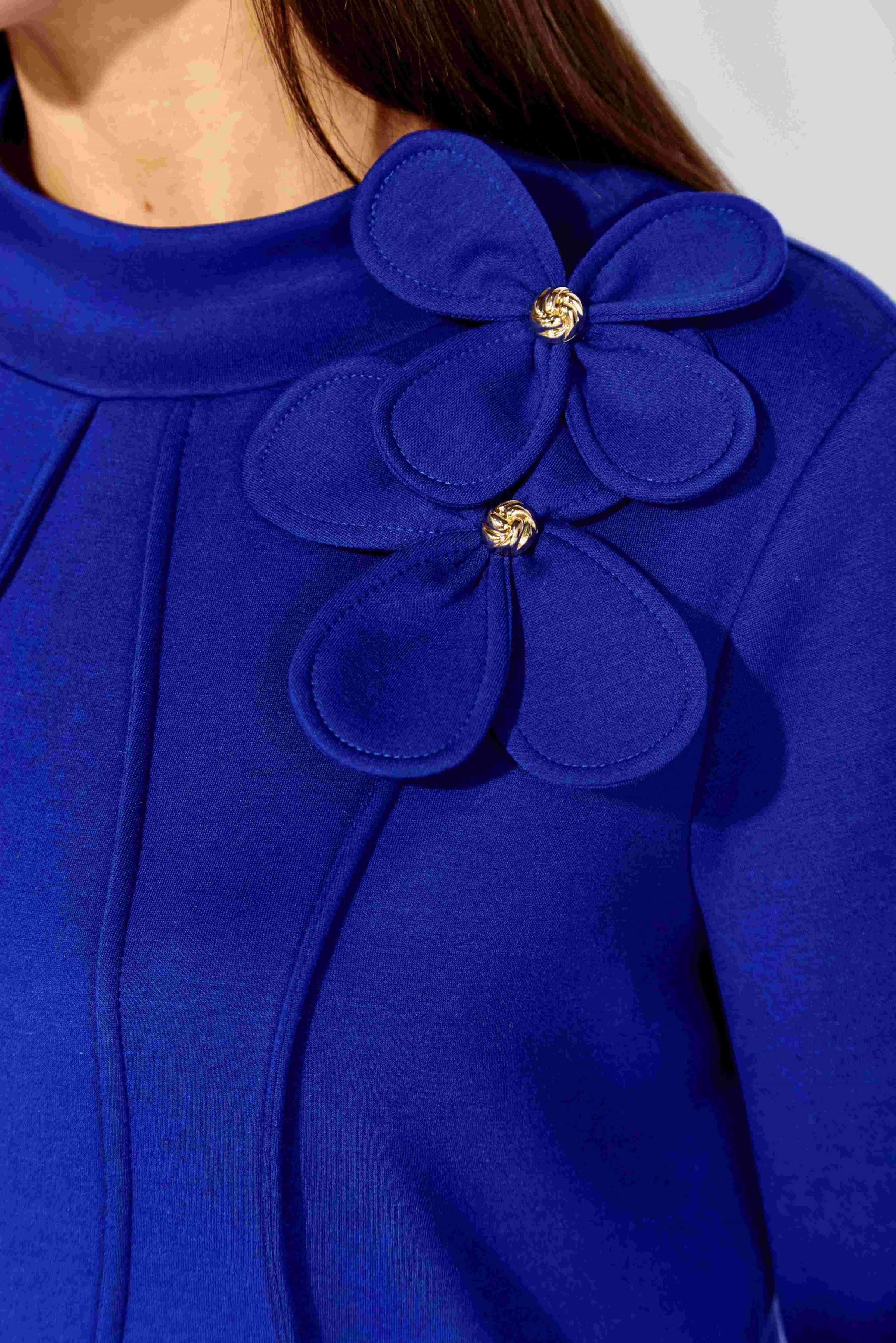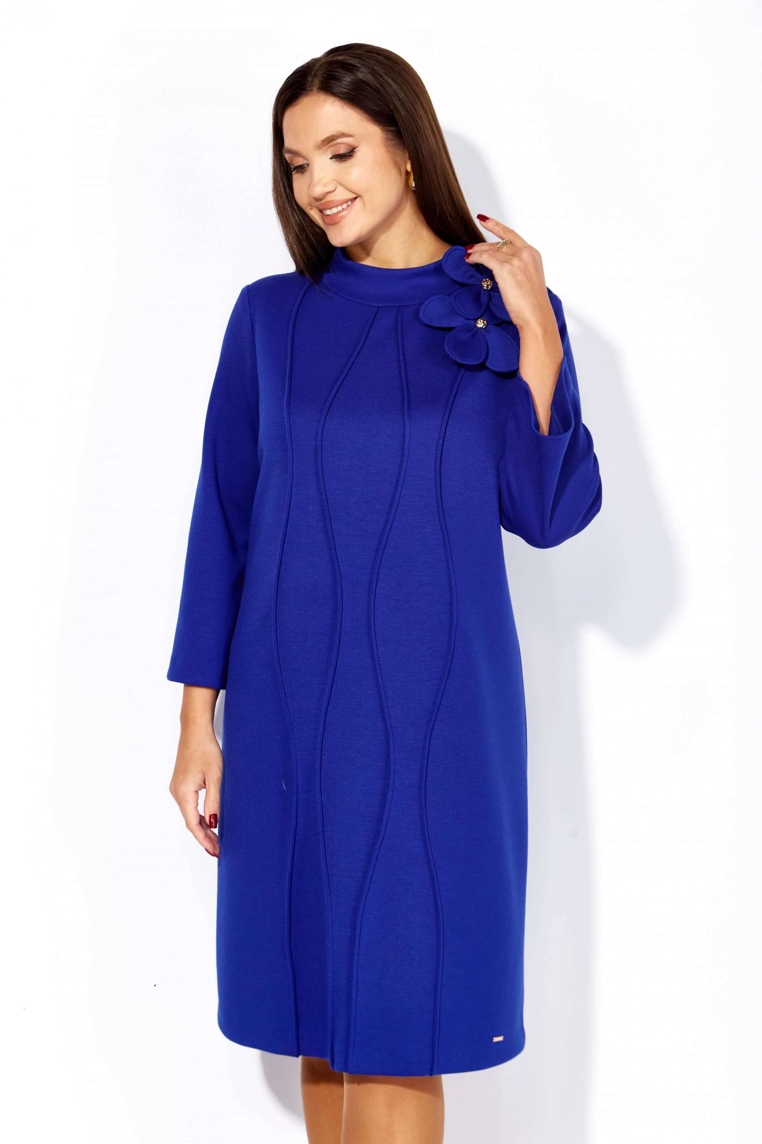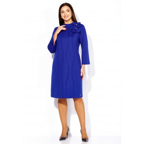 Платье женское, чуть А-силуэта, с втачным рукавом, длинной 7/8. По центу переда объемные , фигурные рельефы. Горловина оформлена небольшой мягкой стойкой. Декором служат съемные цветки-броши. По низу платья отделочная нашивка. Спинка со средним швом. Платье изготовлено из трикотажного полотна "тенсел".
