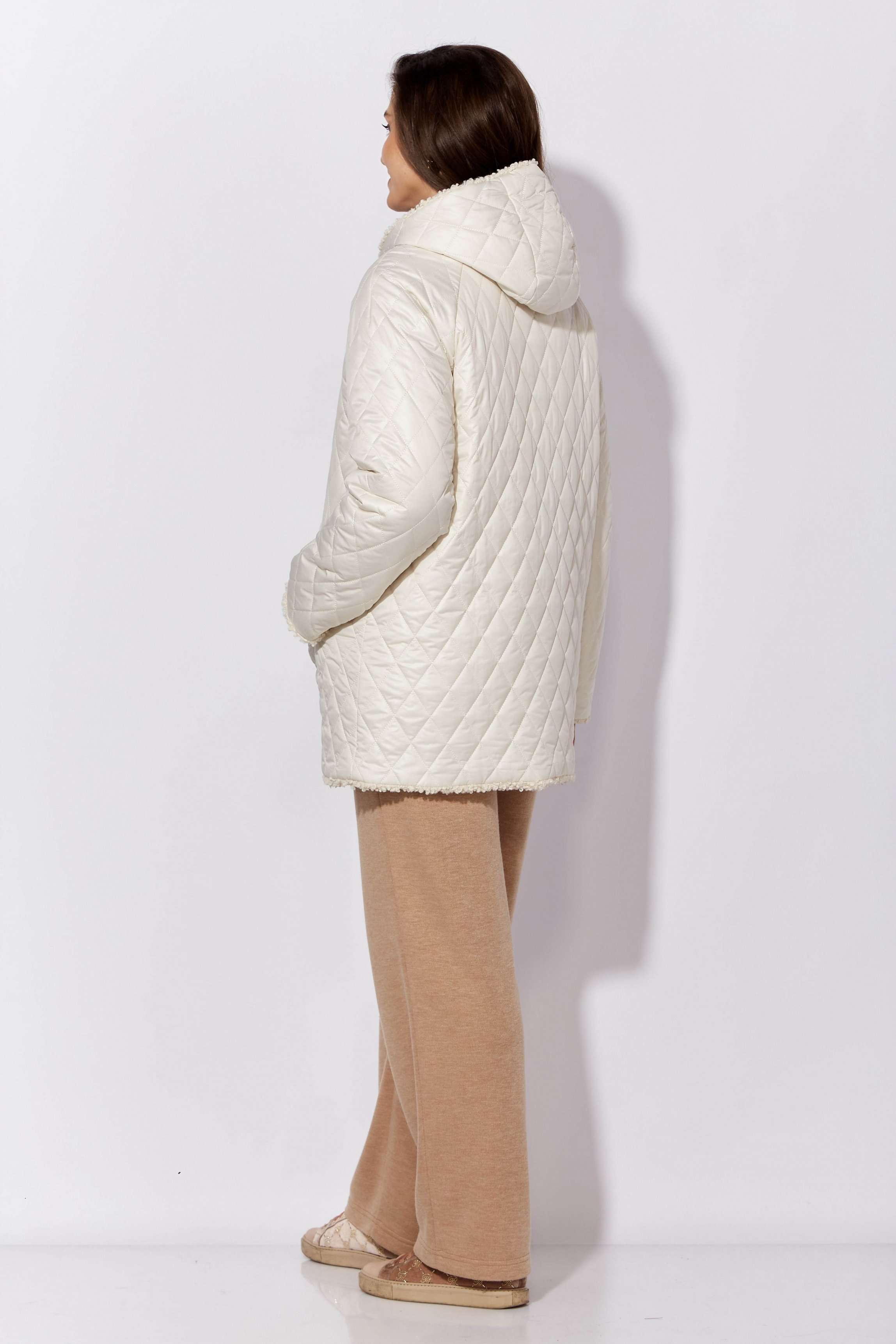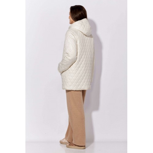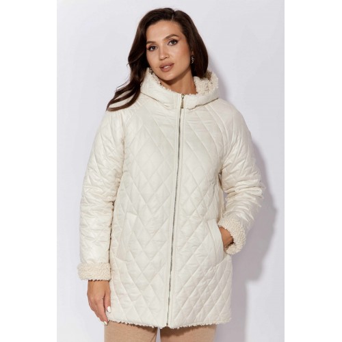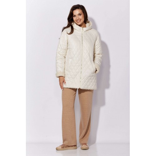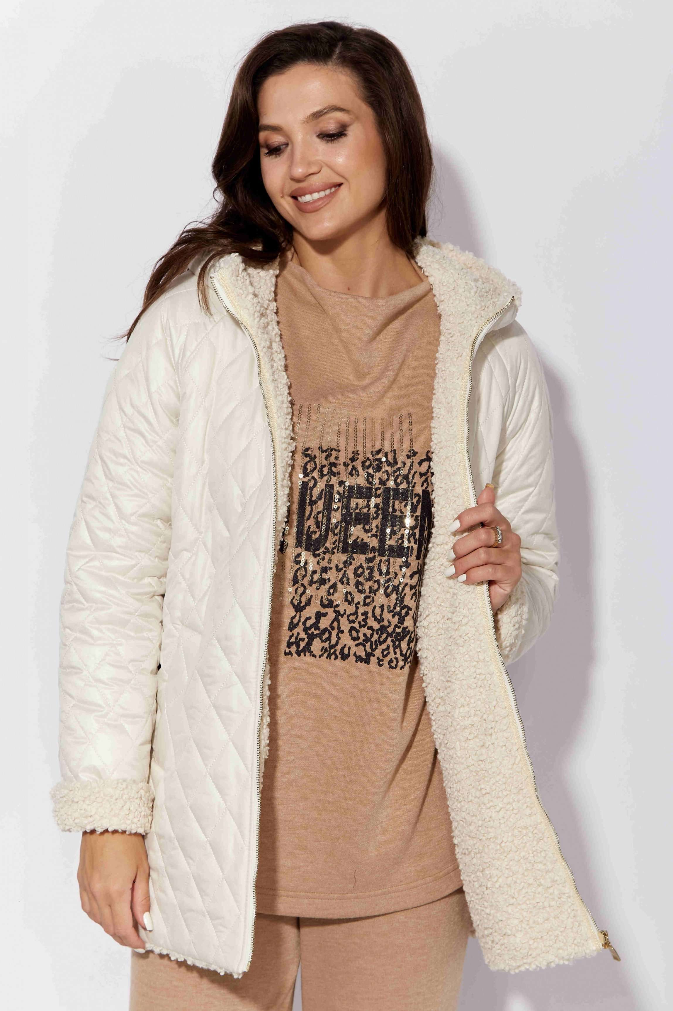 Куртка женская, демисезонная. Верх куртки - плащевка, стеганная на синтепоне. Подкладка - экомех "барашек". Куртка прямого силуэта с длинным рукавом "реглан". Длина рукава может регулироваться отворотом. По переду центральная застежка на "молнию" и прорезные, функциональные карманы. Горловина оформлена капюшоном-стойкой по переду.