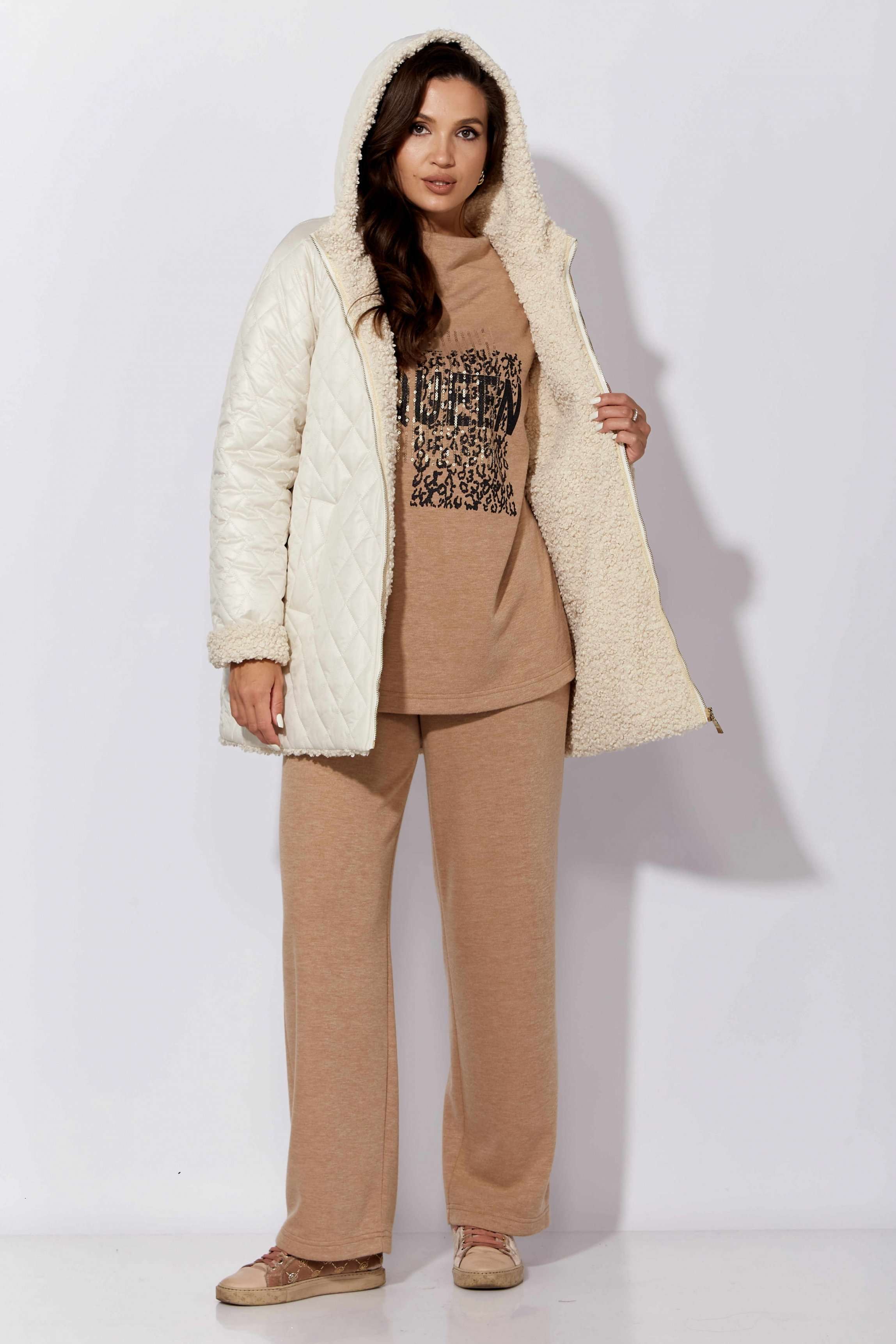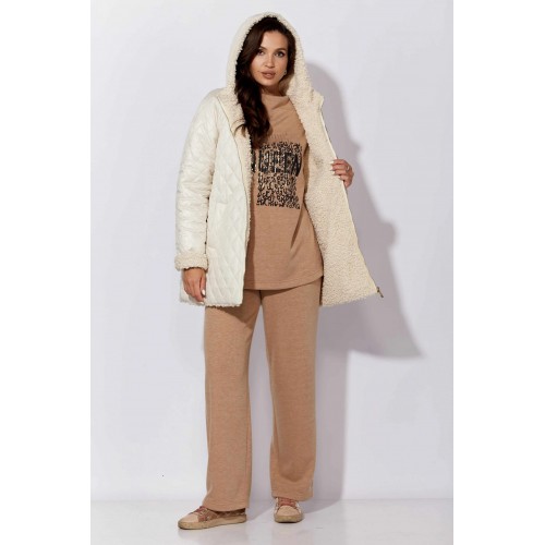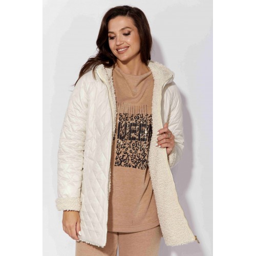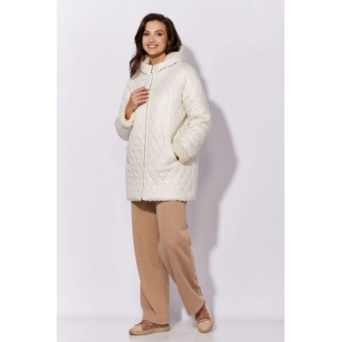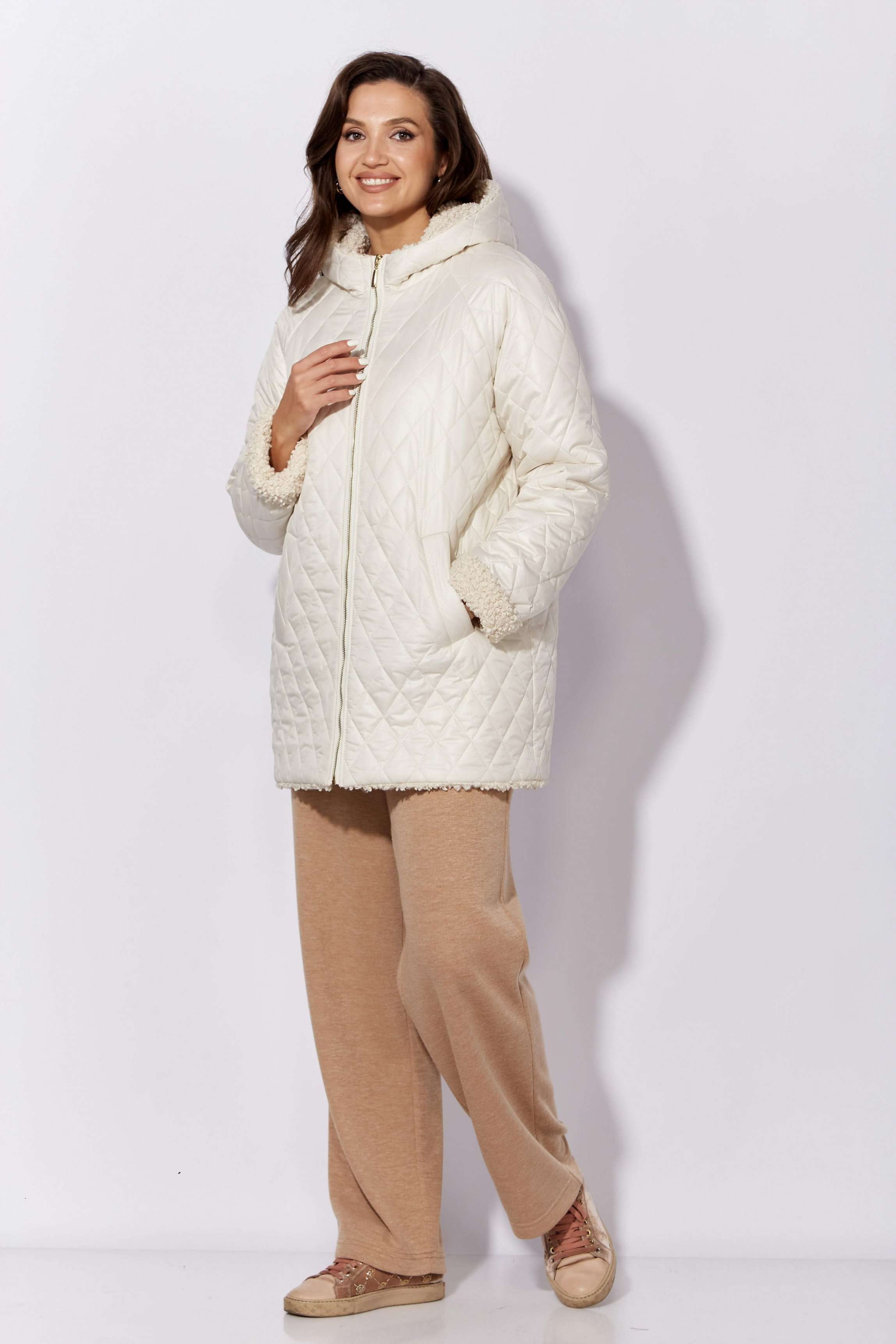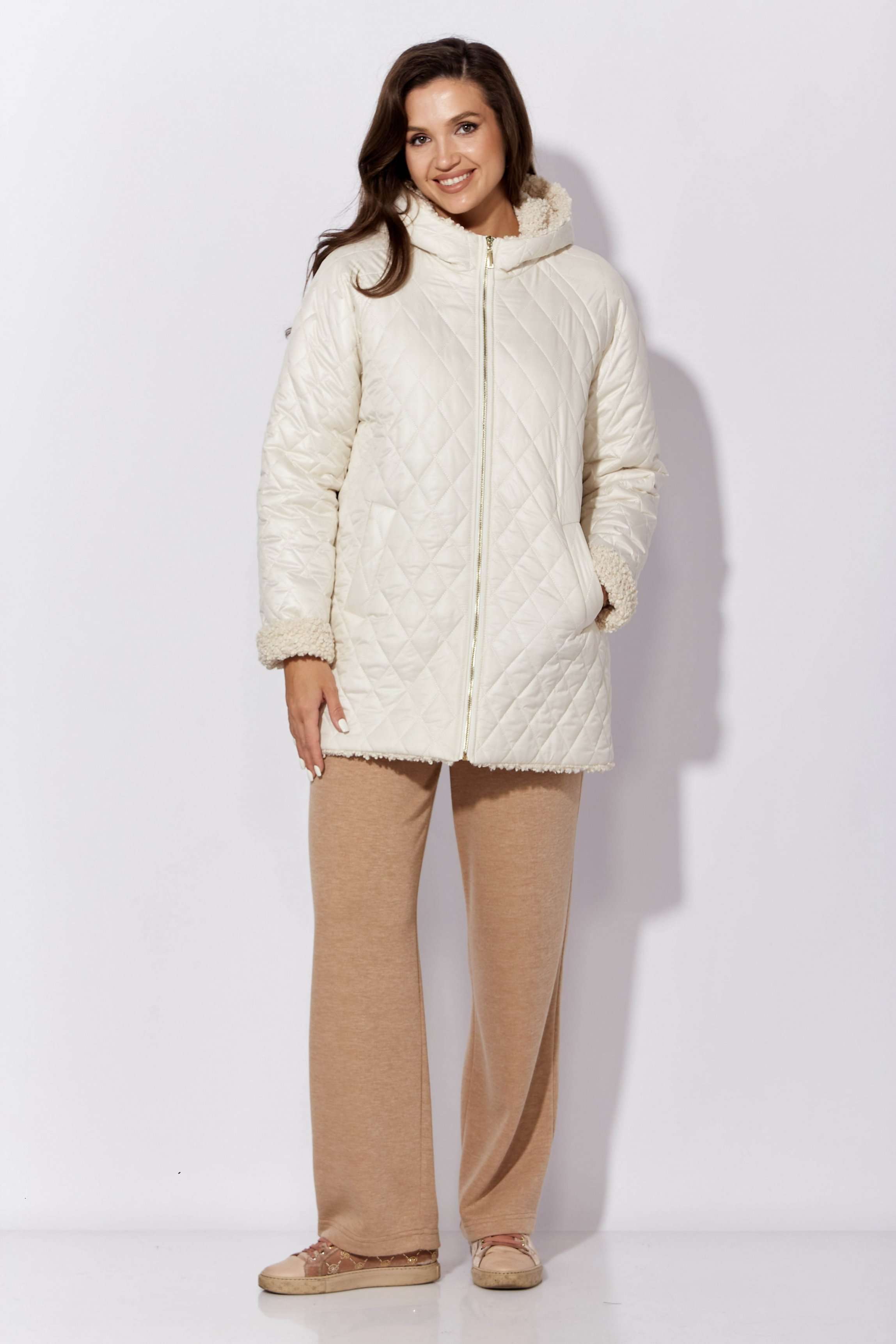 Куртка женская, демисезонная. Верх куртки - плащевка, стеганная на синтепоне. Подкладка - экомех "барашек". Куртка прямого силуэта с длинным рукавом "реглан". Длина рукава может регулироваться отворотом. По переду центральная застежка на "молнию" и прорезные, функциональные карманы. Горловина оформлена капюшоном-стойкой по переду.