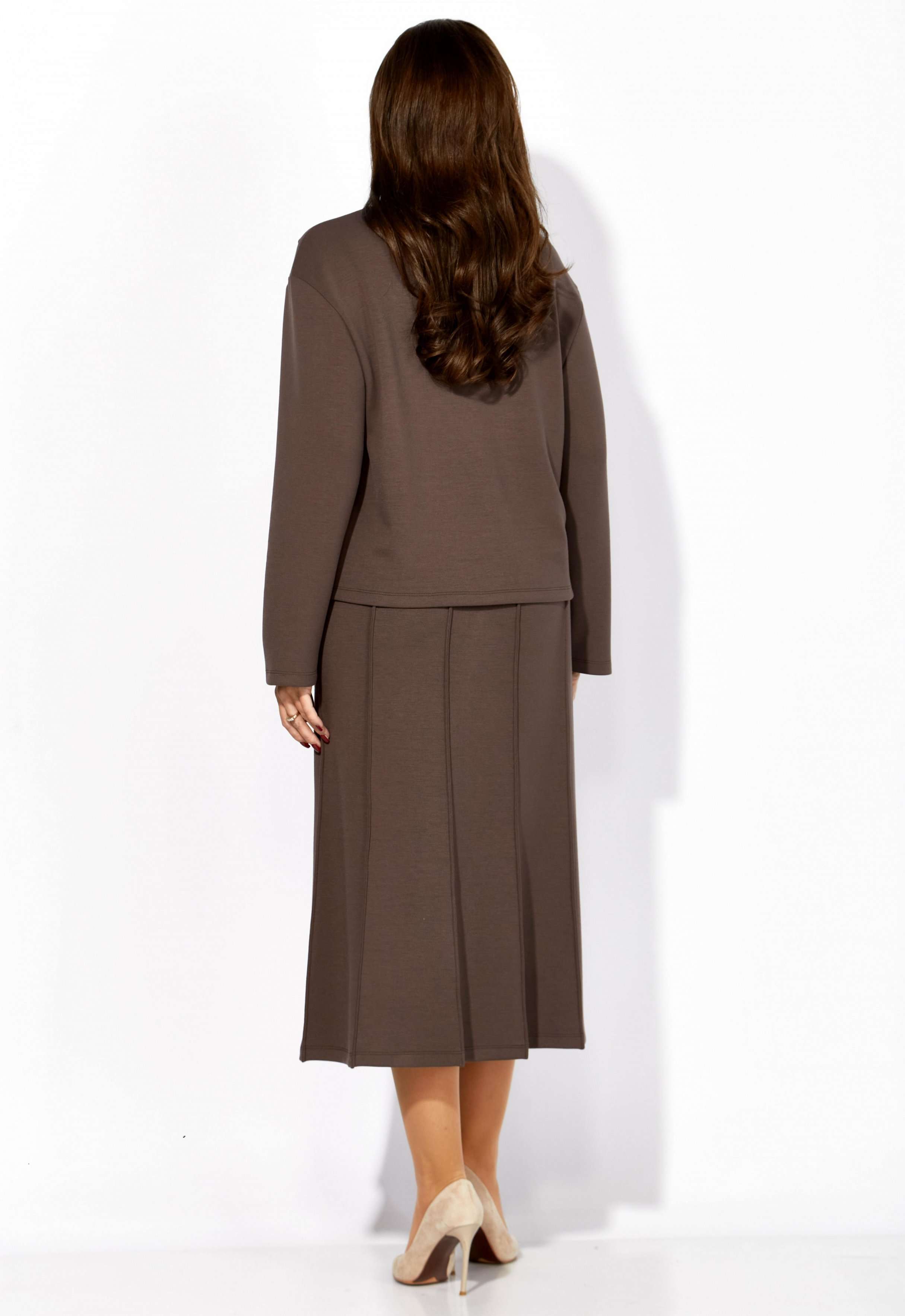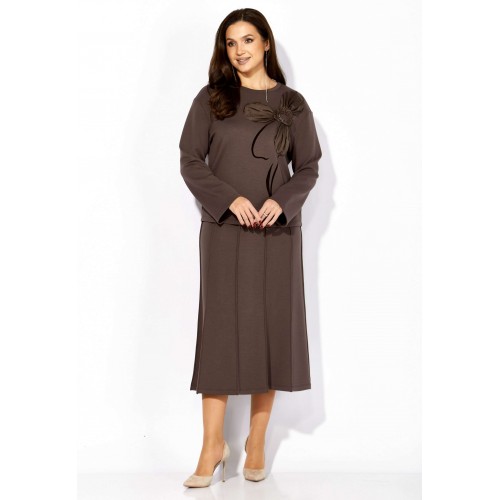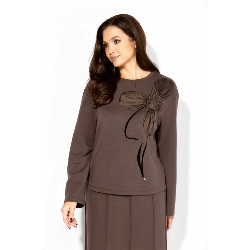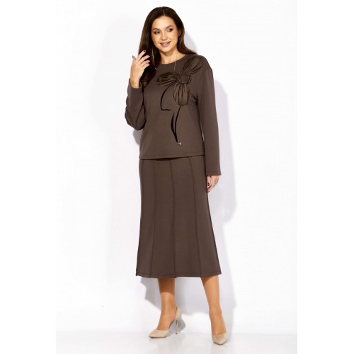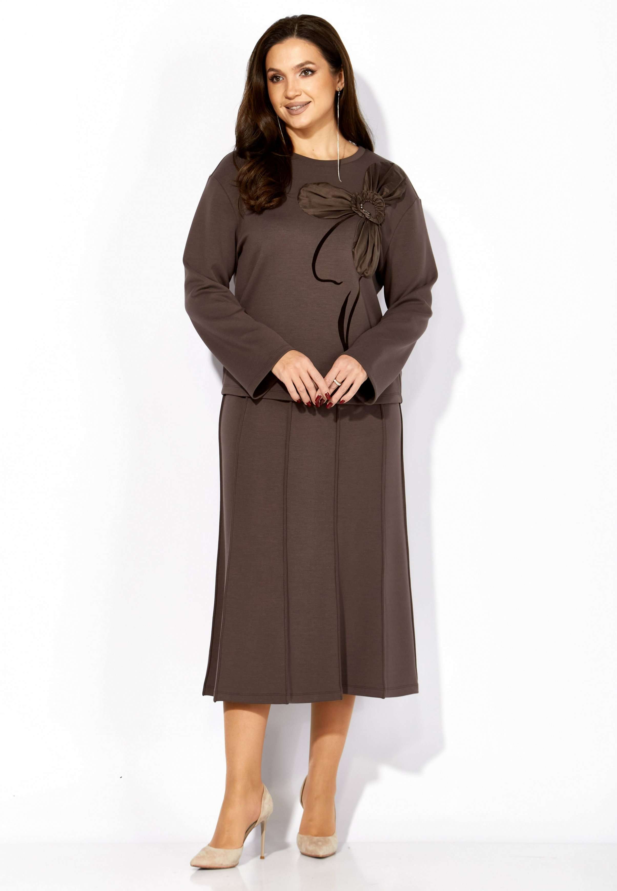 Комплект женский, 2х предметный, из трикотажного полотна "ТЕНСЕЛ", состоящий из джемпера и юбки. Джемпер прямого силуэта с длинным рукавом. Рукав со спущенной линией плеча. Вырез горловины круглой формы с подрезной бейкой. Перед акцентирован принтом и декоративным цветком из отделочной ткани. Юбка чуть расширенная к низу , состоит из десяти клиньев, застроченных на "ребро" в виде рельефов. Пояс притачной с резинкой по кругу.