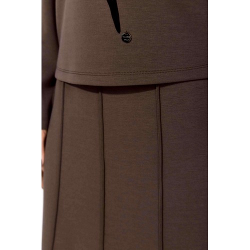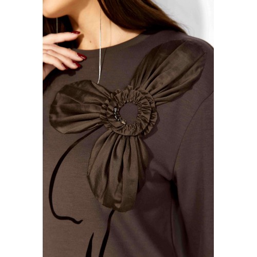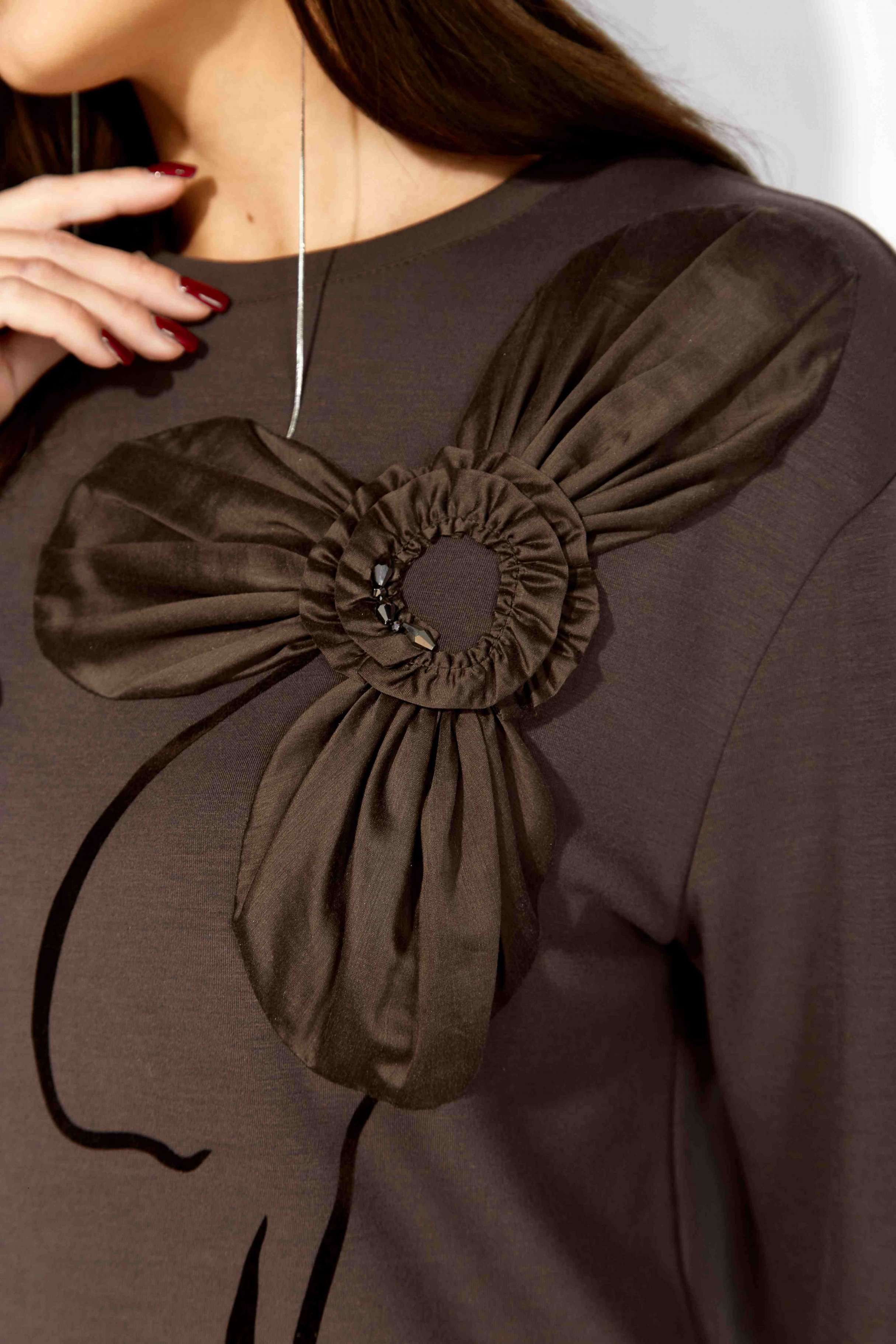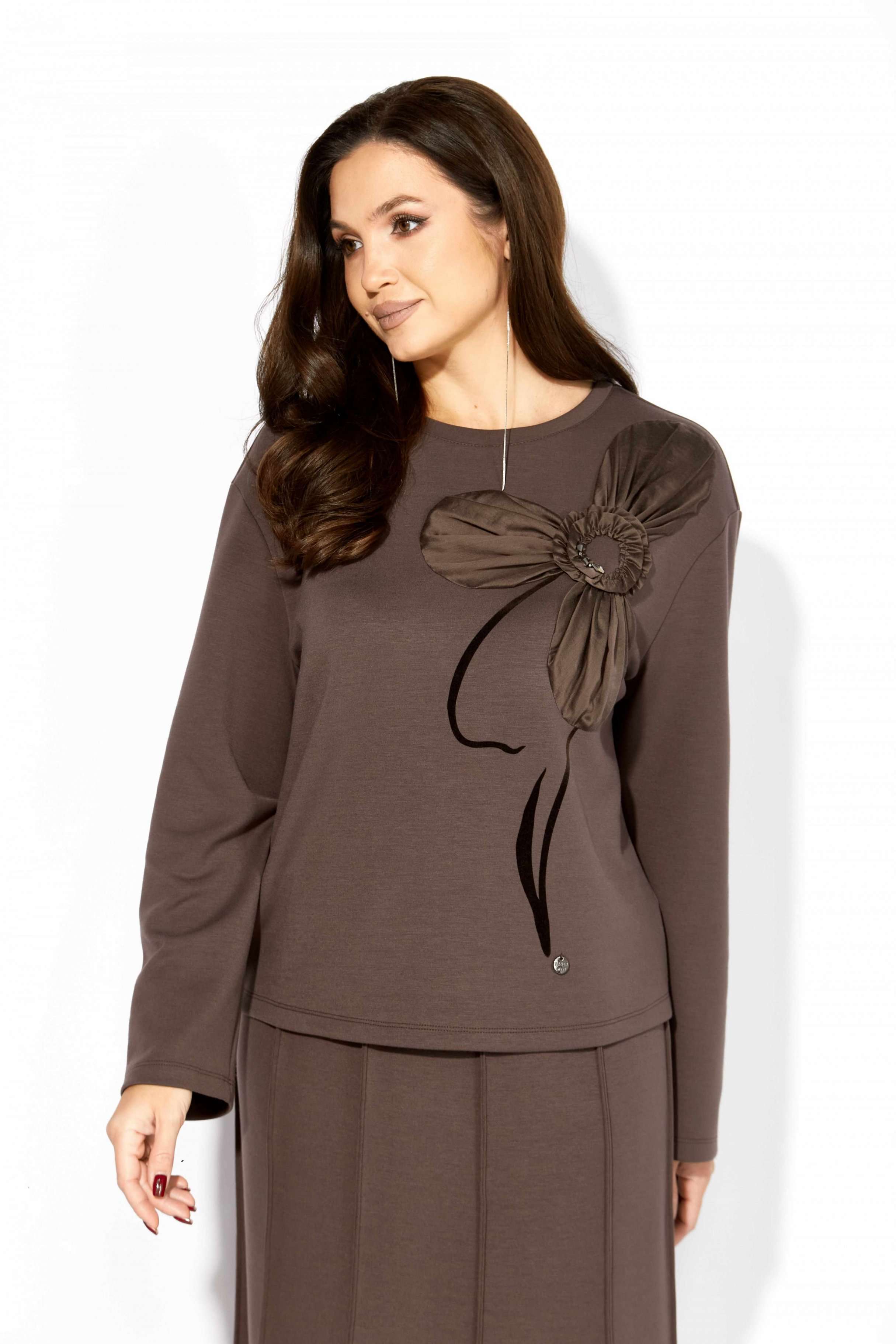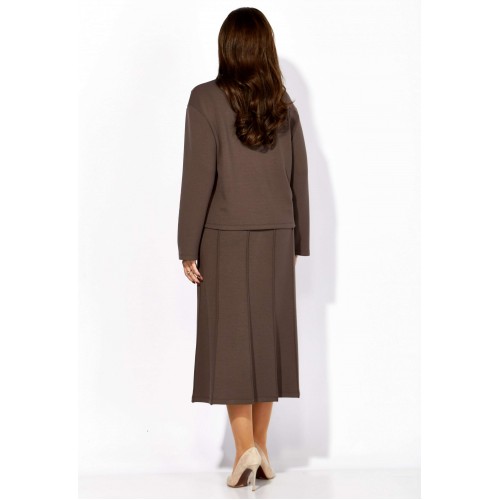 Комплект женский, 2х предметный, из трикотажного полотна "ТЕНСЕЛ", состоящий из джемпера и юбки. Джемпер прямого силуэта с длинным рукавом. Рукав со спущенной линией плеча. Вырез горловины круглой формы с подрезной бейкой. Перед акцентирован принтом и декоративным цветком из отделочной ткани. Юбка чуть расширенная к низу , состоит из десяти клиньев, застроченных на "ребро" в виде рельефов. Пояс притачной с резинкой по кругу.