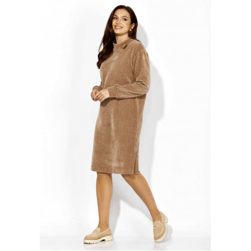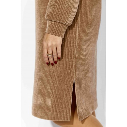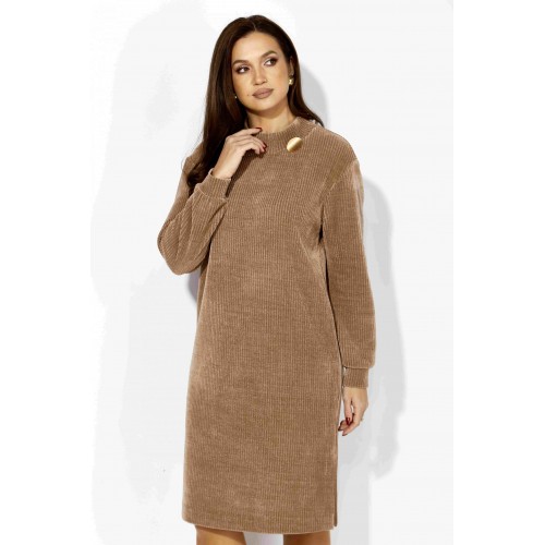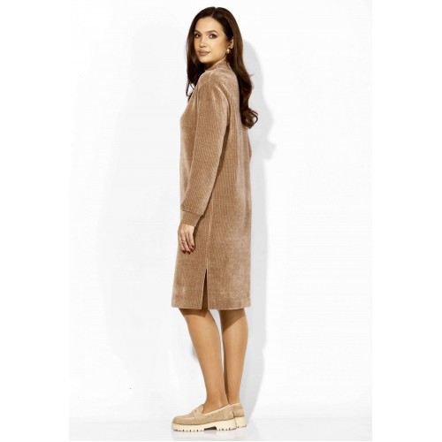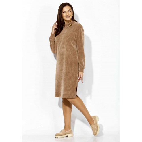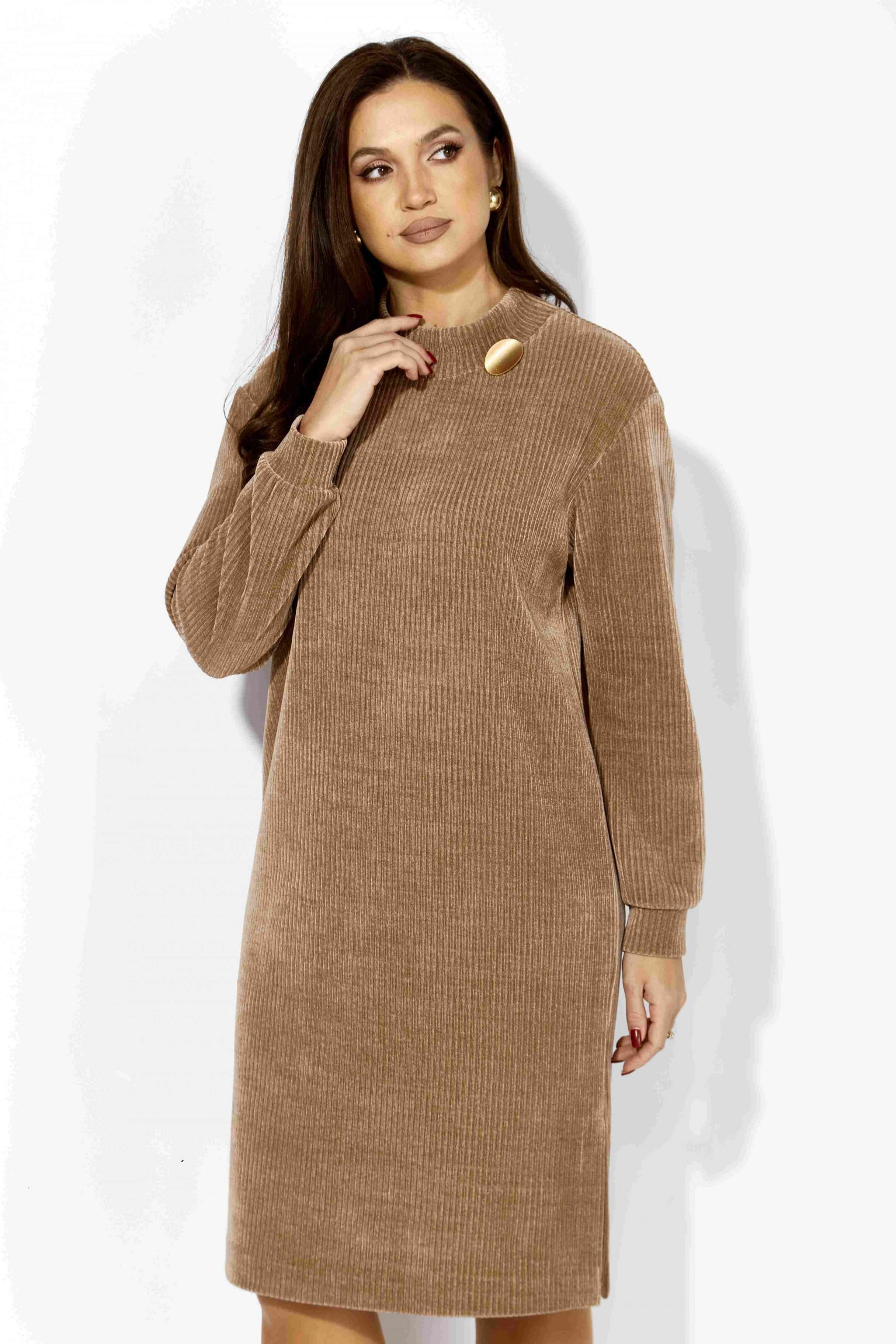 Платье женское, прямого силуэта с длинным рукавом. Рукав со спущенной линией плеча, по низу на манжете. Горловина оформлена высокой, мягкой стойкой. По боку разрез, акцентирован декоративной сточкой. Спинка без особенностей.