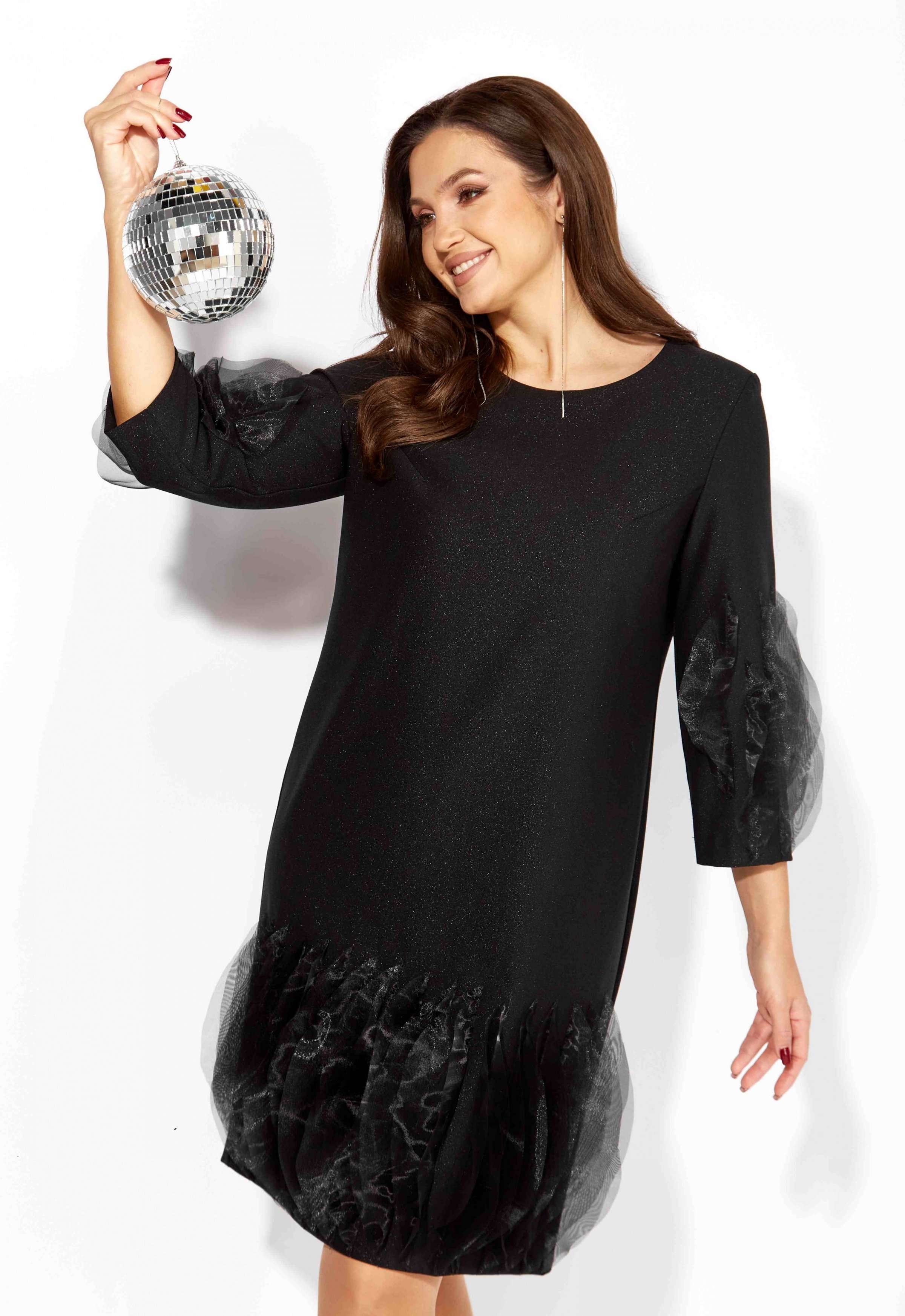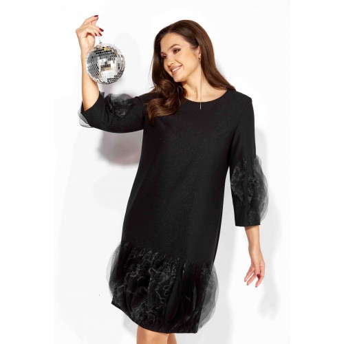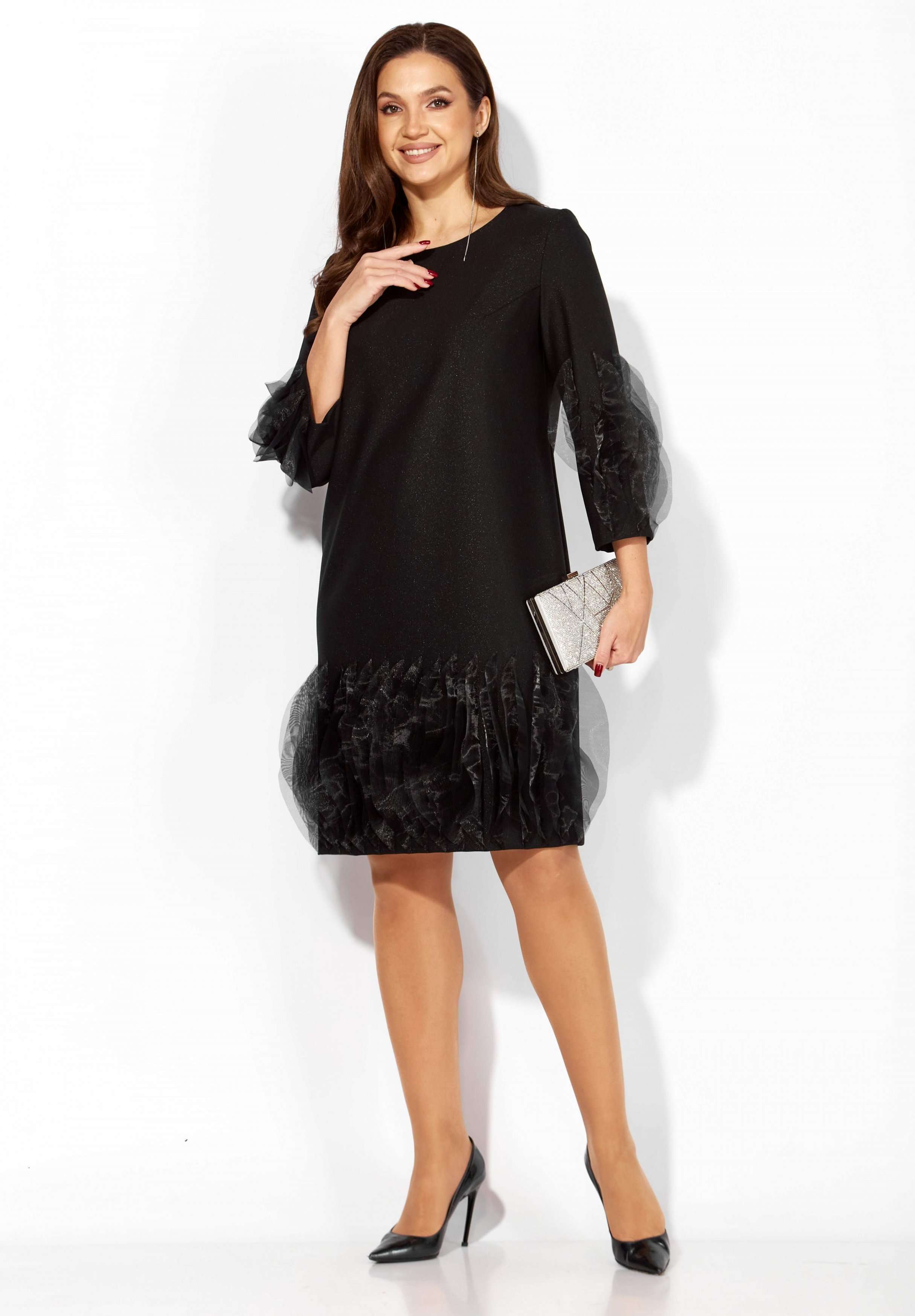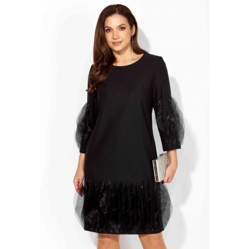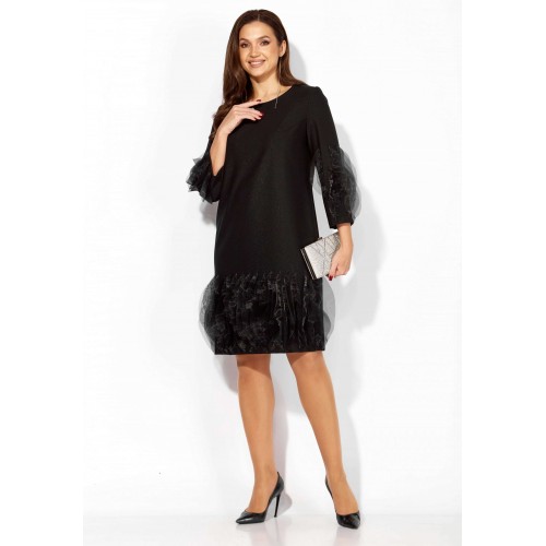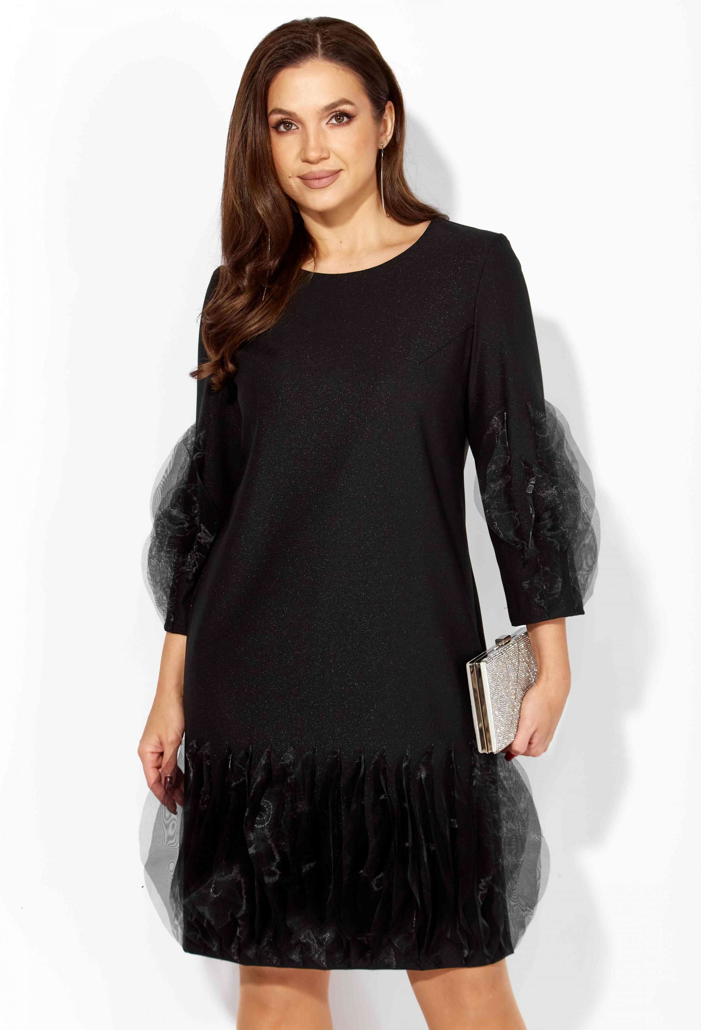 Платье женское, прямого силуэта, выполнено из ткани поливискоза "SHANE" со стрейчем. По переду нагрудные вытачки из пройм. Рукав втачной, длинной 3/4. Низ платья по переду и нижняя часть рукава задекорированы фантазийными элементами ткани из органзы. Вырез горловины круглой формы. По спинке шов и застежка на потайную тесьму "молния".