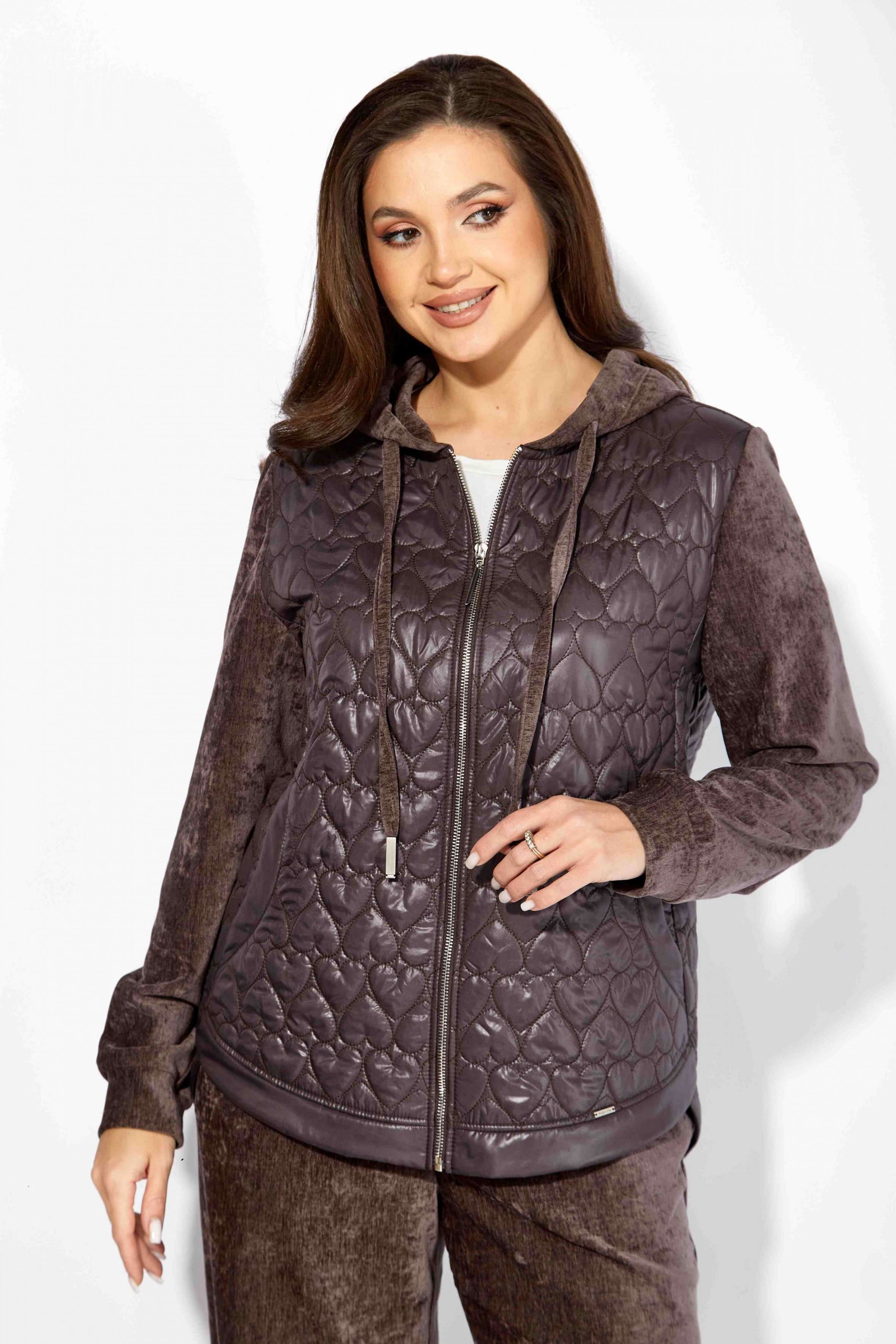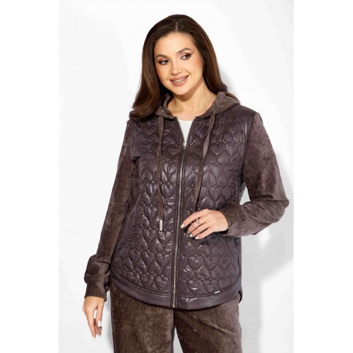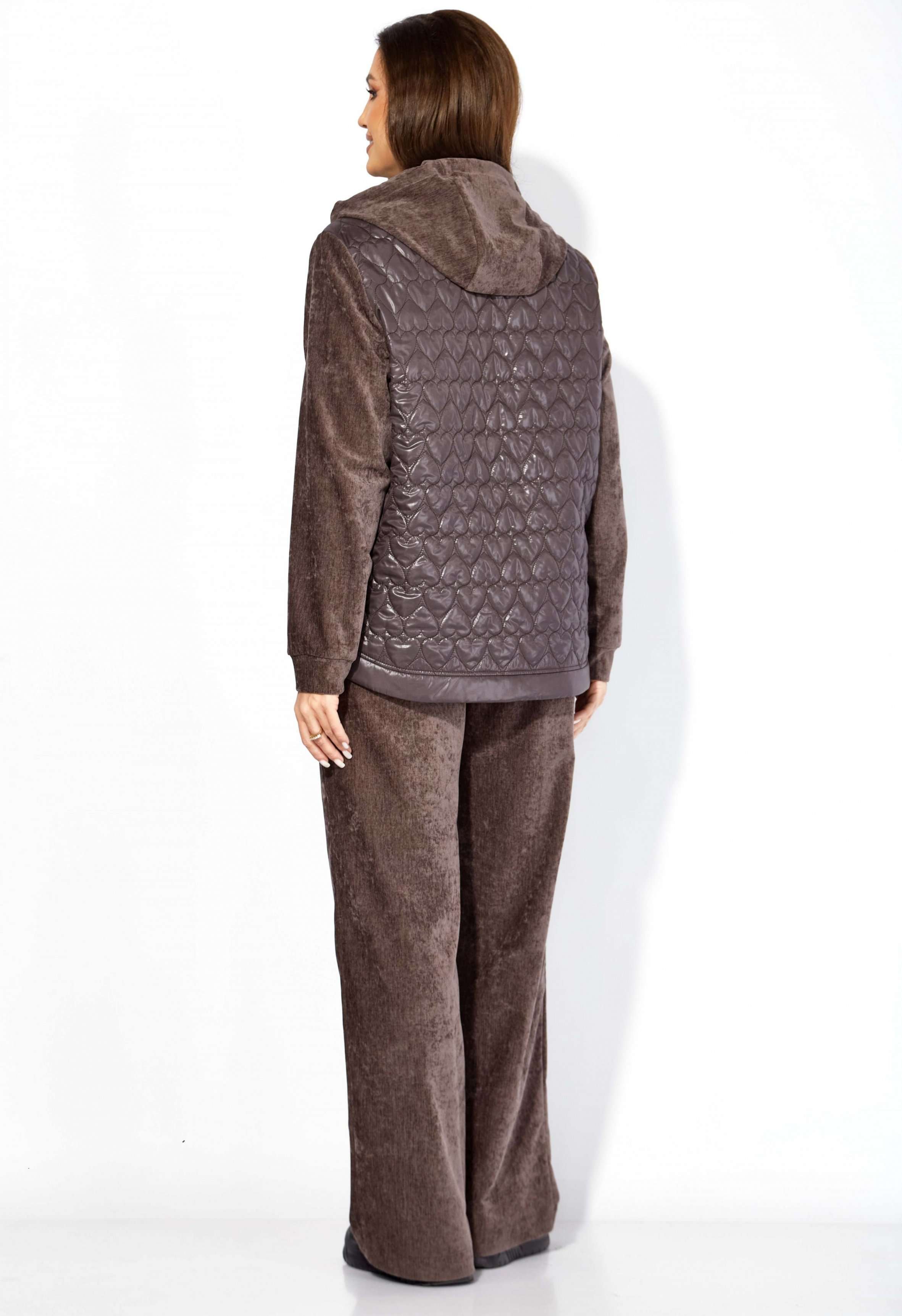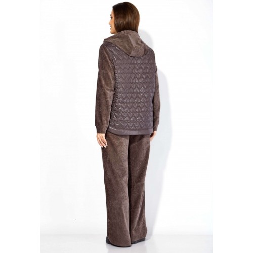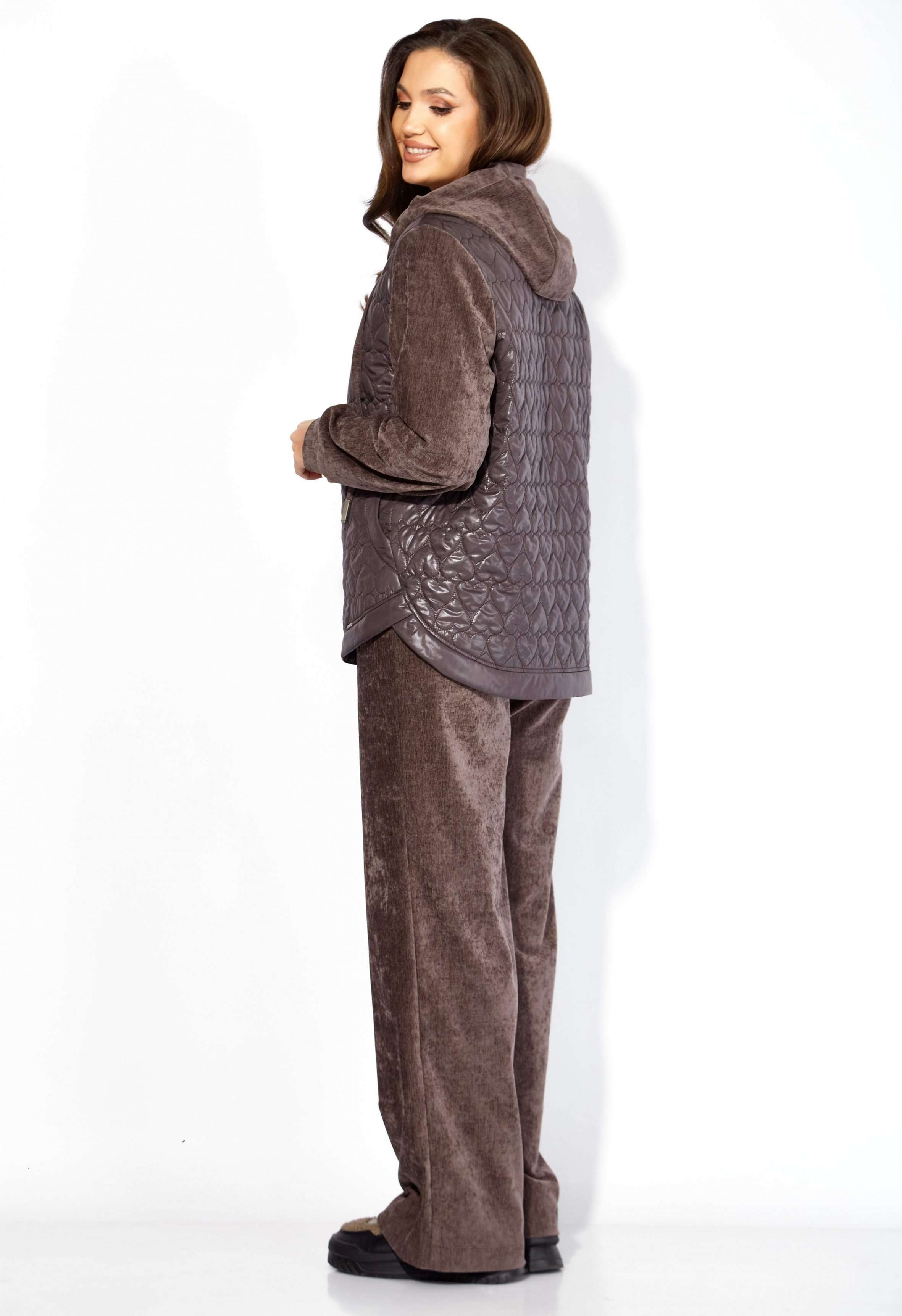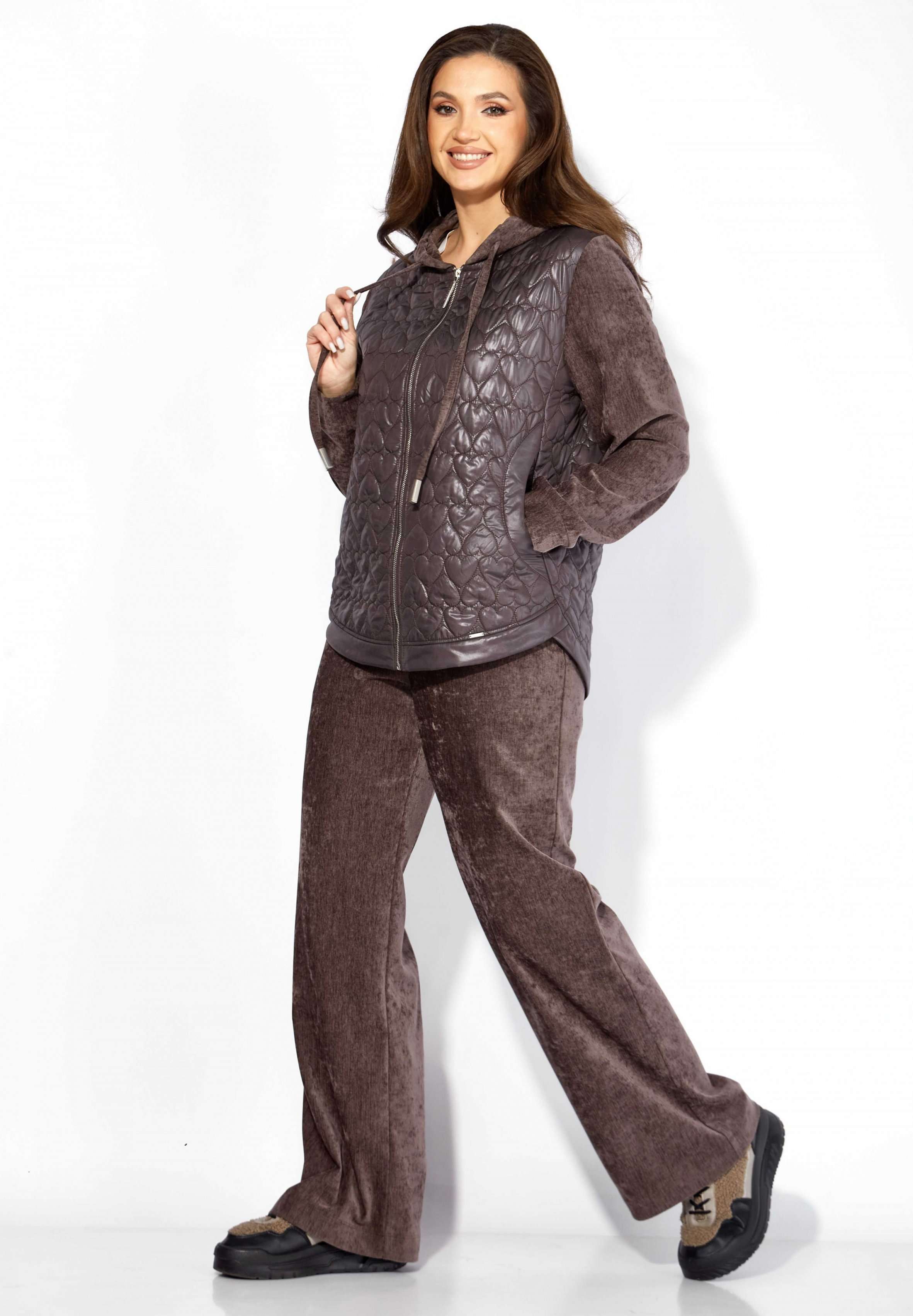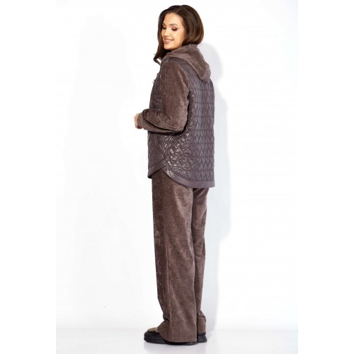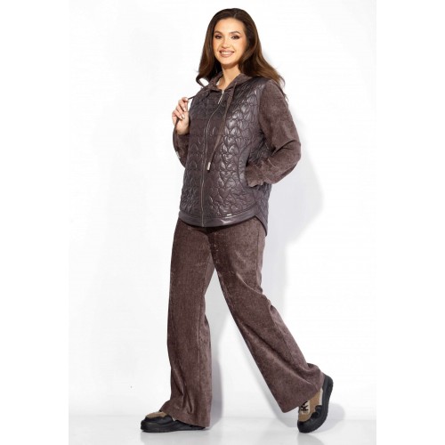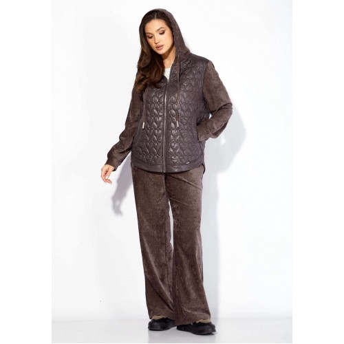 Комплект женский, 2х предметный, состоящий из куртки и брюк, выполнен из двух видов материала. Куртка с сочетании плащевки стеганой на синтепоне и Миланский вельвет со стрейчем. По переду рельефы из пройм, карманы. Вход в карман закругленной формы с отрезной планкой. Застежка центральная на тесьму "молния" Низ куртки фигурной формы, по спинке удлиннен, с отрезной планкой. Рукав длинный, втачной, по низу на манжете. Горловина оформлена капюшоном с кулисой по краю . Брюки прямые, выполнены из ткани Миланский вельвет. По переду наклонные карманы. Пояс притачной с резинкой по кругу.