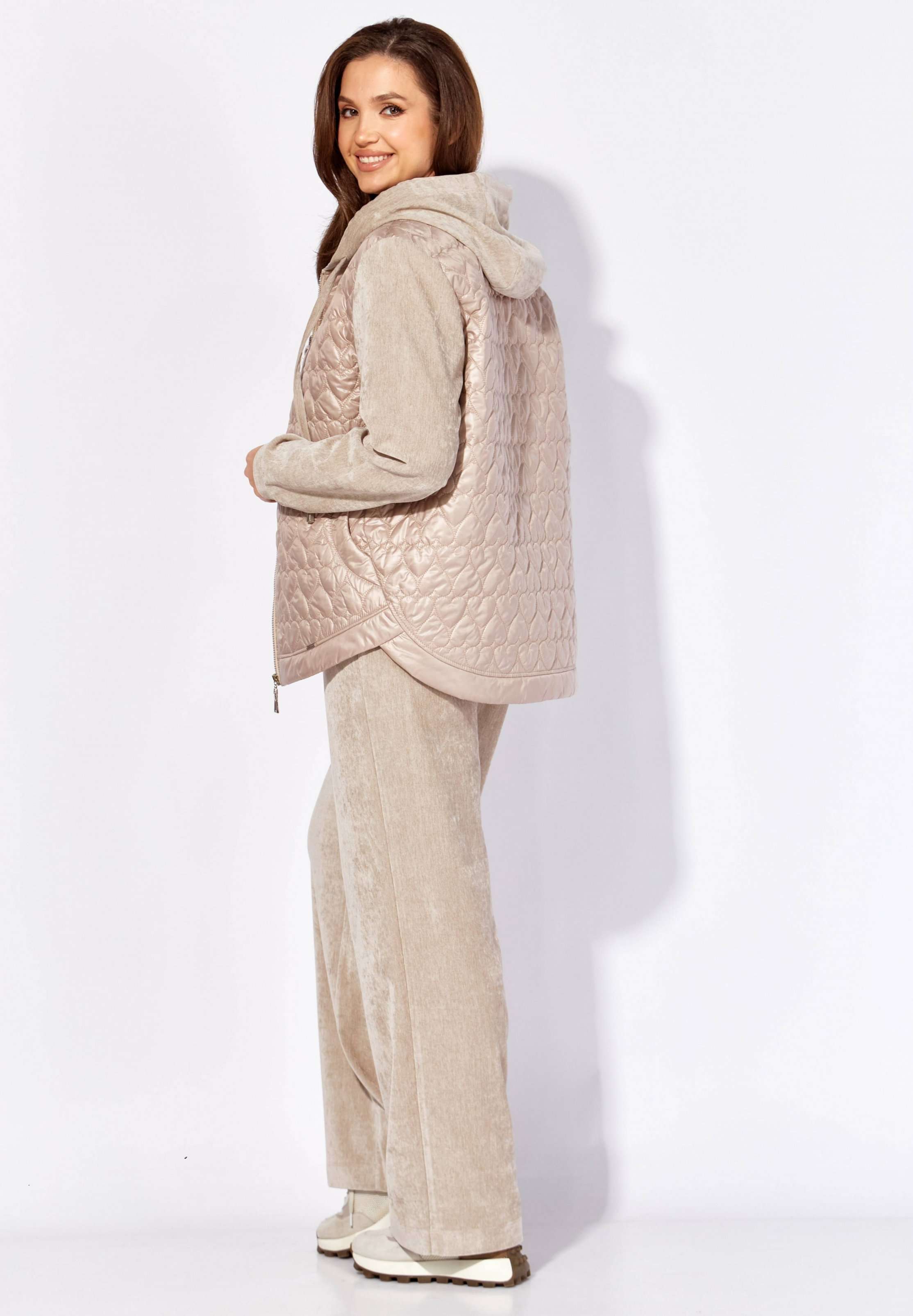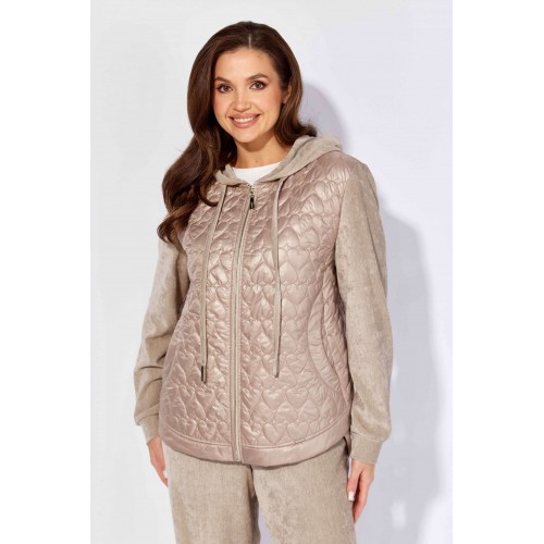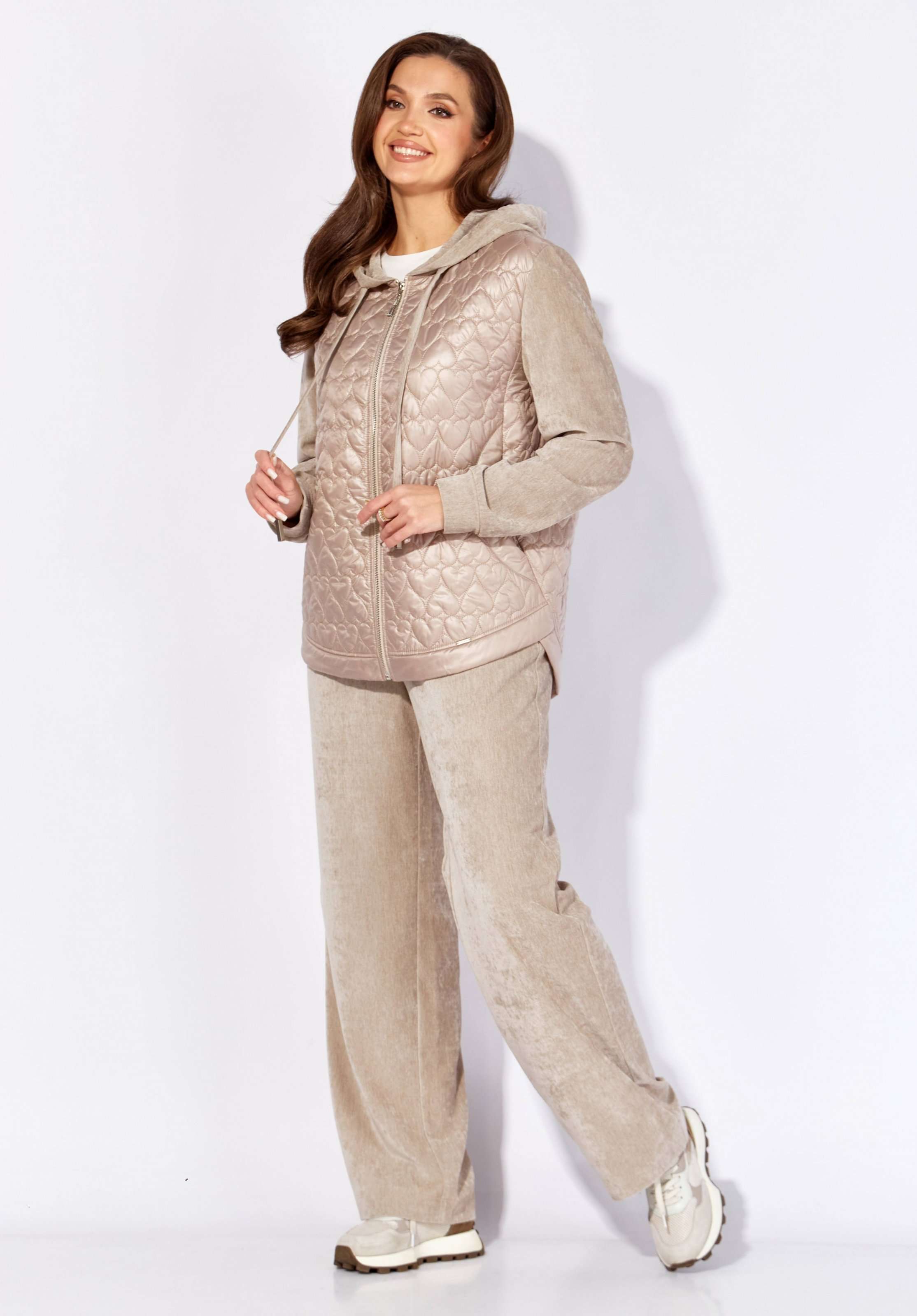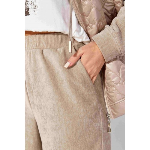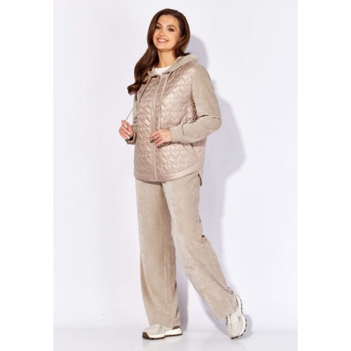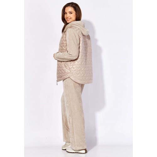 Комплект женский, 2х предметный, состоящий из куртки и брюк, выполнен из двух видов материала. Куртка с сочетании плащевки стеганой на синтепоне и Миланский вельвет со стрейчем. По переду рельефы из пройм, карманы. Вход в карман закругленной формы с отрезной планкой. Застежка центральная на тесьму "молния" Низ куртки фигурной формы, по спинке удлиннен, с отрезной планкой. Рукав длинный, втачной, по низу на манжете. Горловина оформлена капюшоном с кулисой по краю . Брюки прямые, выполнены из ткани Миланский вельвет. По переду наклонные карманы. Пояс притачной с резинкой по кругу.