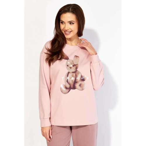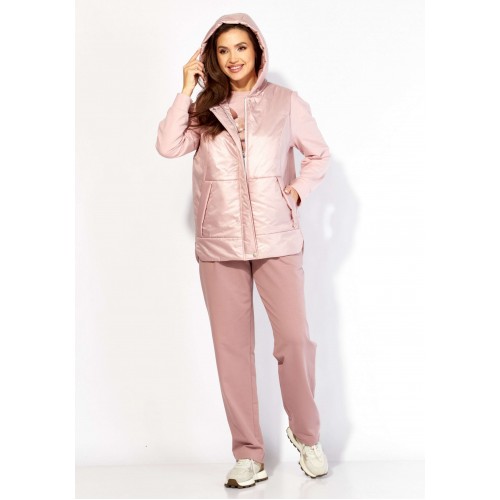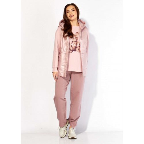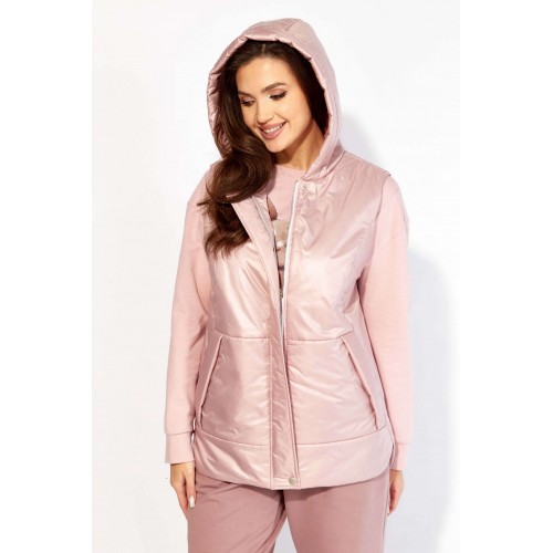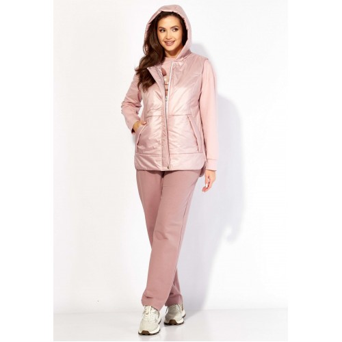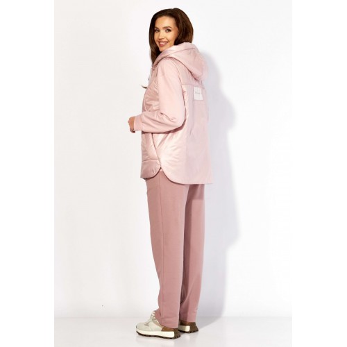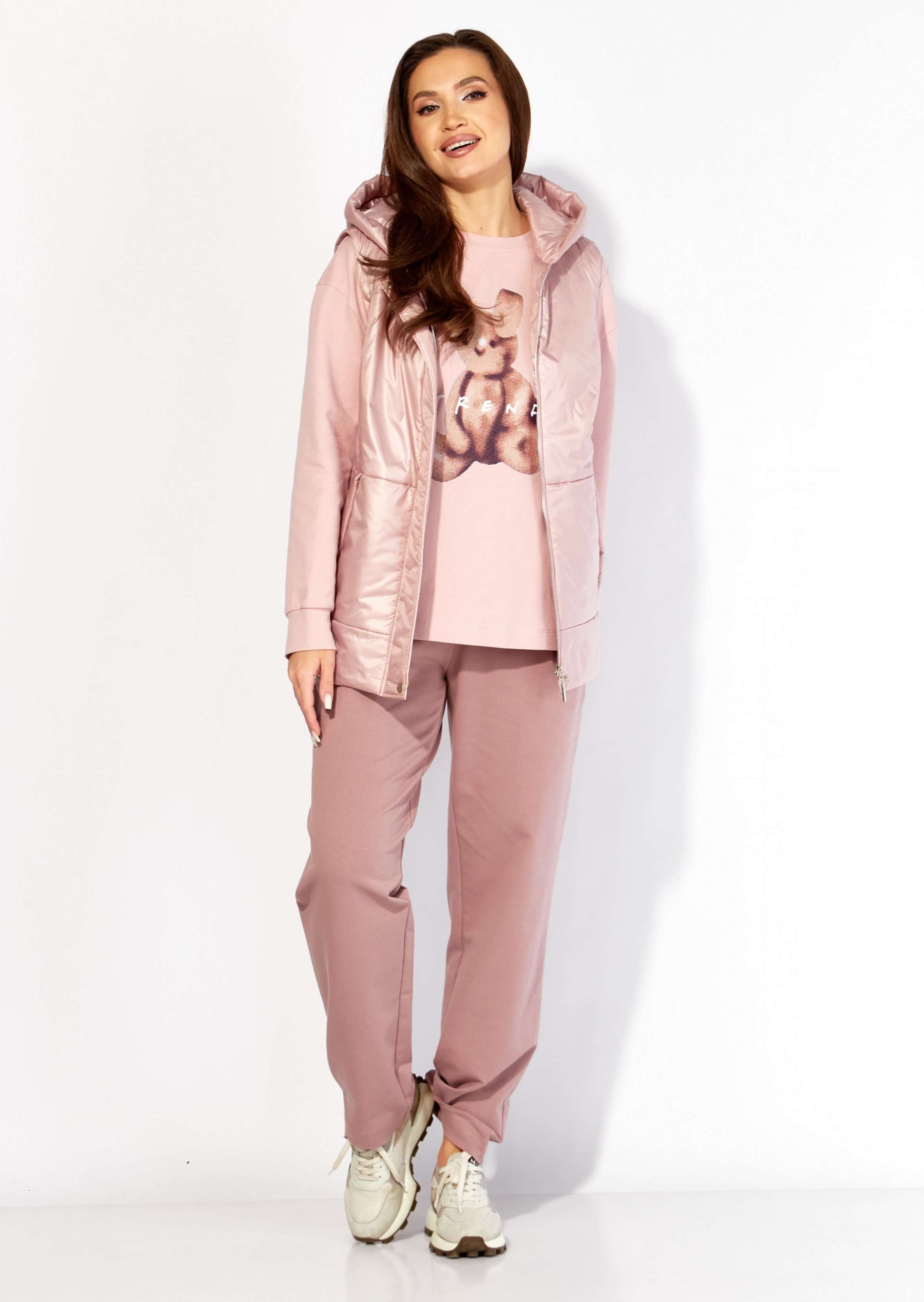 Комплект женский, 3х предметный, состоящий из свитшота, брюк и жилета. Свитшот прямого силуэта с длинным рукавом. Рукав со спущенной линией плеча, снизу на манжете. По переду рельефы. Центр задекорирован принтом. Горловина круглая , с подрезной бейкой. Спинка со средним швом. По низу спинки, фигурной формы манжета, переходящая на перед. Брюки прямые. По переду карманы и мягкие складки. Пояс притачной, на резинке, с гладкой центральной частью. Костюм- трикотажное полотно 2х нитка . Жилет из плащевки на синтепоне(VS100) и на подкладке. По переду рельефы и карманы в подрезах. Горловина оформлена капюшоном. Застежка центральная, на тесьму "молния" закрытая планкой, закрепленной кнопками. По спинке кокетка и нашивка с принтом.