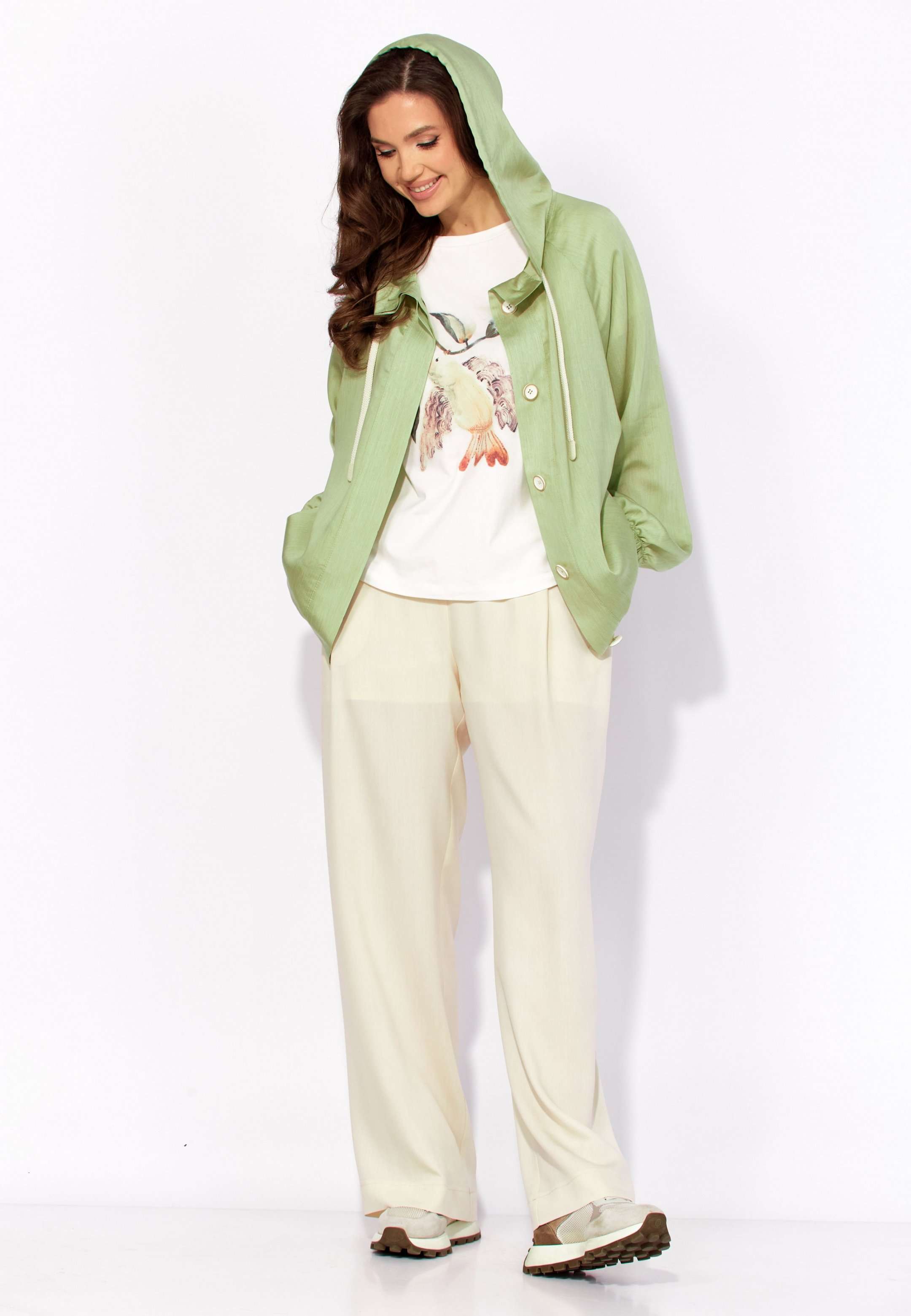 Комплект женский, 3х предметный, состоящий из куртки брюк и топа. Куртка-парка, облегченная, без подкладки, прямого силуэта. Рукав реглан, длинный, по низу на резинке. Горловина оформлена капюшоном с кулисой. По переду карманы в рельефах. Застежка центральная, потайная, на петли и пуговицы. Низ куртки регулируется кулисой с фиксатором по бокам. Спинка без особенностей. Топ из трикотажного хлопкового полотна, прямого силуэта с коротким цельнокройным рукавом. Горловина круглая, с подрезной планкой. Перед задекорирован принтом. Брюки прямые, широкие. По переду наклонные карманы и ягкие складки. Пояс притачной, по центру гладкий, дальше с резиной. В брюках подкладка (шорты).
