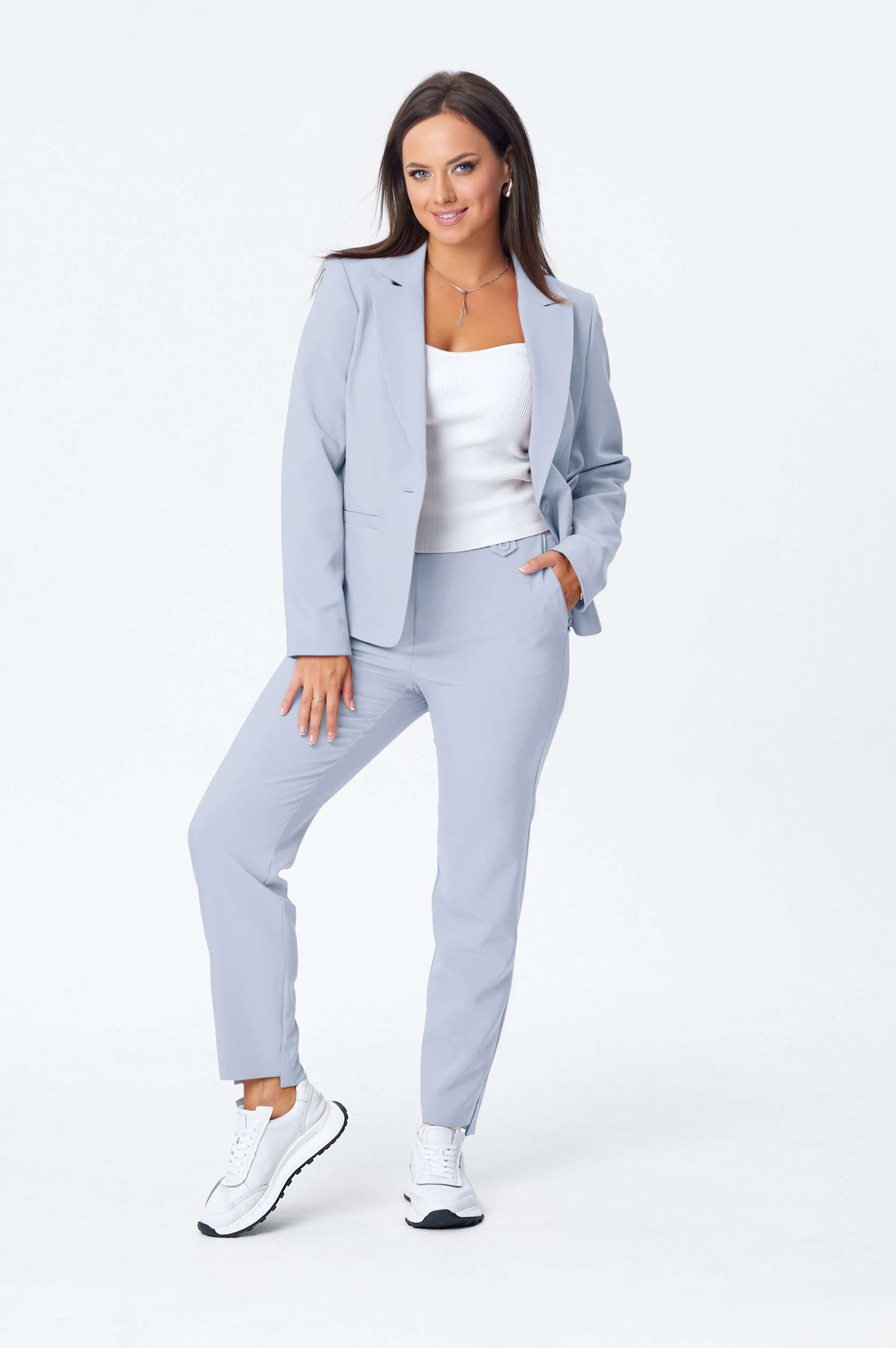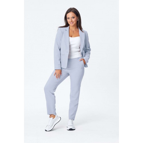 Костюм женский двух-предметный, состоящий из жакета и брюк. Жакет полуприлегающего силуэта с центральной бортовой застёжкой на одну петлю-пуговицу до линии перегиба лацкана. Перед с талиевой вытачкой и прорезным карманом с листочкой с втачными концами. Спинка со средним швом. Рукав втачной двух-шовный длинный. Воротник пиджачного типа. Брюки классического кроя, слегка зауженные к низу с притачным поясом с резинкой по задним половинкам брюк. Брюки с наклонным к боковому шву карманом и двумя фигурными хлестиками на одну пуговицу по поясу передних половинок. Застёжка на тесьму - молнию и одну петлю-пуговицу по поясу. Низ брюк имеет фигурную форму - укорочена по передним половинкам и удлинённые по задним. Длина жакета по спинке - 59 см. Длина рукава - 61 см. Длина брюк по боковому шву - 96 см.