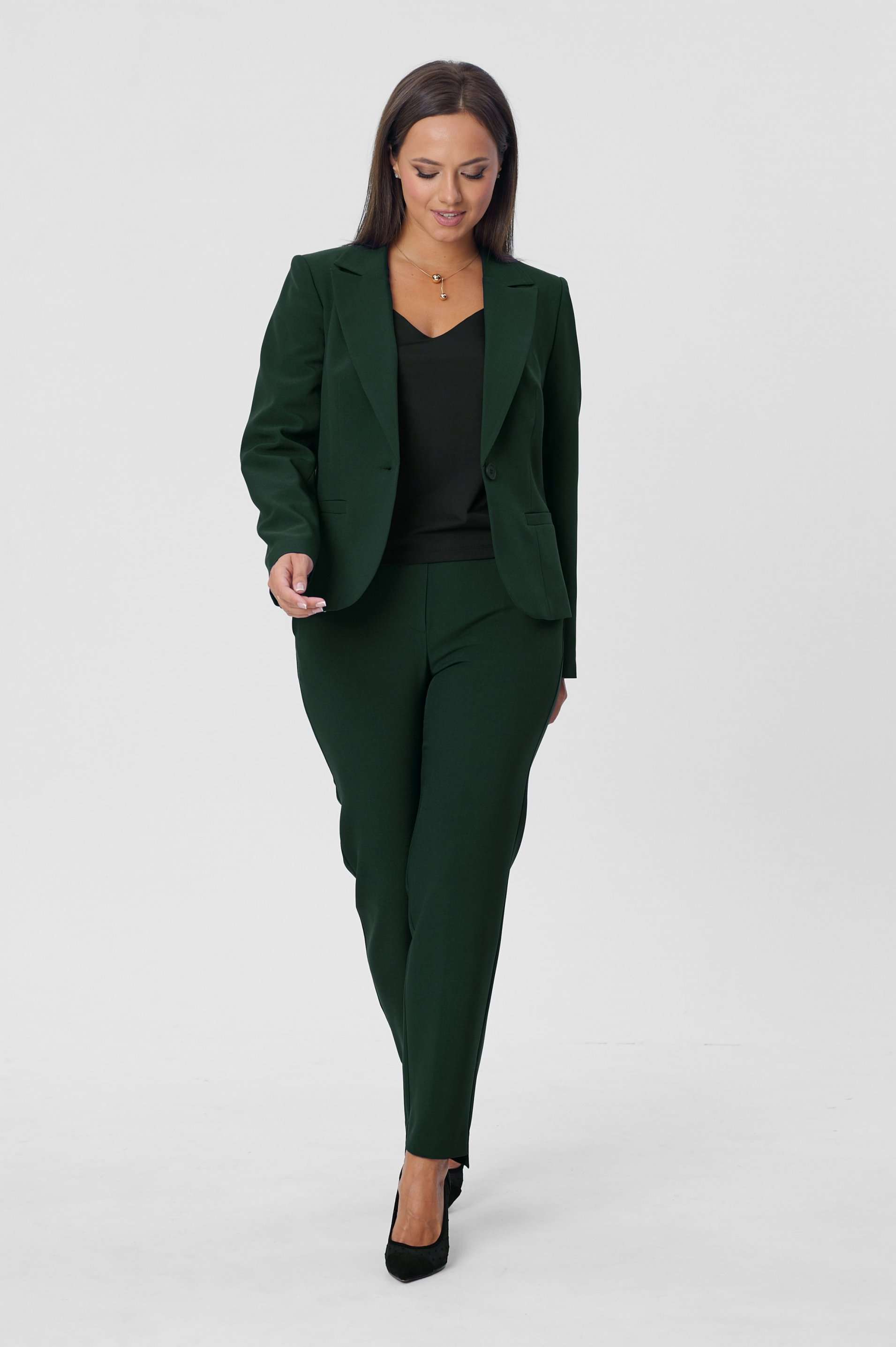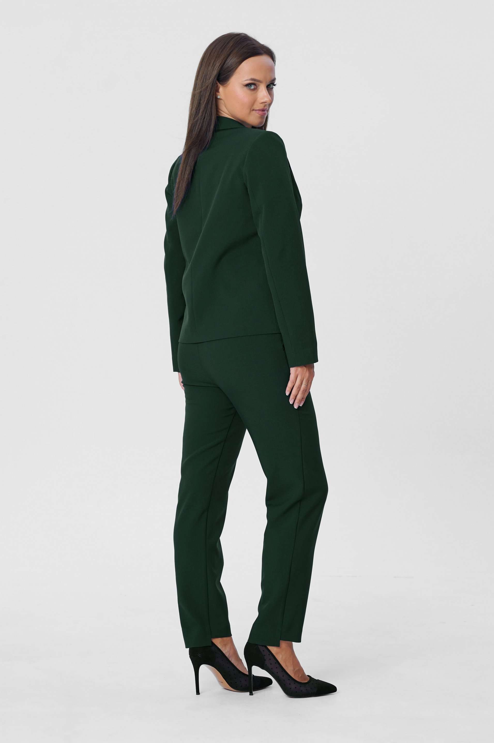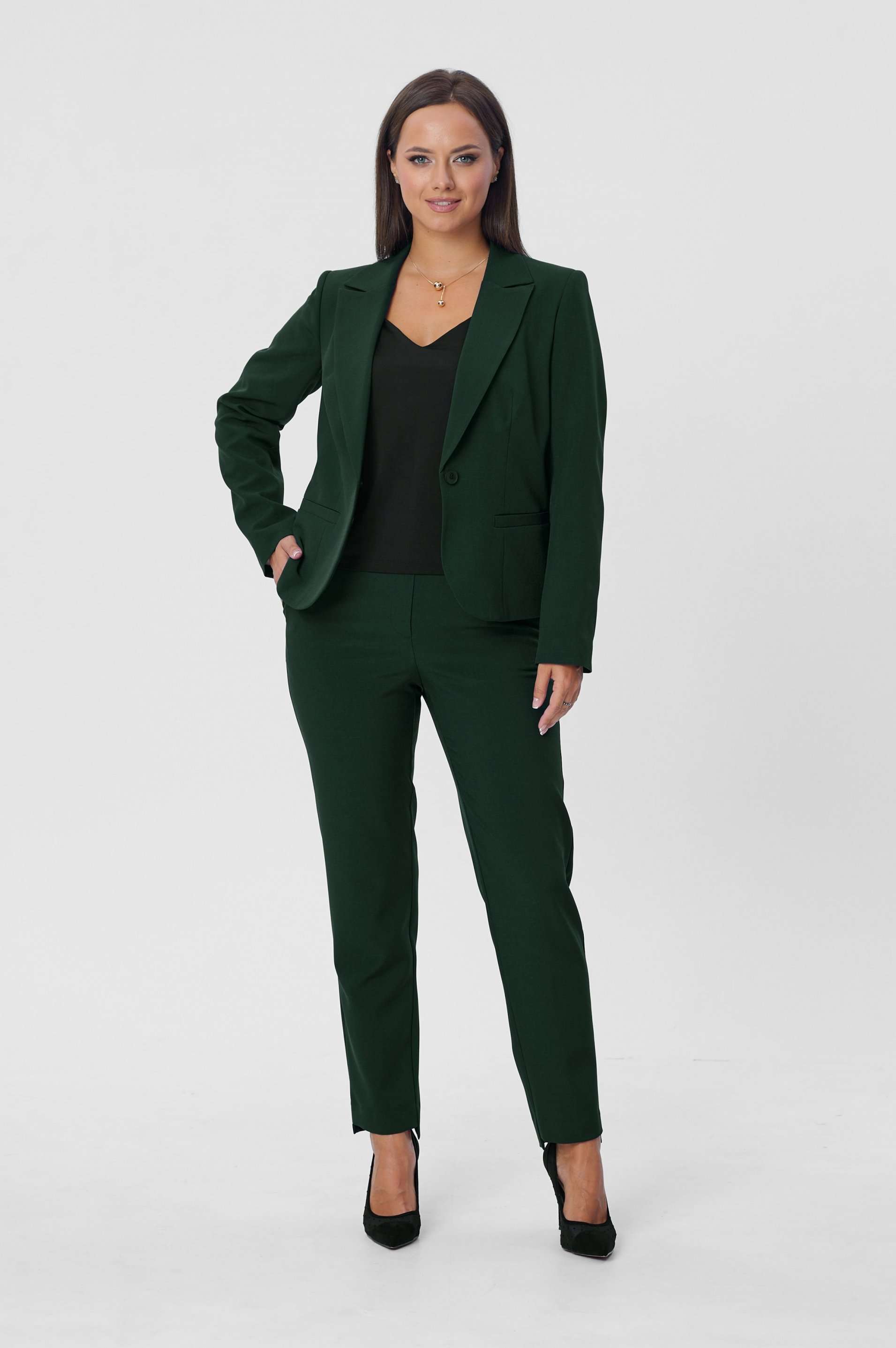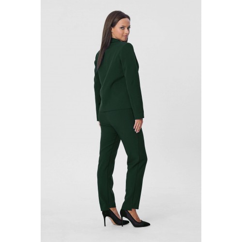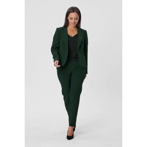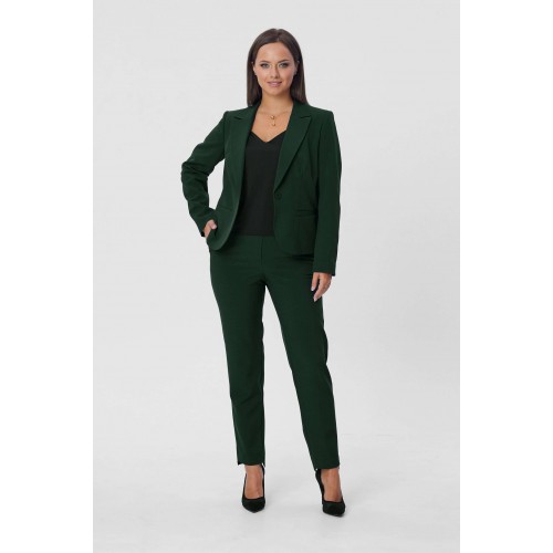 Костюм женский двухпредметный, состоящий из жакета и брюк. Жакет полуприлегающего силуэта с центральной бортовой застёжкой на одну петлю-пуговицу до линии перегиба лацкана. Перед с талиевой вытачкой и прорезным карманом с листочкой с втачными концами. Спинка со средним швом. Рукав втачной двухшовный длинный. Воротник пиджачного типа. Брюки классического кроя, слегка зауженные к низу с притачным поясом с резинкой по задним половинкам брюк. Брюки с наклонным к боковому шву карманом и двумя фигурными хлестиками на одну пуговицу по поясу передних половинок. Застёжка на тесьму - молнию и одну петлю-пуговицу по поясу. Низ брюк имеет фигурную форму - укорочена по передним половинкам и удлинённые по задним. Длина жакета по спинке - 59 см. Длина рукава - 61 см. Длина брюк по боковому шву - 96 см.