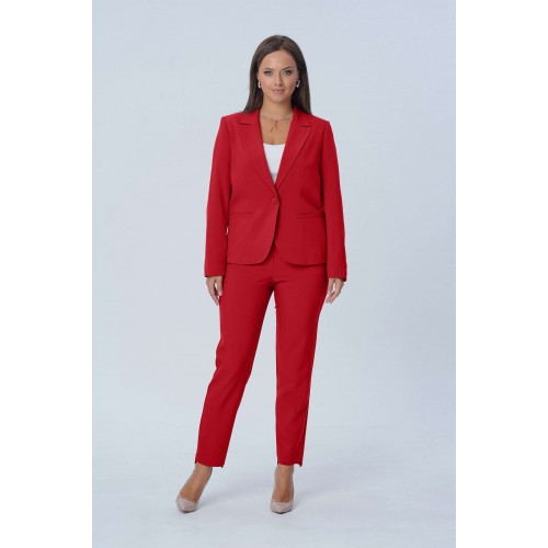 Костюм женский двухпредметный, состоящий из жакета и брюк. Жакет полуприлегающего силуэта с центральной бортовой застёжкой на одну петлю-пуговицу до линии перегиба лацкана. Перед с талиевой вытачкой и прорезным карманом с листочкой с втачными концами. Спинка со средним швом. Рукав втачной двухшовный длинный. Воротник пиджачного типа. Брюки классического кроя, слегка зауженные к низу с притачным поясом с резинкой по задним половинкам брюк. Брюки с наклонным к боковому шву карманом и двумя фигурными хлестиками на одну пуговицу по поясу передних половинок. Застёжка на тесьму - молнию и одну петлю-пуговицу по поясу. Низ брюк имеет фигурную форму - укорочена по передним половинкам и удлинённые по задним. Длина жакета по спинке - 59 см. Длина рукава - 61 см. Длина брюк по боковому шву - 96 см.