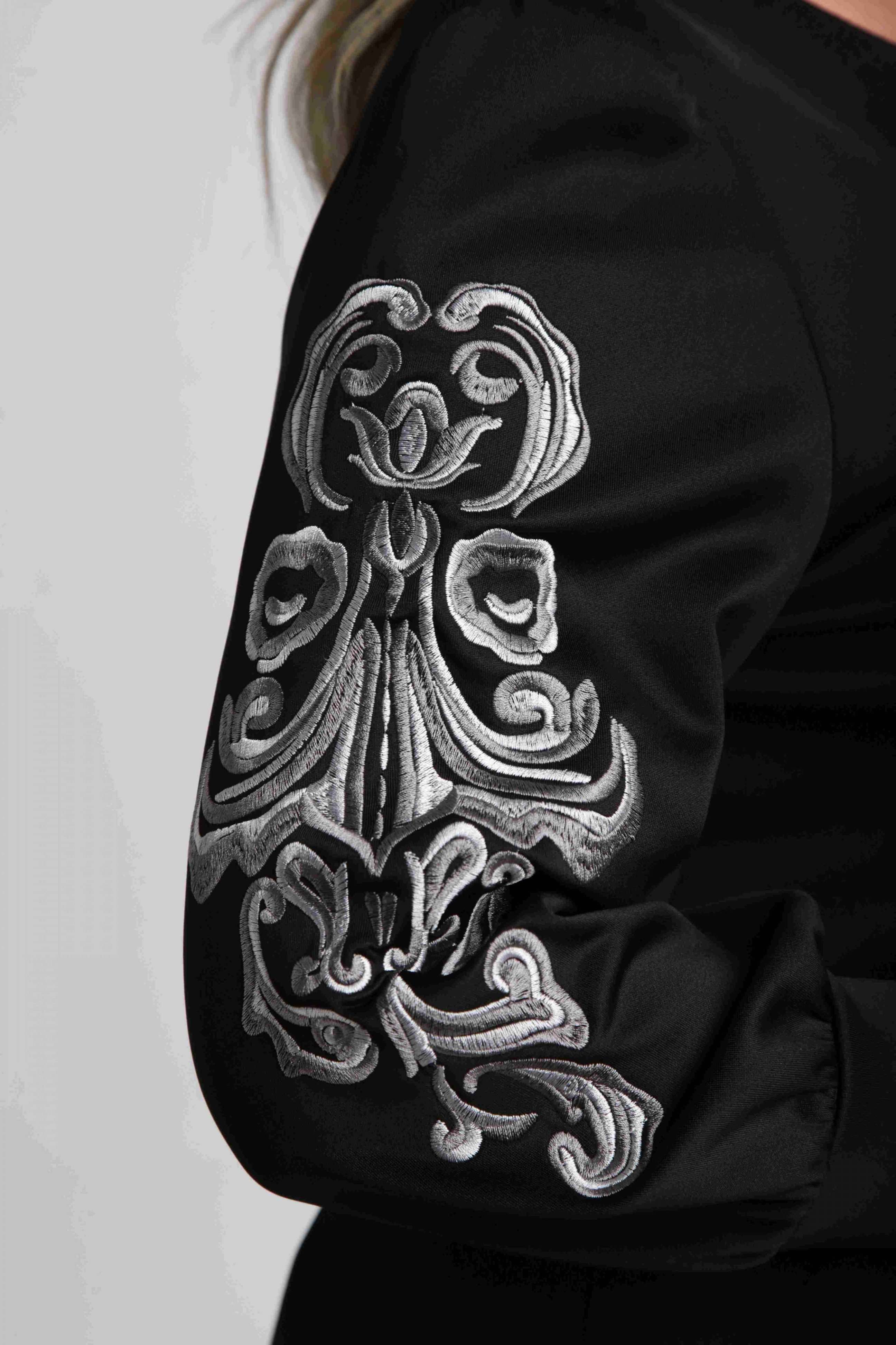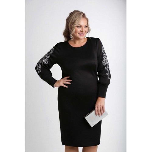 Платье женское полуприлегающего силуэта из трикотажа с декоративной вышивкой по рукавам. Перед с фигурными вытачками, выходящими из бёдер. Спинка со средним швом, заканчивающимся шлицей и с потайной молнией. Рукав втачной со сборкой по окату и низу с двойной манжетой. Длина платья по спинке - 101 см. Длина рукава - 61 см.