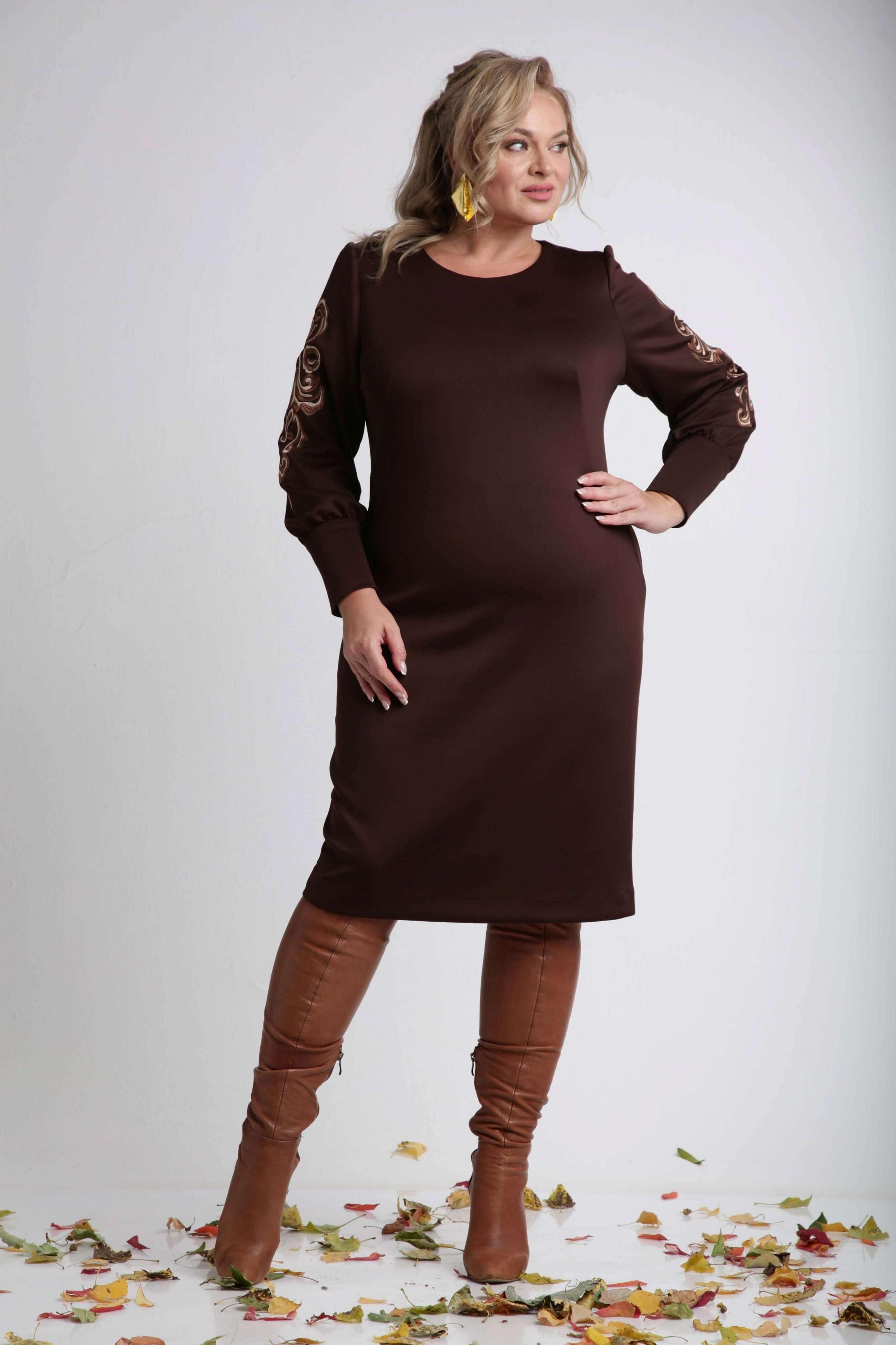 Платье женское полуприлегающего силуэта из трикотажа с декоративной вышивкой по рукавам. Перед с фигурными вытачками, выходящими из бёдер. Спинка со средним швом, заканчивающимся шлицей и с потайной молнией. Рукав втачной со сборкой по окату и низу с двойной манжетой. Длина платья по спинке - 101 см. Длина рукава - 61 см.