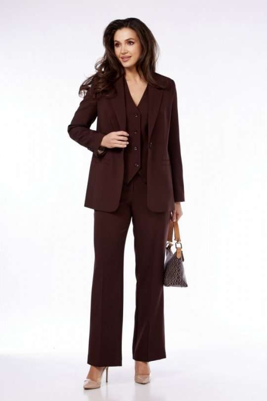 Костюм женский 3-х предметный, полуприлегающего силуэта. Состоит из жакета и жилета на подкладке и брюк. Жакет с воротником пиджачного типа, центральной застёжкой на 1 петлю и 1 пуговицу. Перед с рельефными швами от пройм до низа и талиевыми вытачками и прорезными карманами с листочками с втачными концами. Спинка со средним швом. Рукав втачной, двухшовный, длинный со шлицей. Жилет с рельефными швами от пройм до низа по переду и спинке, с центральной застёжкой на 4 петли и 4 пуговицы. Перед с прорезными карманами с листочками с втачными концами. Брюки с застёжкой на тесьму "молнию" в средних срезах передних половинок, с притачным поясом на 1 петлю и 1 пуговицу и резинкой по задним половинкам, с карманами наклонными к боковым швам. По передним и задним половинкам заутюженные канты. Длина жакета по спинке - 70 см. Длина рукава - 61 см. Длина жилета по спинке - 53 см. Длина брюк по боковому шву - 101 см.