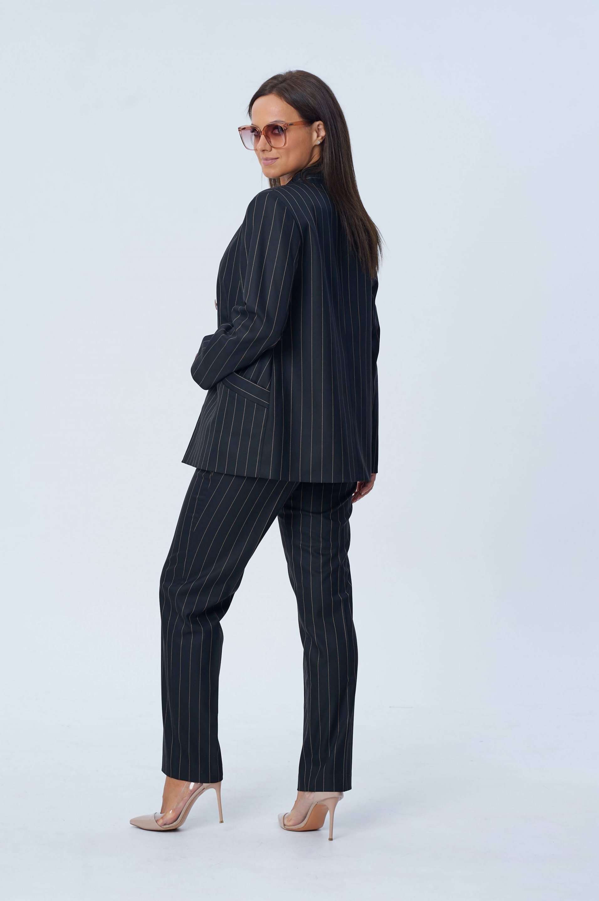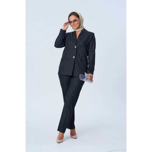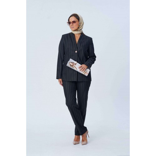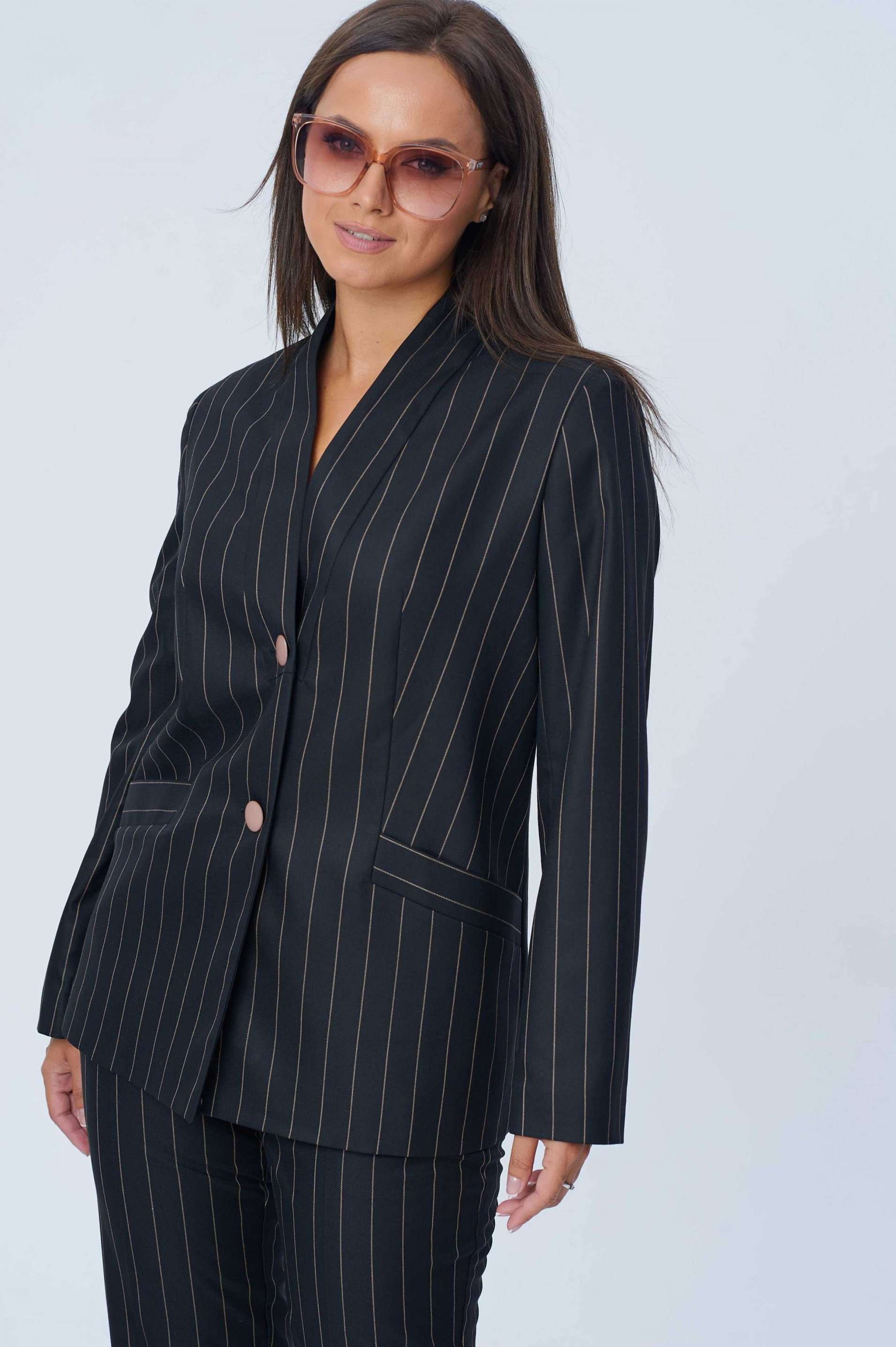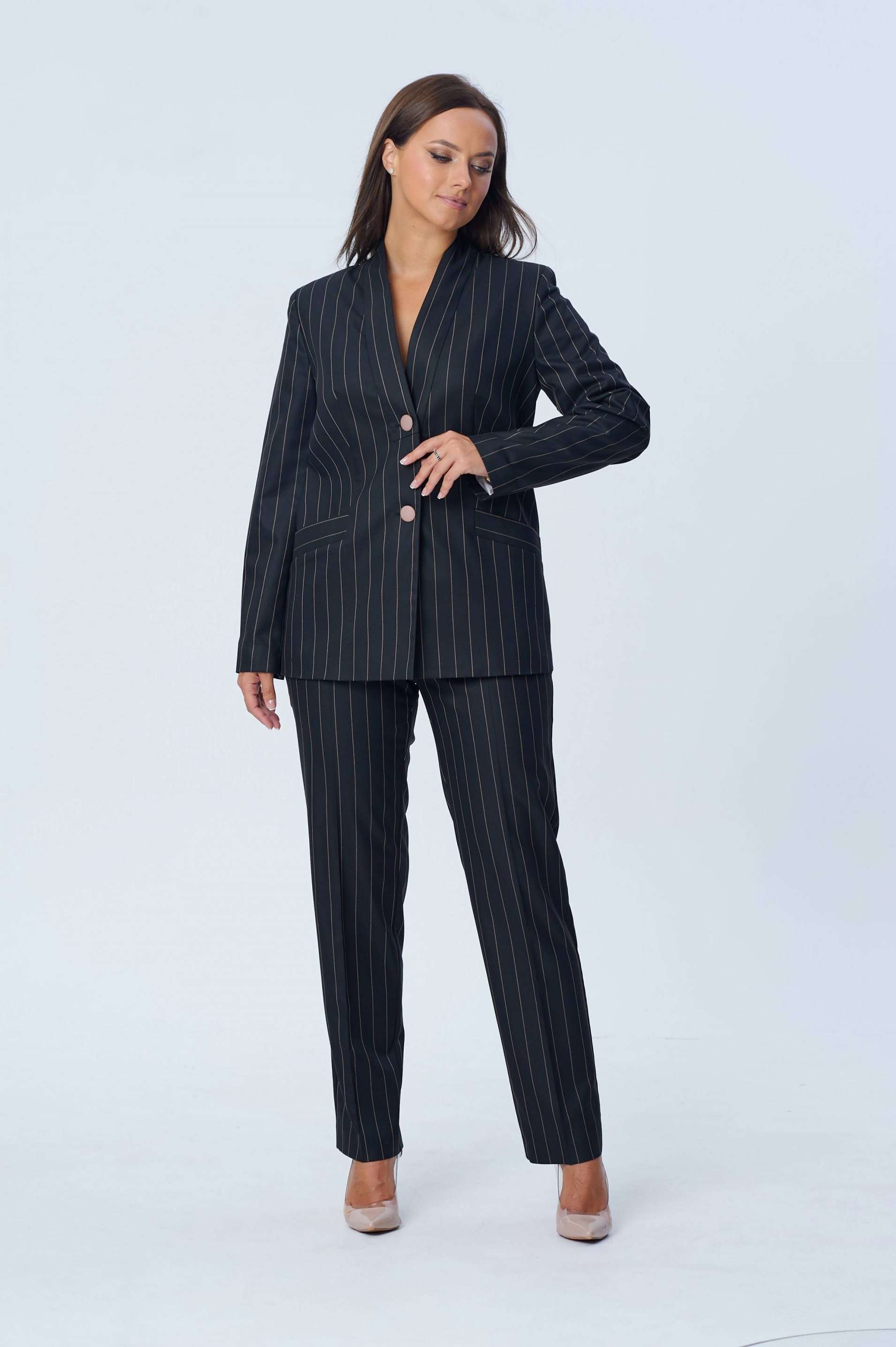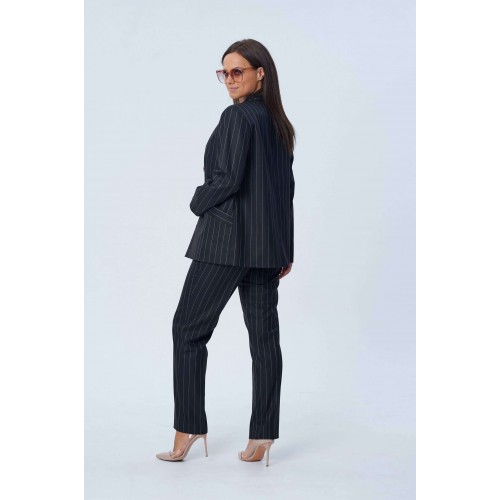 Костюм женский двух-предметный, состоящий из жакета и брюк. Жакет полуприлегающего силуэта с центральной бортовой застёжкой на две петли-пуговицы и подрезом фигурным от бокового шва, переходящим в нагрудную вытачку. В подрезе обработан карман с листочкой. Спинка со средним швом. Воротник фантазийной формы - в виде подреза, переходящего в стойку. Рукава втачные, двух-шовные. Брюки с притачным поясом, по задним половинкам вставлена резинка. Застёжка на тесьму-молнию в среднем срезе и одну петлю-пуговицу по поясу. Брюки слегка зауженные к низу с наклонным карманом из бокового шва и заутюженными стрелками. Длина жакета по спинке - 67,5 см. Длина рукава - 61 см. Длина брюк по боковой части - 99 см.