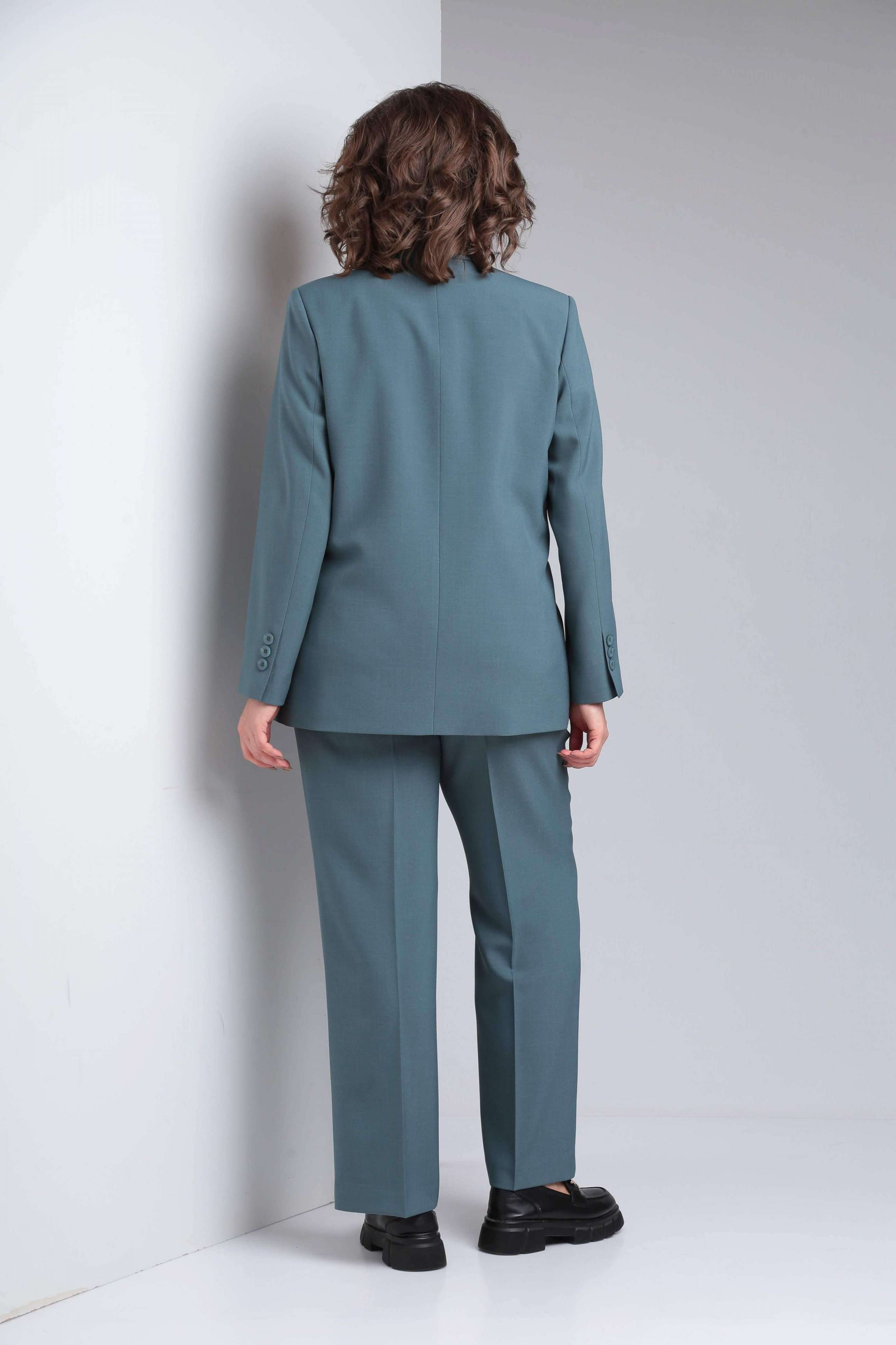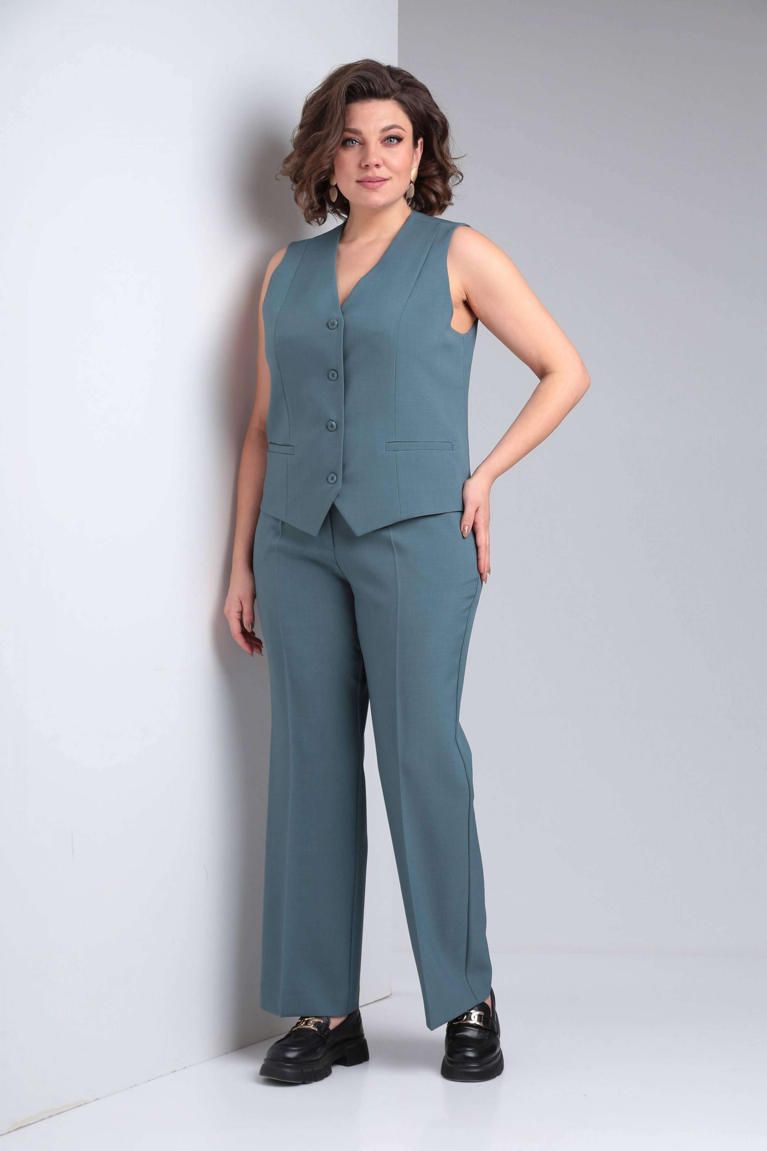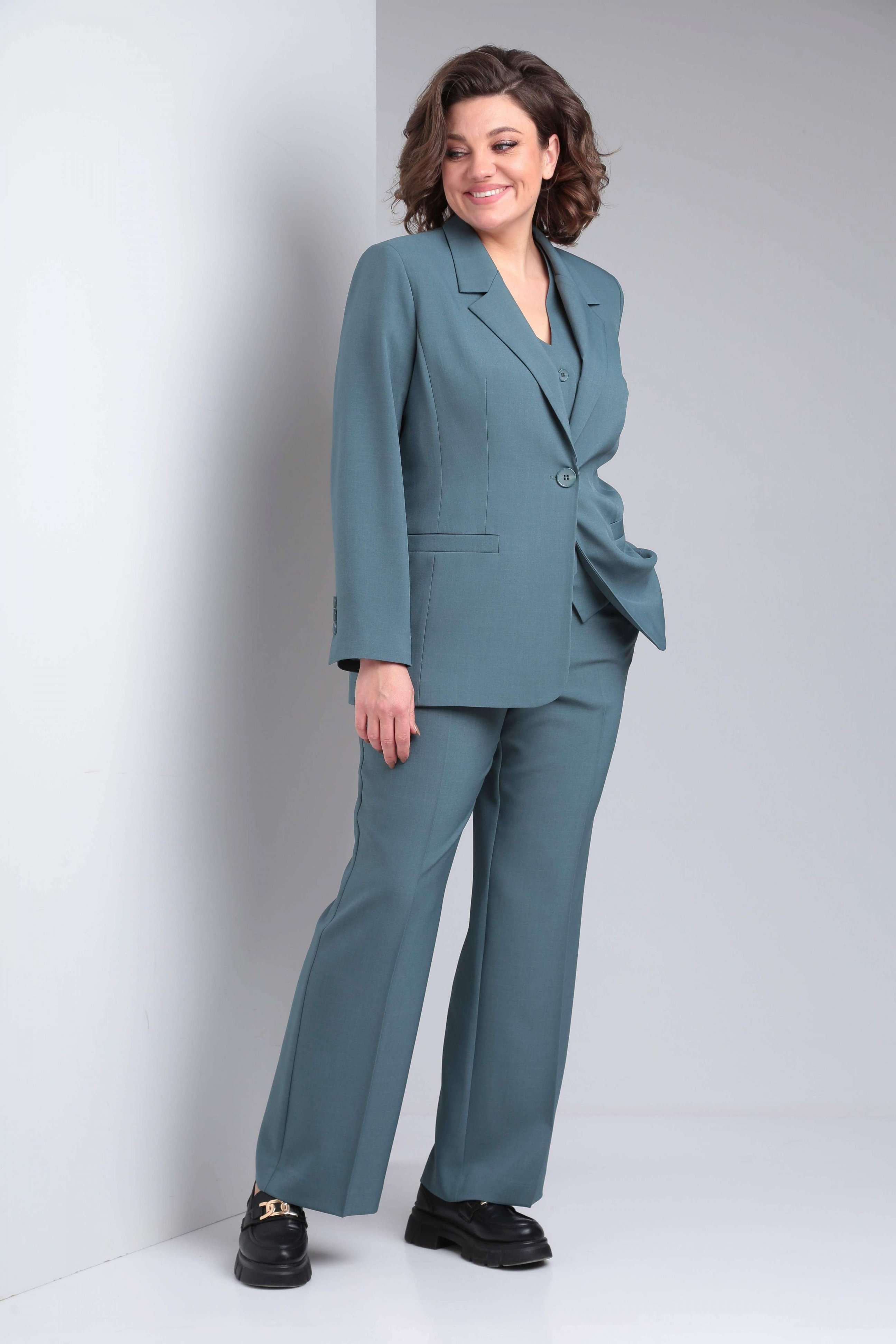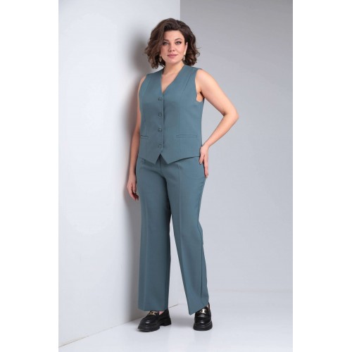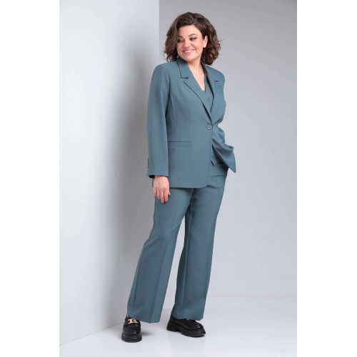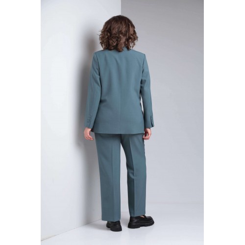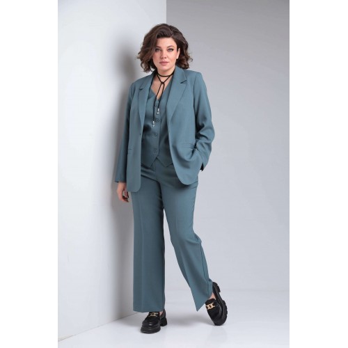 Костюм женский 3-х предметный, полуприлегающего силуэта. Состоит из жакета и жилета на подкладке и брюк. Жакет с воротником пиджачного типа, центральной застёжкой на 1 петлю и 1 пуговицу. Перед с рельефными швами от пройм до низа и талиевыми вытачками и прорезными карманами с листочками с втачными концами. Спинка со средним швом. Рукав втачной, двухшовный, длинный со шлицей. Жилет с рельефными швами от пройм до низа по переду и спинке, с центральной застёжкой на 4 петли и 4 пуговицы. Перед с прорезными карманами с листочками с втачными концами. Брюки с застёжкой на тесьму "молнию" в средних срезах передних половинок, с притачным поясом на 1 петлю и 1 пуговицу и резинкой по задним половинкам, с карманами наклонными к боковым швам. По передним и задним половинкам заутюженные канты. Длина жакета по спинке - 71 см. Длина рукава - 61 см. Длина жилета по спинке - 54 см. Длина брюк по боковому шву - 101 см.