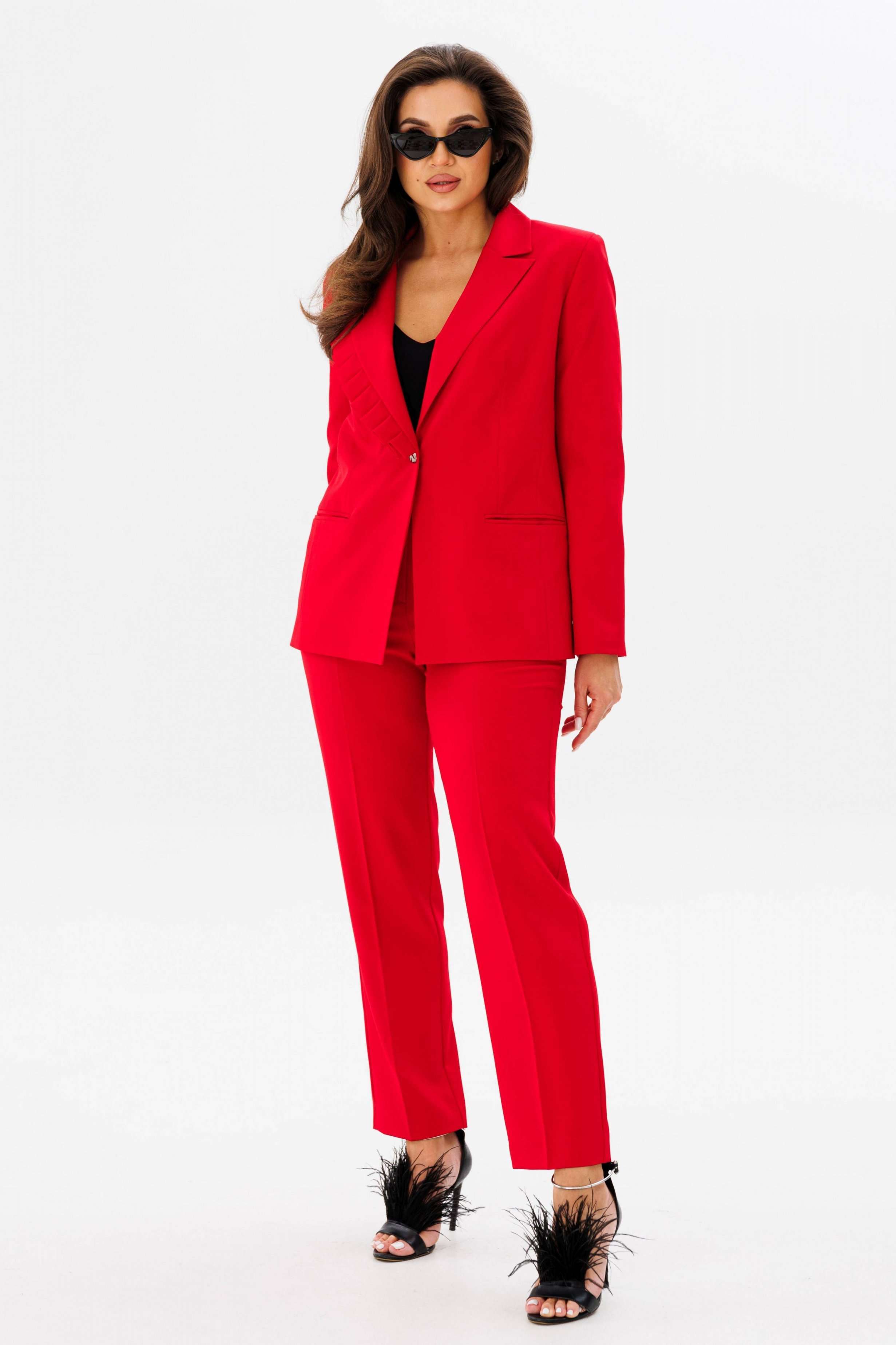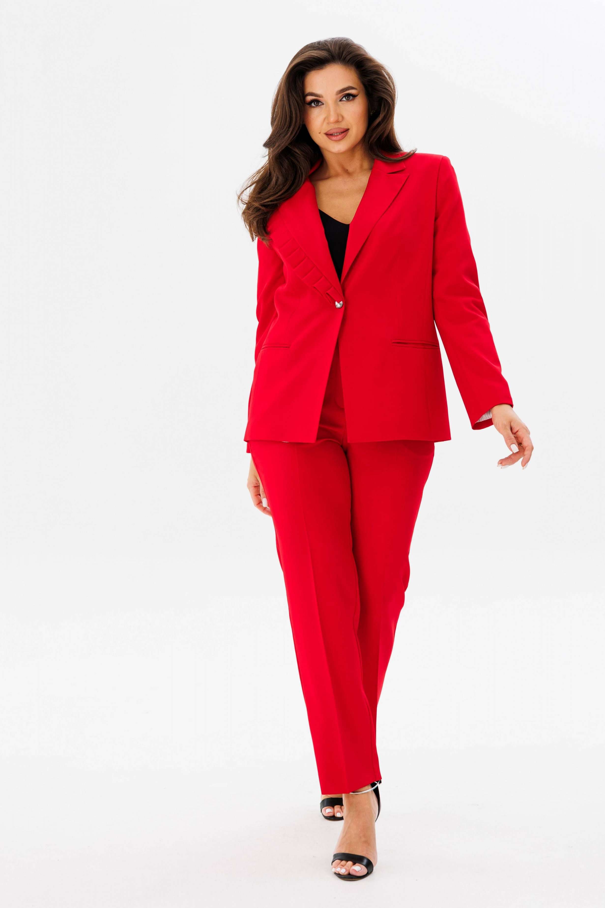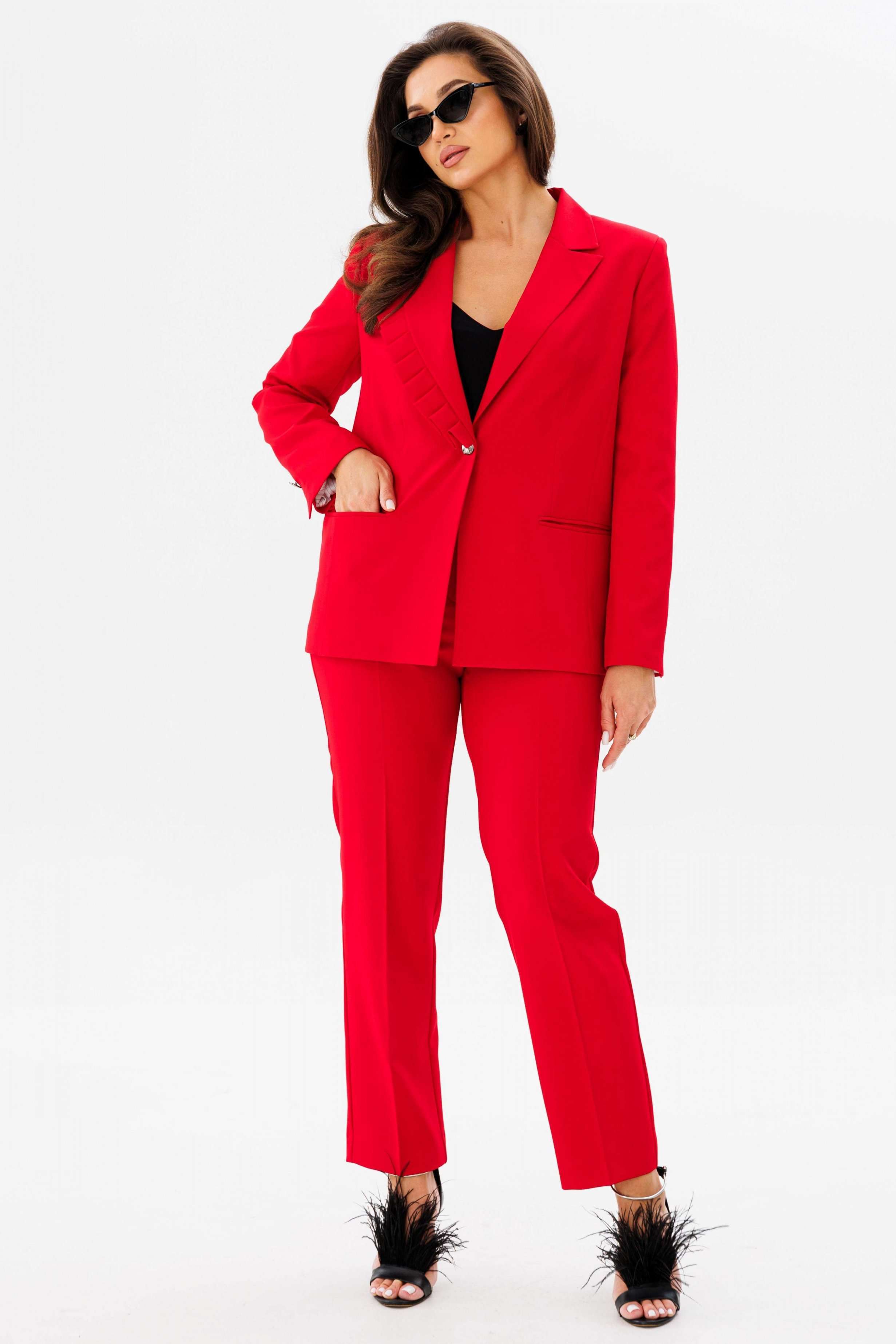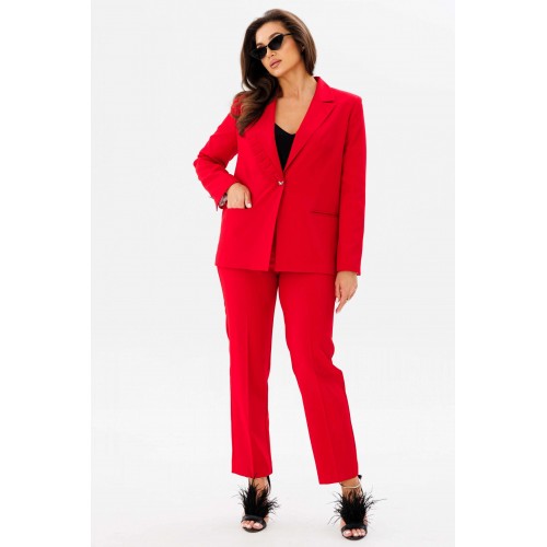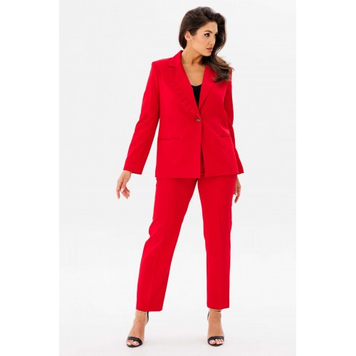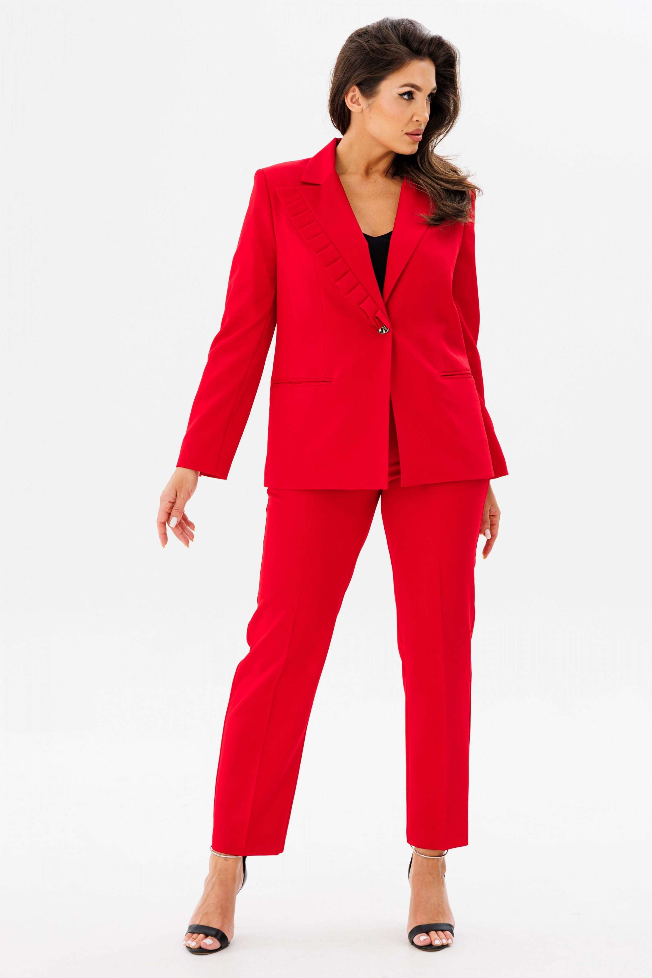 Костюм женский двух-предметный, состоящий из жакета и брюк. Жакет полуприлегающего силуэта с центральной бортовой застёжкой на одну петлю-пуговицу до линии перегиба лацкана. Правый лацкан (ассиметрия) с фантазийными односторонними складками. Перед с отрезным бочком, талиевой вытачкой и карманы в рамку с двумя обтачками. Спинка со средним швом. Рукава втачные двух-шовные с открытой шлицей на одну пуговицу. Брюки с притачным поясом по задним половинкам на резинке и с застёжкой на тесьму-молнию в средних срезах передних половинок. Брюки классического кроя с заутюженными кантами. В брюках обработаны карманы фантазийной формы с подрезом. Длина жакета по спинке - 66 см. Длина рукава - 61 см. Длина брюк по боковой части - 98 см.