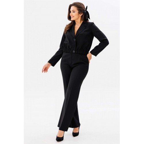 Костюм женский двухпредметный, состоящий из укороченного жакета на подкладке и брюк. Жакет с центральной бортовой застёжкой на две петли-пуговицы до линии перегиба лацкана прямого силуэта с нагрудной вытачкой, выходящей из бокового шва и резинкой по низу переда и частично по спинке. На спинке настрочен декоративный эменет. Рукава втачные длинные одношовные. Воротник пиджачного типа. Брюки классического кроя прямого силуэта со стрелками и притачным поясом на широкой резинке. Застёжка на потайную тесьму-молнию в боковых швах. На поясе настрочены шлёвки для съёмного пояса, застёгивающегося на 1 петлю-пуговицу. В брюках обработаны карманы, наклонные к боковому шву. Длина жакета по спинке - 49 см. Длина рукава - 60,5 см. Длина брюк - 100 см.