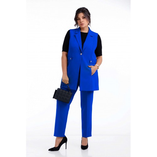 Костюм женский двух-предметный, состоящий из жилета и брюк. Жилет женский на подкладке удлинённый с разрезами в боковых швах и с центральной бортовой застёжкой на одну петлю-пуговицу до линии перегиба лацкана. Детали переда с рельефными швами от плеча до низа, в которых обработаны карманы в шве. Спинка со средним швом. Воротник пиджачного типа. На спинке пришиты декоративные хлестики, которые застёгиваются на переде на 1 петлю-пуговицу. Брюки женские классического силуэта, слегка зауженные к низу с притачным поясом на резинке по задним половинкам. Застёжка на тесьму-молнию в среднем шве и одну петлю-пуговицу по поясу. В брюках заутюжены канты и обработан карман, наклонный к боковым швам. Длина кардигана по спинке - 78,5 см. Длина брюк по боковому шву - 98 см.