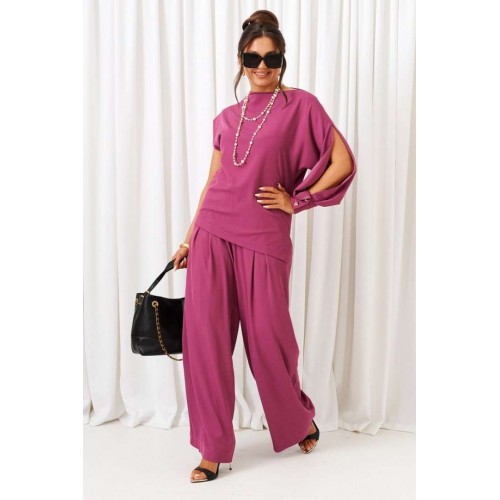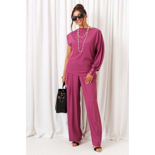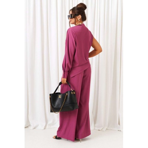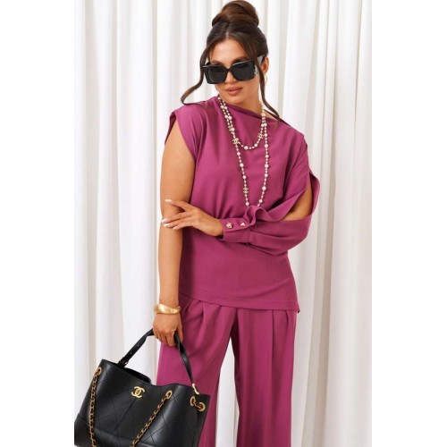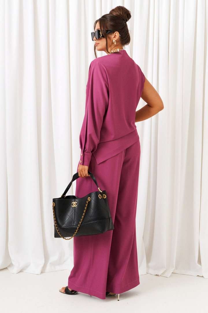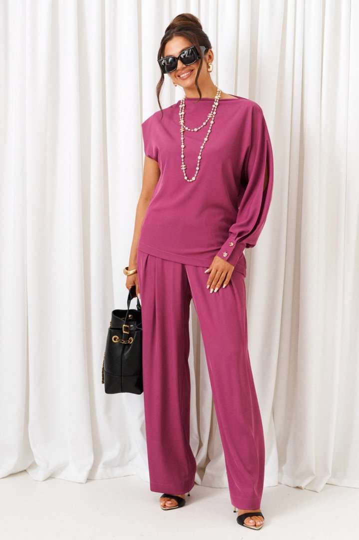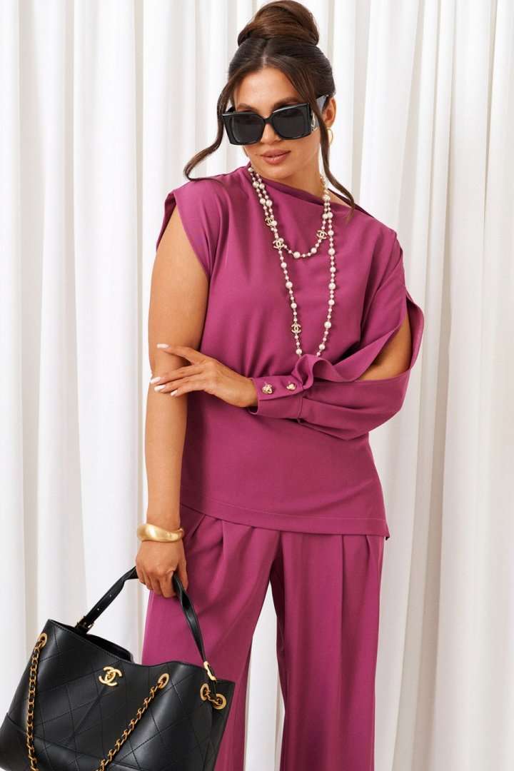 Яркий акцентный костюм - идеальный пример сочетания комфорта и стиля. Нарядно-повседневный костюм, состоящий из блузона и брюк, выполнен из смесовой ткани с содержанием вискозы, подчеркнет индивидуальность и неповторимость образа. Блузон полуприлегающего силуэта асимметричного кроя. Передняя часть цельная, слева с цельнокроеным длинным рукавом и справа с удлиненной линией плеча, чуть приспущенной, мягко закрывающее предплечье. Спинка цельная, слева с цельнокроеным рукавом и справа с удлиненной линией плеча, закрывающее предплечье. Горловина асимметричная: цельнокроеная стойка справа, переходящая слева в плечевую линию. Рукав свободный длинный с мягкими складками по низу и фиксируемый манжетой с двумя декоративными пуговицами. По центральному верхнему шву предусмотрен высокий разрез. Низ асимметричный, заканчивающийся слева в боковом шве небольшим разрезом. Брюки широкие фантазийного кроя со встречной складкой спереди от пояса. Высота посадки стандартная. В верхней части бокового шва предусмотрены функциональные карманы. Застежка боковая на потайную молнию слева. Задняя часть пояса на резинке, что придает изделию дополнительный комфорт при носке. Длина блузона (по середине спинки) ~ 70 см. Длина брюк с поясом ~ 108 см.