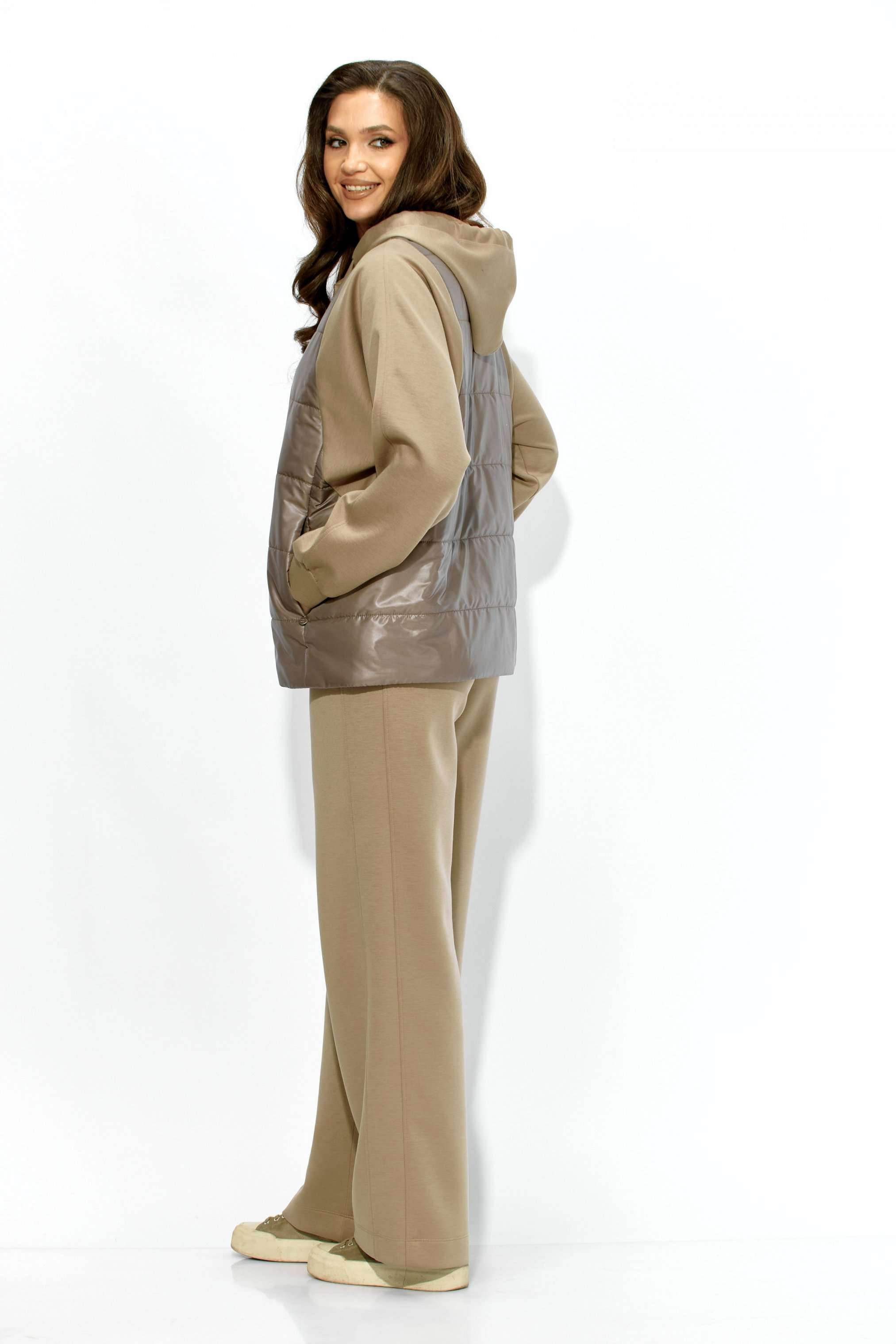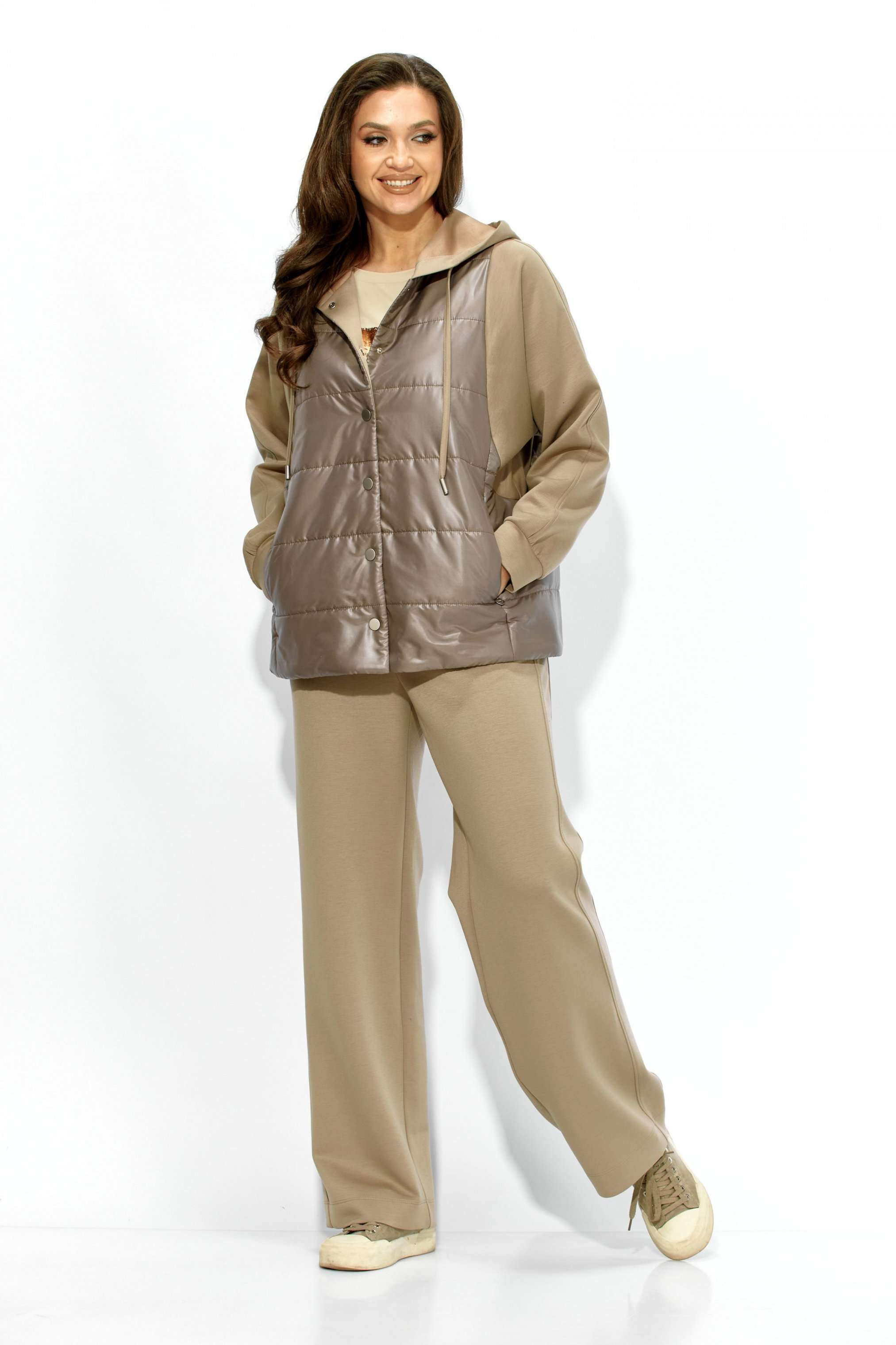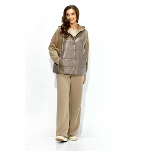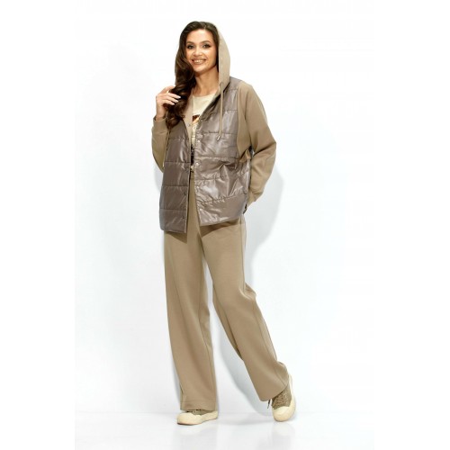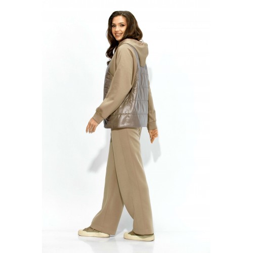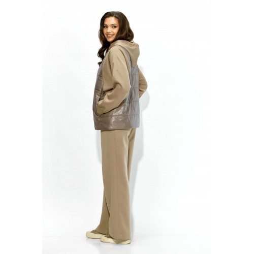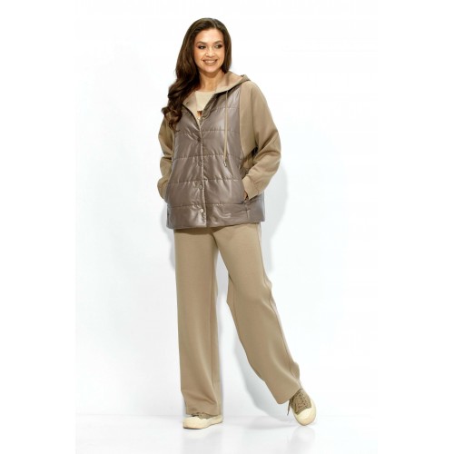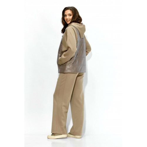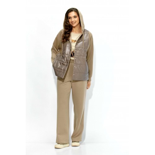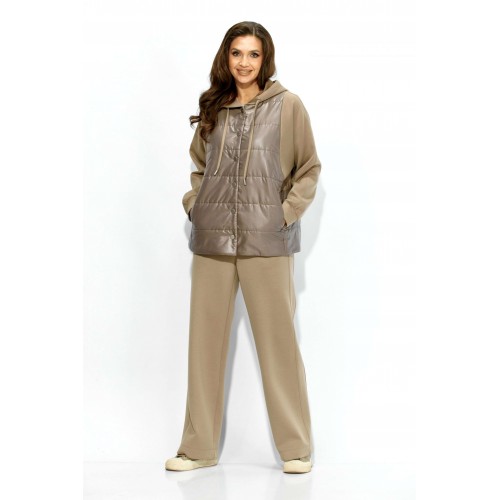 Комплект женский, 2х предметный, состоящий из куртки и брюк. Куртка прямого силуэта. Выполнена на сочетании стеганной плащевки на синтепоне (VS 100) и трикотажного полотна (фенди) Центральная часть переда и спинки из стежки. По переду центральная застежка на кнопки и карманы в рельефах. Горловина оформлена капюшоном с кулисой по краю. Рукав цельнокроеный , с манжетой снизу. Низ куртки по ширине регулируется внутренней кулисой (резинка) с фиксаторами. Стежка на подкладке. Брюки прямые. По боку подрезной лампас с отделочной строчкой и карманы. Пояс притачной, по переду гладкий, дальше с резинкой по кругу.