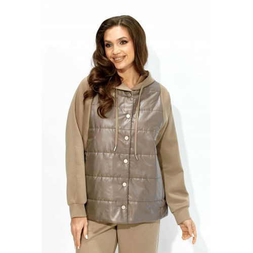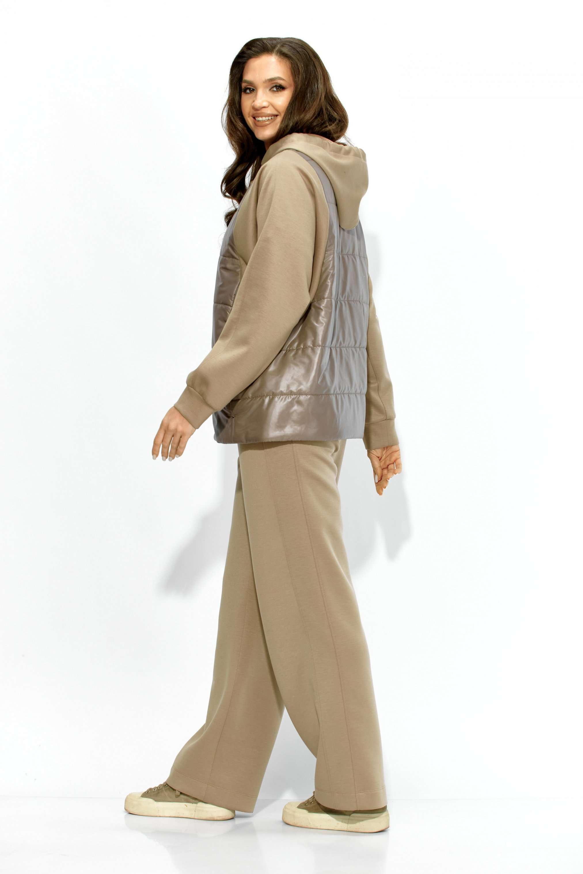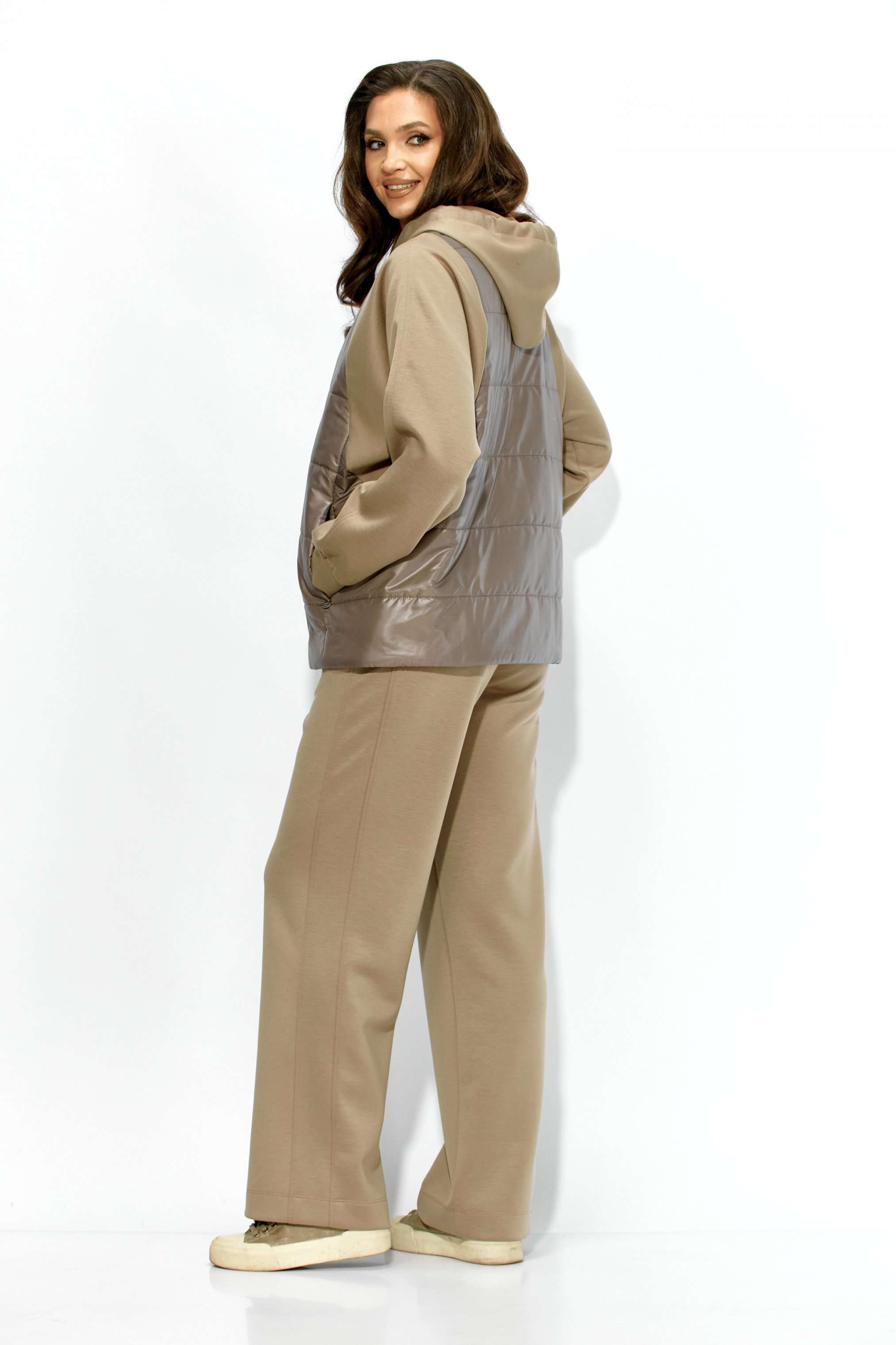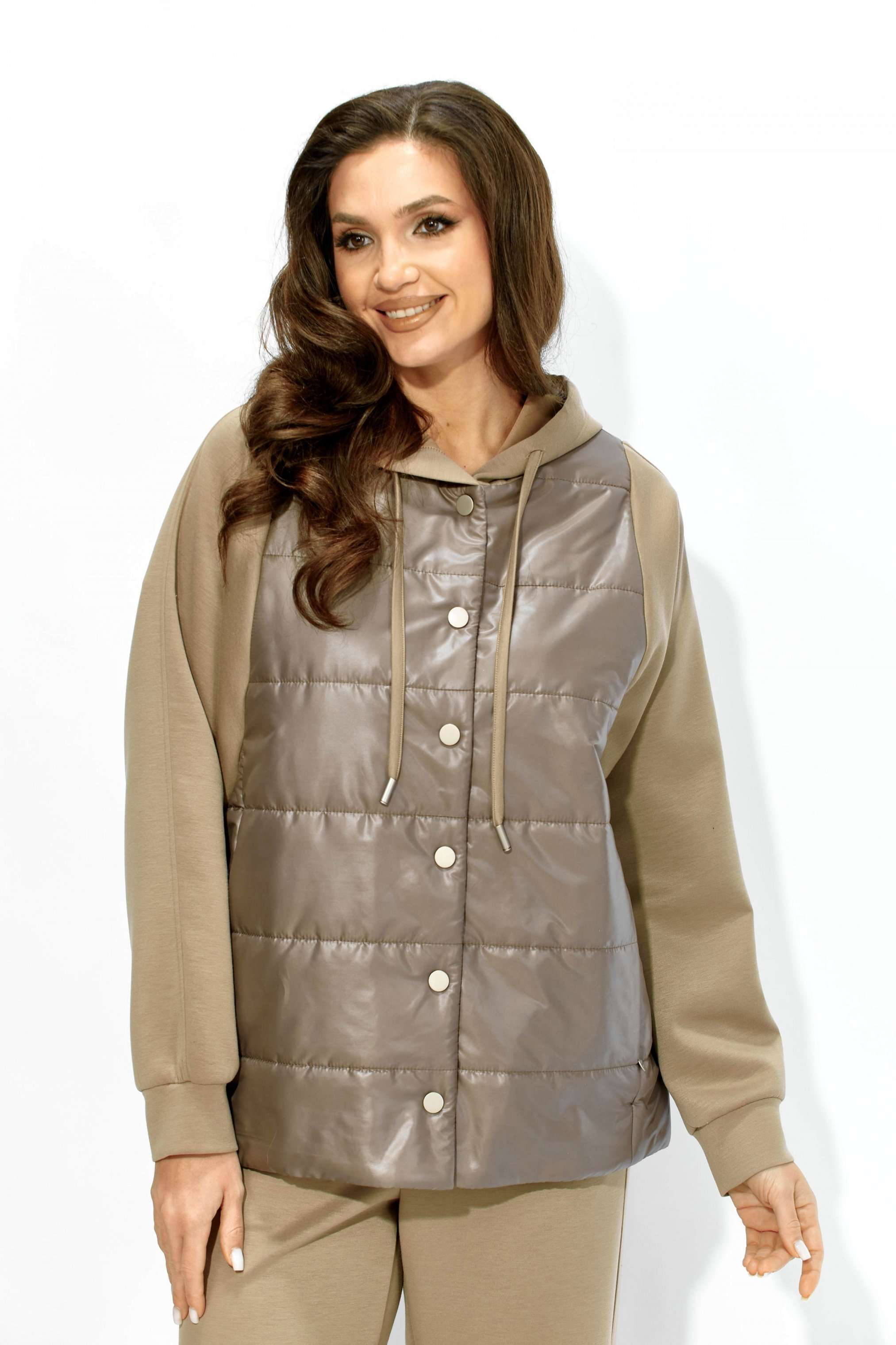 Комплект женский, 2х предметный, состоящий из куртки и брюк. Куртка прямого силуэта. Выполнена на сочетании стеганной плащевки на синтепоне (VS 100) и трикотажного полотна (фенди) Центральная часть переда и спинки из стежки. По переду центральная застежка на кнопки и карманы в рельефах. Горловина оформлена капюшоном с кулисой по краю. Рукав цельнокроеный , с манжетой снизу. Низ куртки по ширине регулируется внутренней кулисой (резинка) с фиксаторами. Стежка на подкладке. Брюки прямые. По боку подрезной лампас с отделочной строчкой и карманы. Пояс притачной, по переду гладкий, дальше с резинкой по кругу.