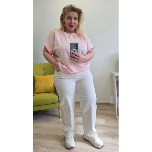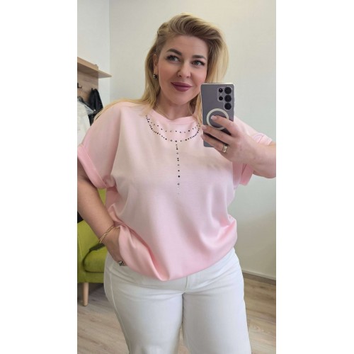 Блуза выполнена в современном минималистичном стиле с акцентным декором. Цельнокроеный рукав создает плавные линии силуэта, подчеркивая женственность фигуры. Отложная манжета по низу добавляет элемент классического кроя и обеспечивает аккуратную посадку. Эта блуза станет идеальным базовым элементом гардероба, сочетающим комфорт, стиль и элегантный декор. Блуза свободного «оверсайз» силуэта с округлой формой горловины. Рукав в блузе цельнокроеный с отложной мажетой по низу. Спинка без особенностей. Главным ярким акцентом в изделии служит декор по переду блузки чем-то напоминающий собой бусы из страз. Длина блузы 62 см, длина рукава 26,5 см (р 52-56), 29,5 см (р 58-62).