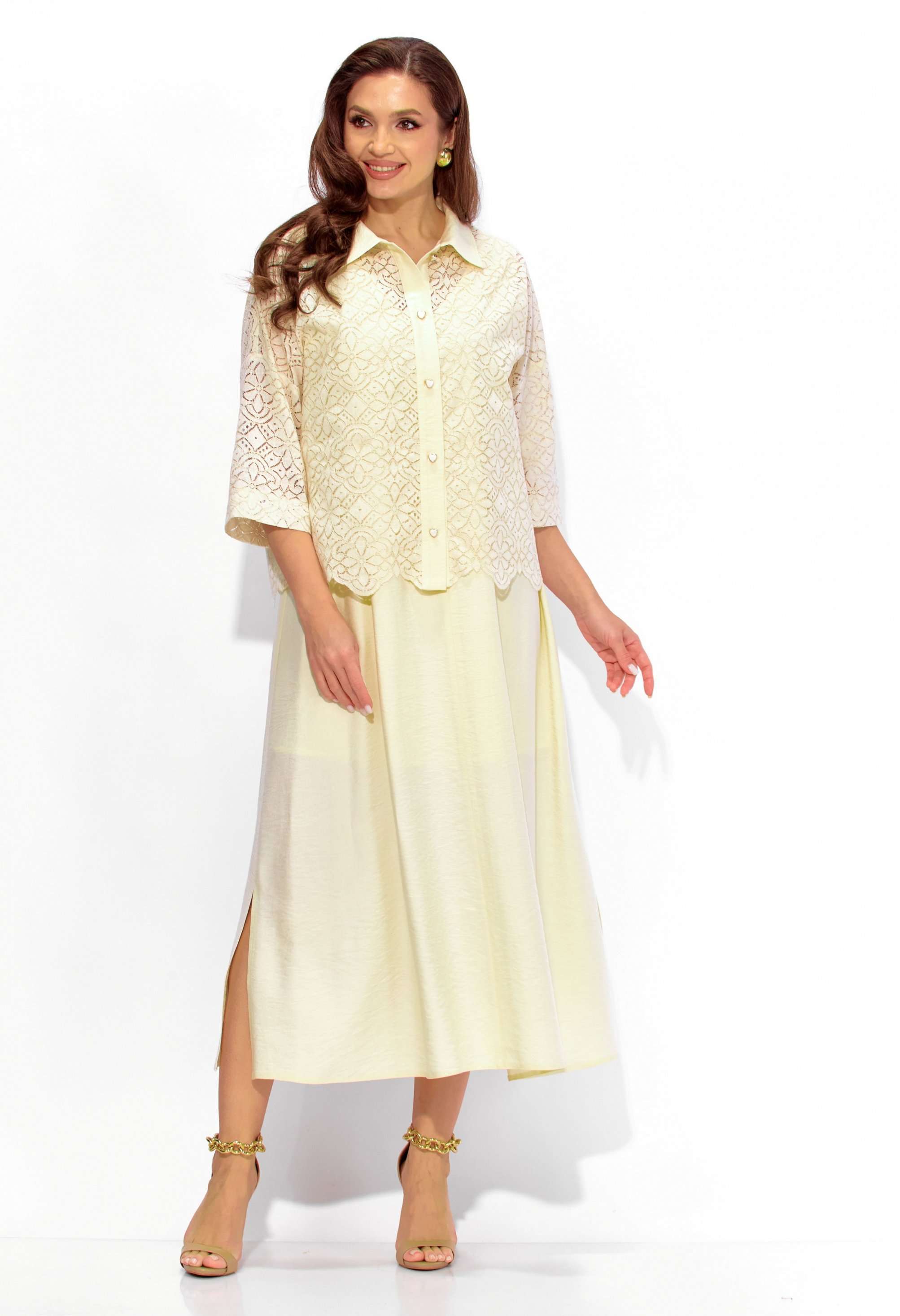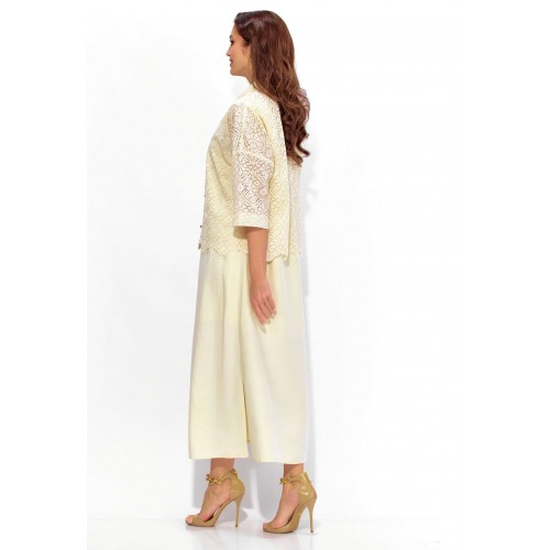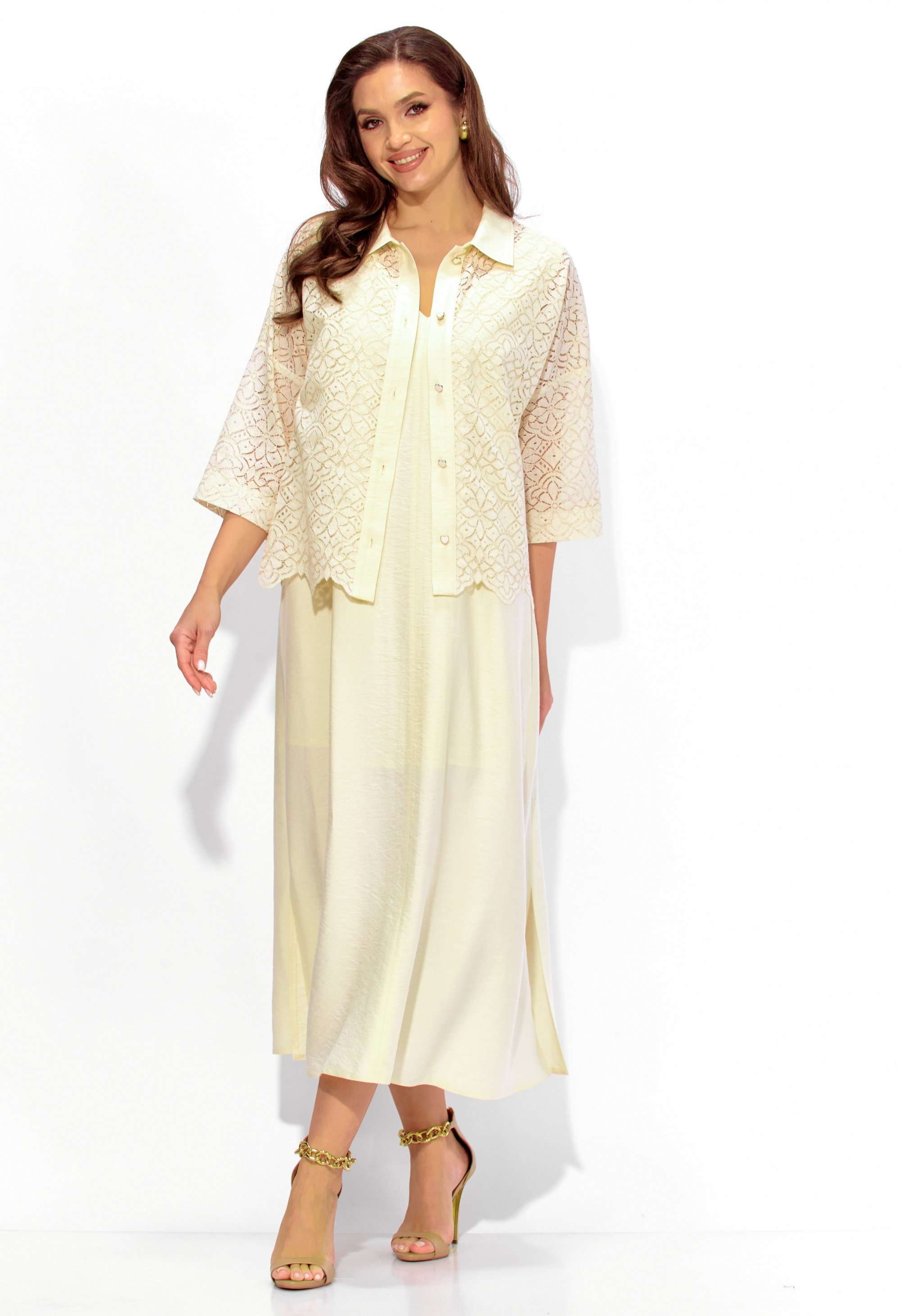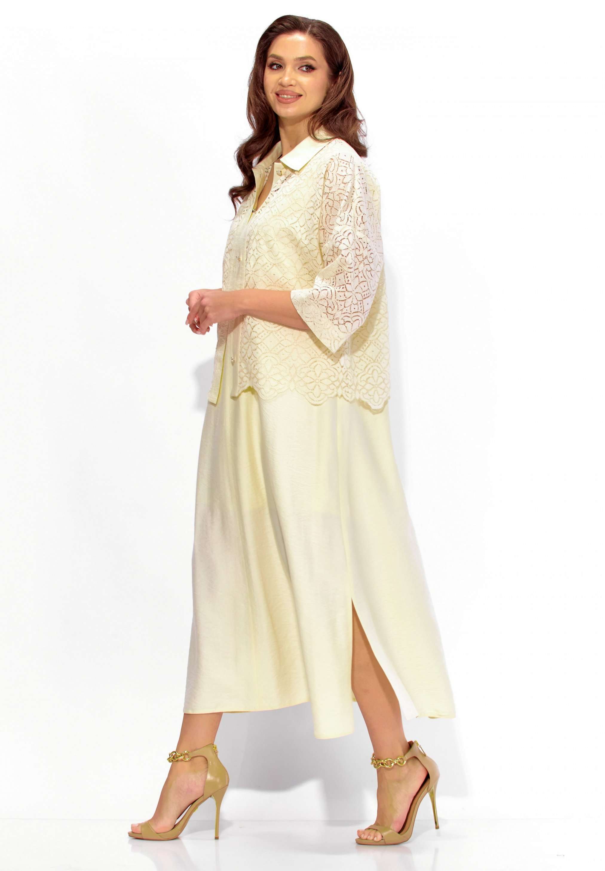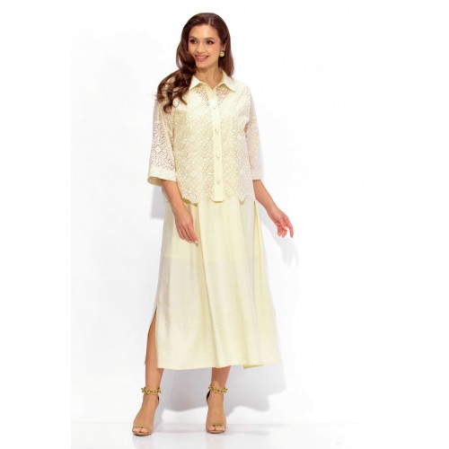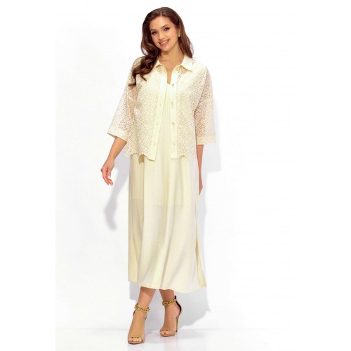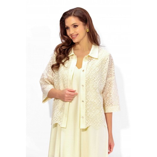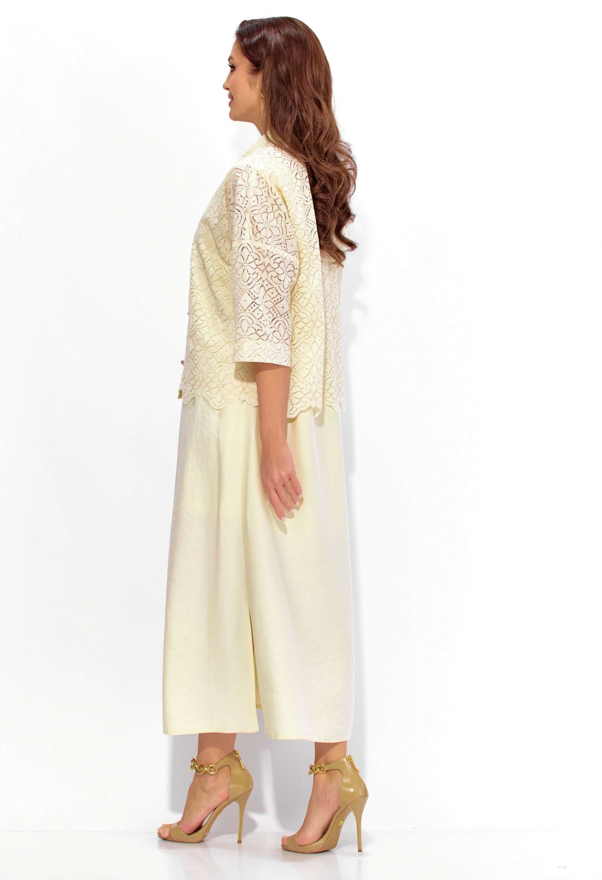 Комплект женский, 2х предметный, состоящий из облегченного кружевного жакета и платья. Жакет прямого силуэта, с рукавом длинной 3/4. Рукав со спущенной линией плеча. Горловина оформлена рубашечным воротником. Застежка центральная, с планкой на петли и пуговицы. Воротник и планка выполнены из отделочной ткани. Низ жакета фигурный. Платье А-силуэта, расширенное к низу, из текстильной, вискозной ткани, на подкладке. Платье без рукавов. По переду и спинке средний шов и Y-образный вырез горловины. По боковым швам, снизу, разрезы.