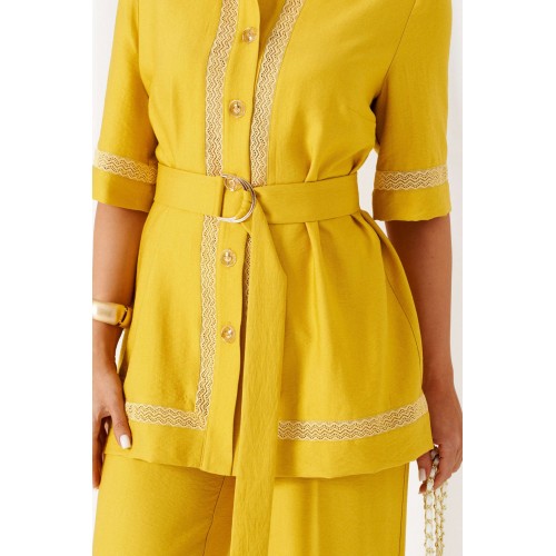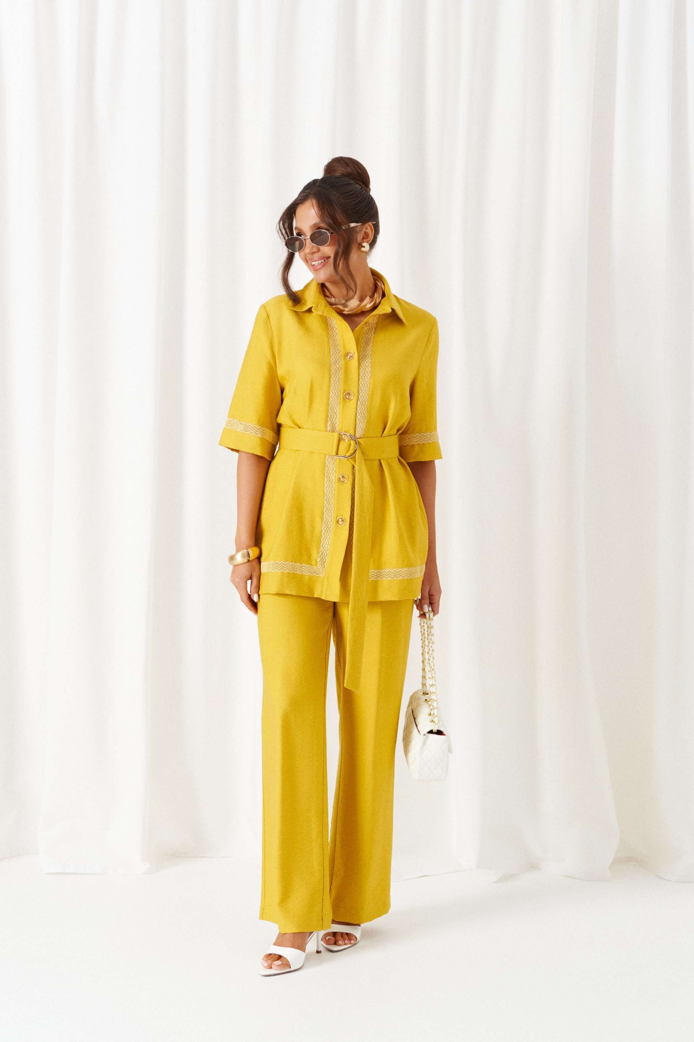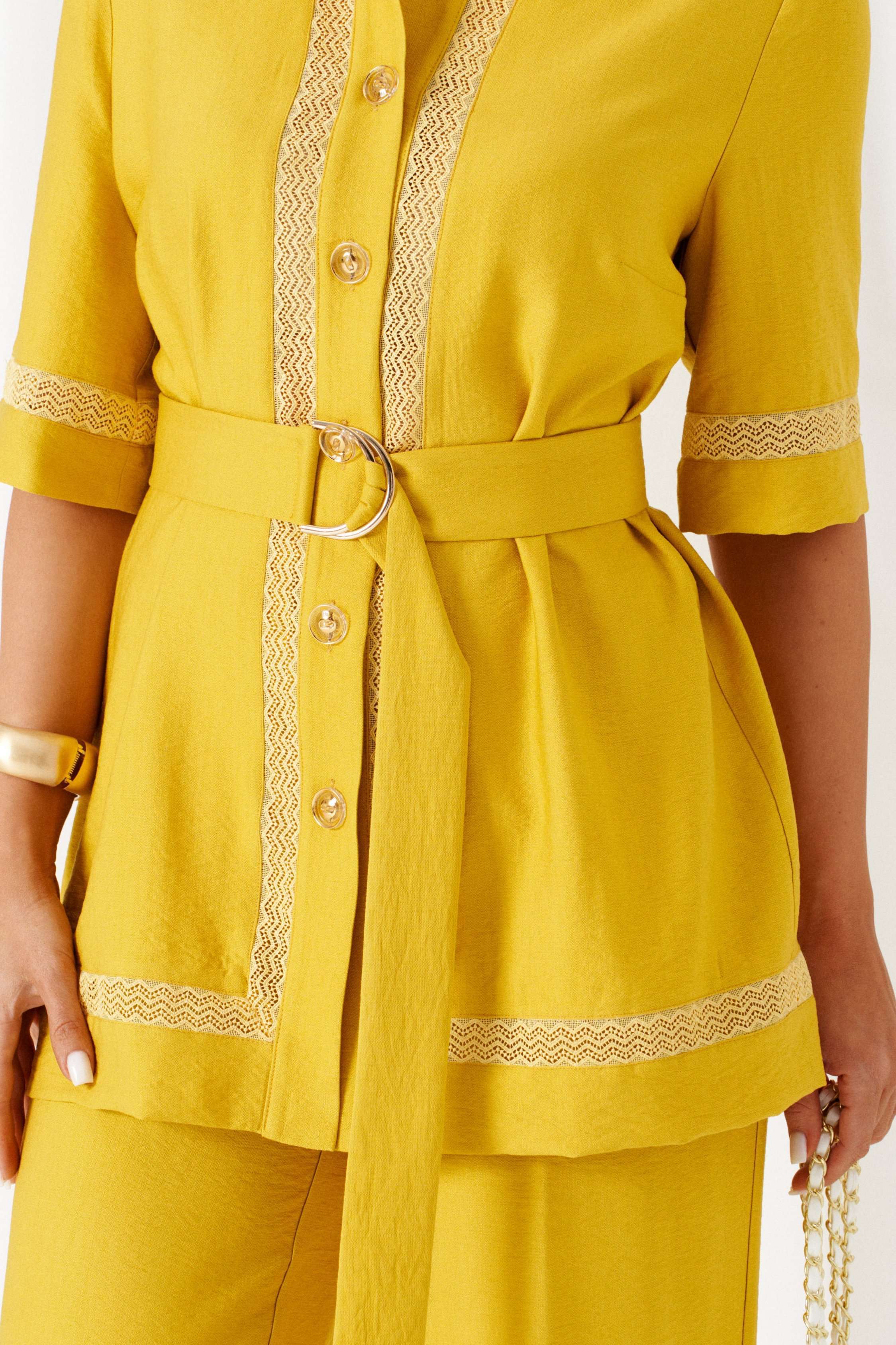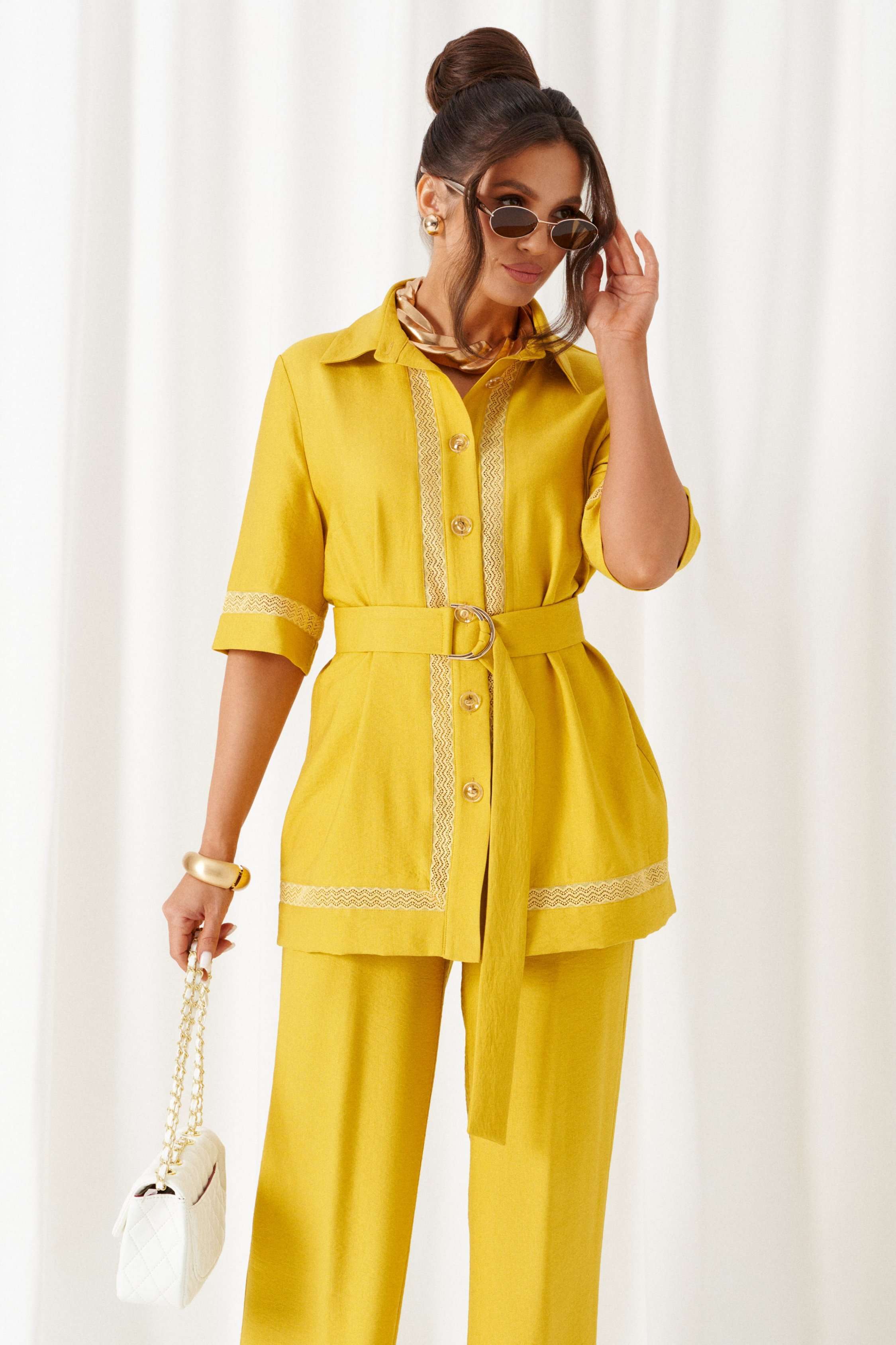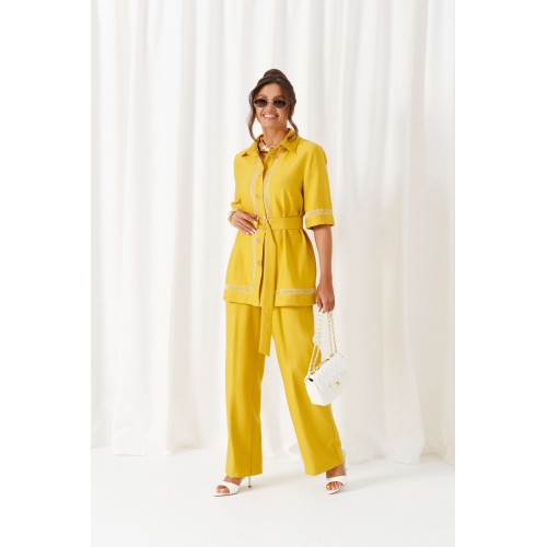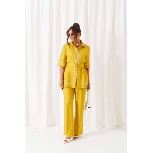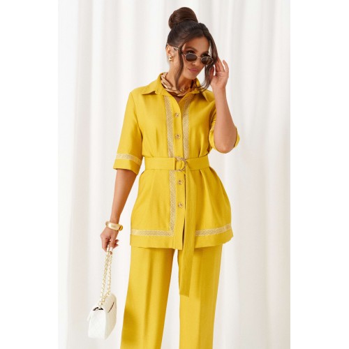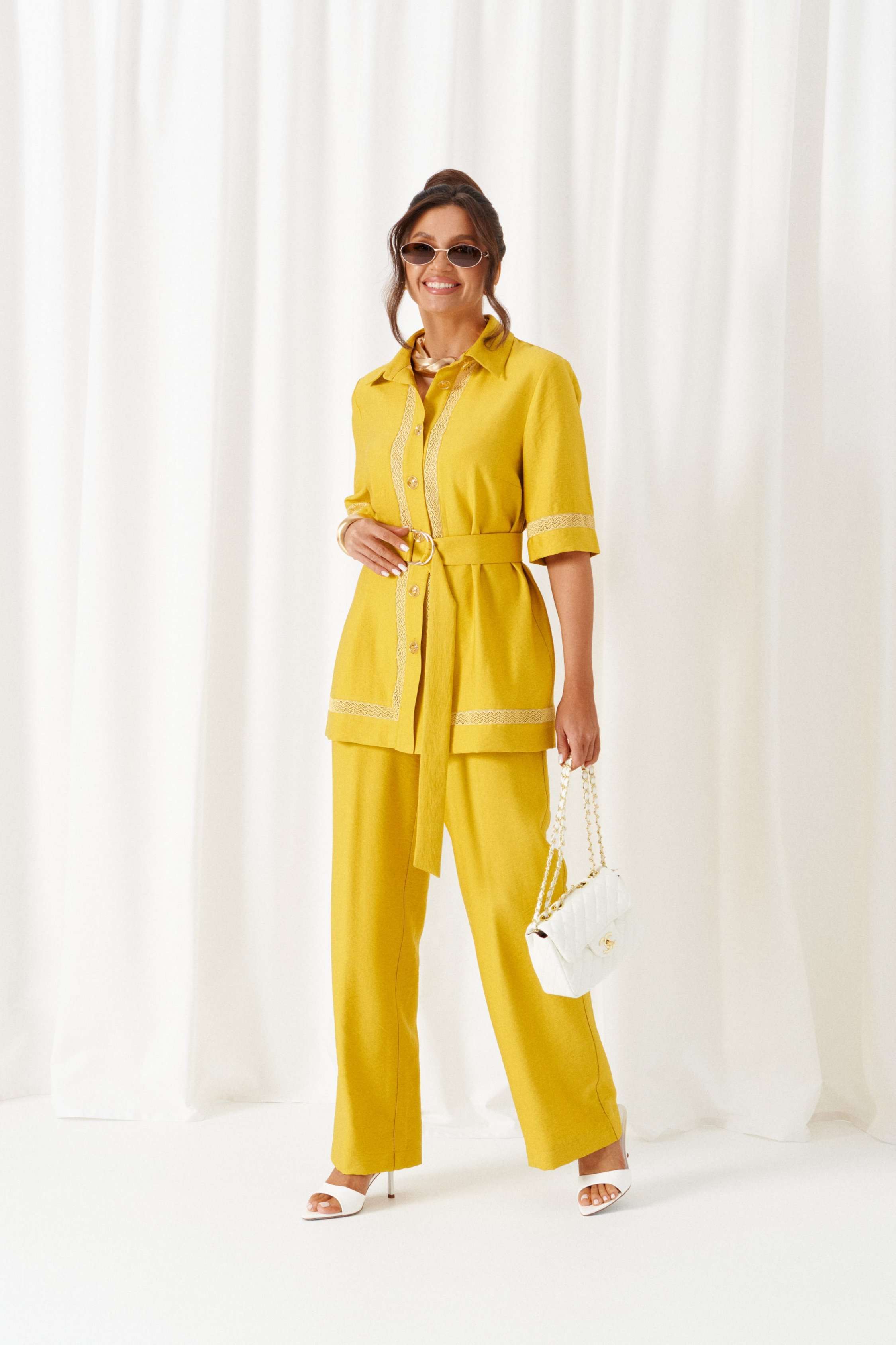 Женский льняной костюм из смесовой ткани с натуральным составом, акцентные кружевные детали и безупречные любимые оттенки. Созданный в расслабленном крое с подчеркнутыми деталями, костюм позволит чувствовать себя комфортно и непринужденно. Стильный костюм состоит из блузы и брюк, выполнен из мягкой ткани с волокнами льна и вискозы, практичен в носке. Блуза полуприлегающего силуэта, длиной до середины бедра с пояском-завязкой. Передняя часть из двух половинок, с нагрудными вытачками от бокового шва и вставками из кружева по борту и низу. Спинка цельная, низ отделан кружевной тесьмой аналогично переду. Воротник классический стояче-отложной на отрезной стойке. Рукав втачной, одношовный длиной до локтя, по низу вставлена отделочная кружевная тесьма. Застежка центральная на петли и пуговицы. Низ прямой. Брюки длинные, прямые свободные. Посадка стандартная, крой классический. Пояс притачной, шириной 4см с эластичной тесьмой по кругу. длина блузы (по среднему шву спинки) - 72 см. длина рукава блузы – 33 см. длина брюк (по боковому шву с поясом) – 108 см.