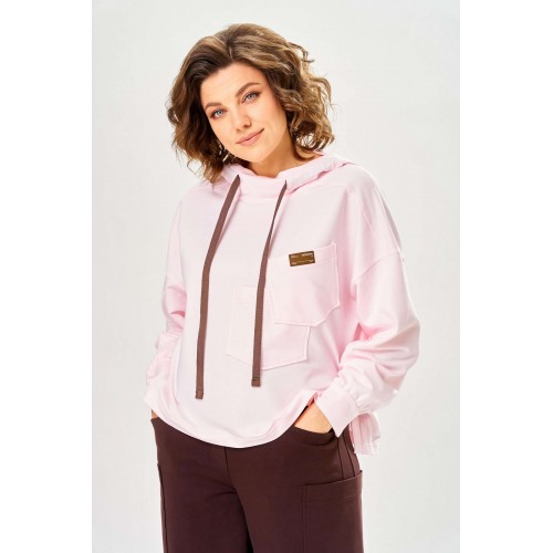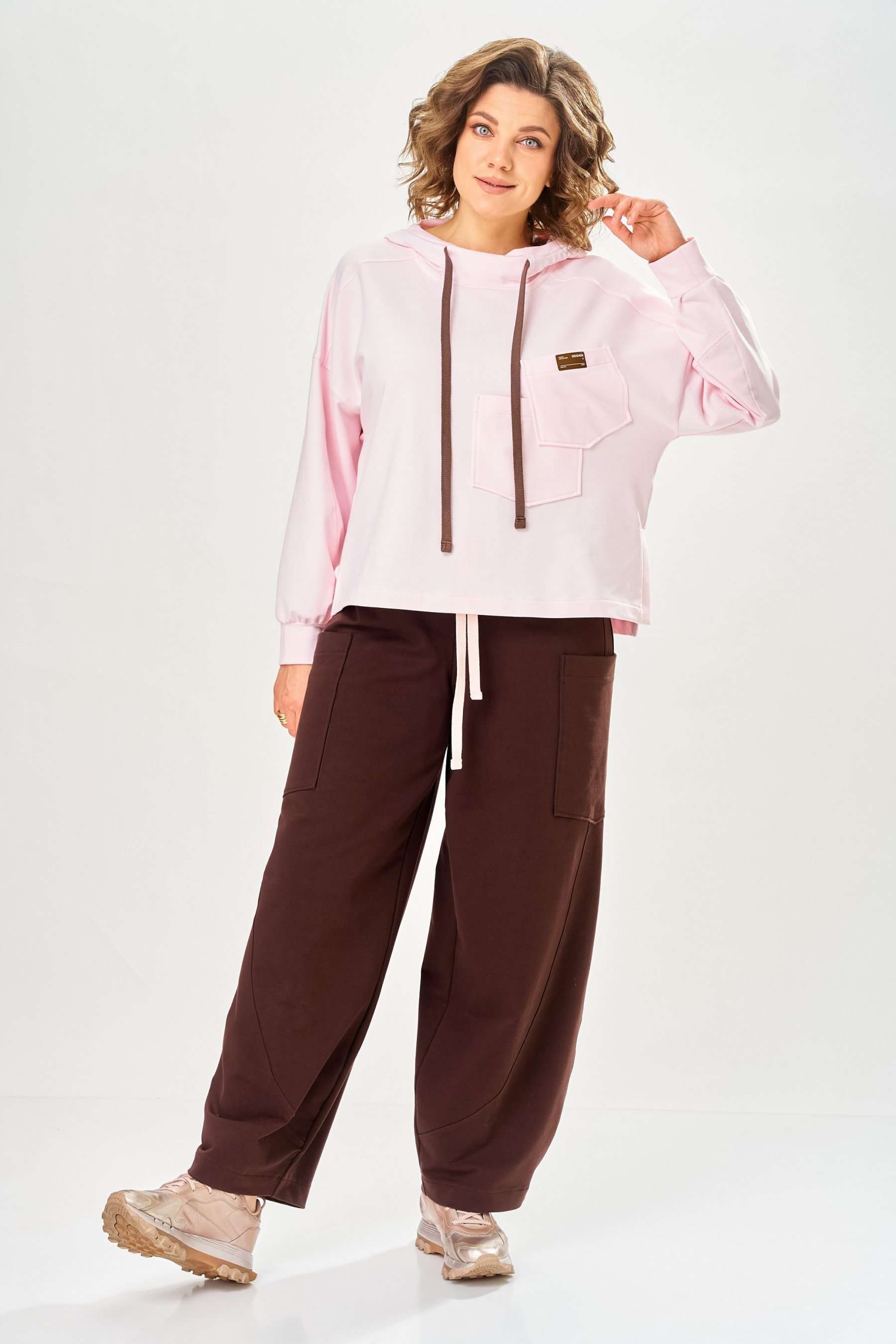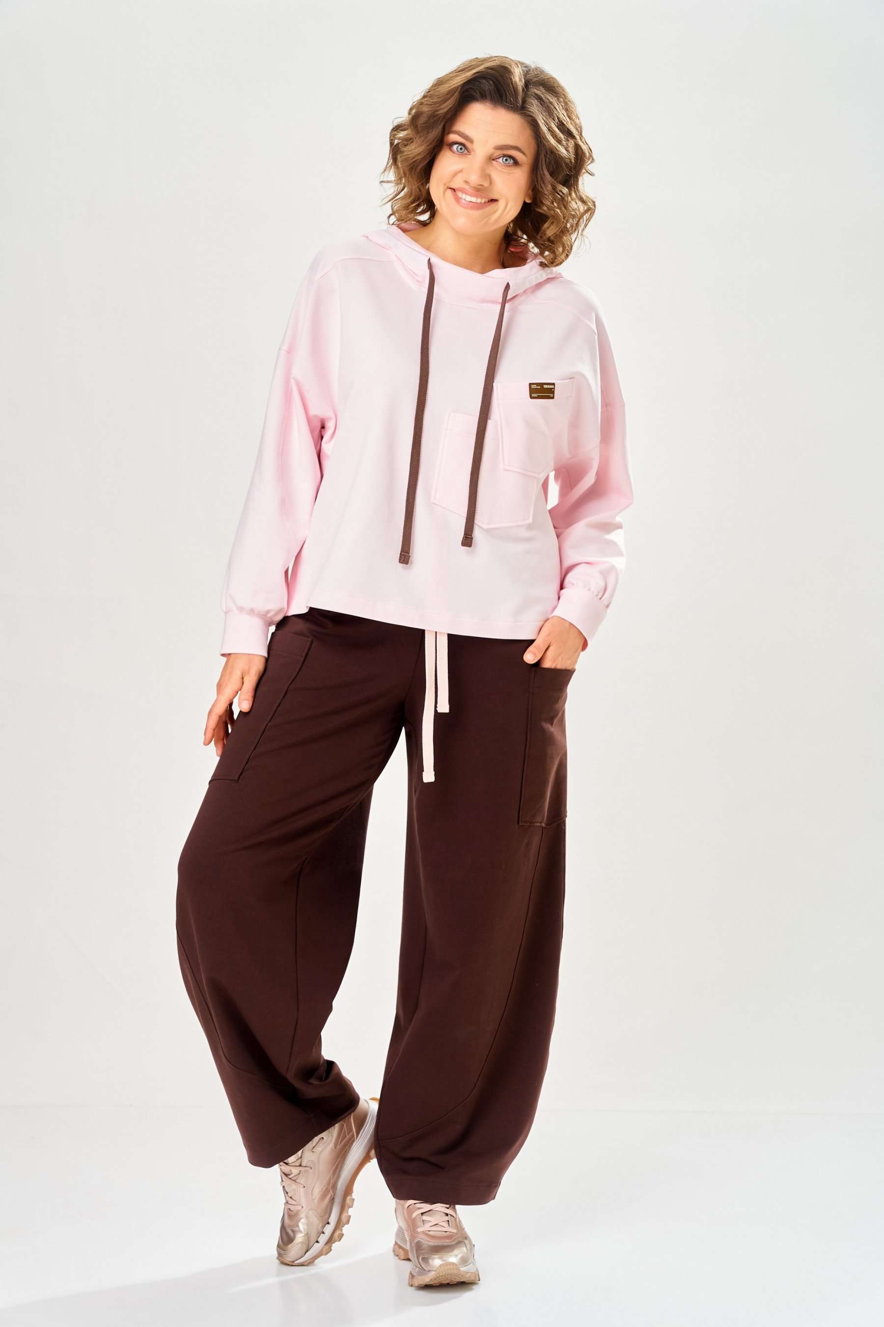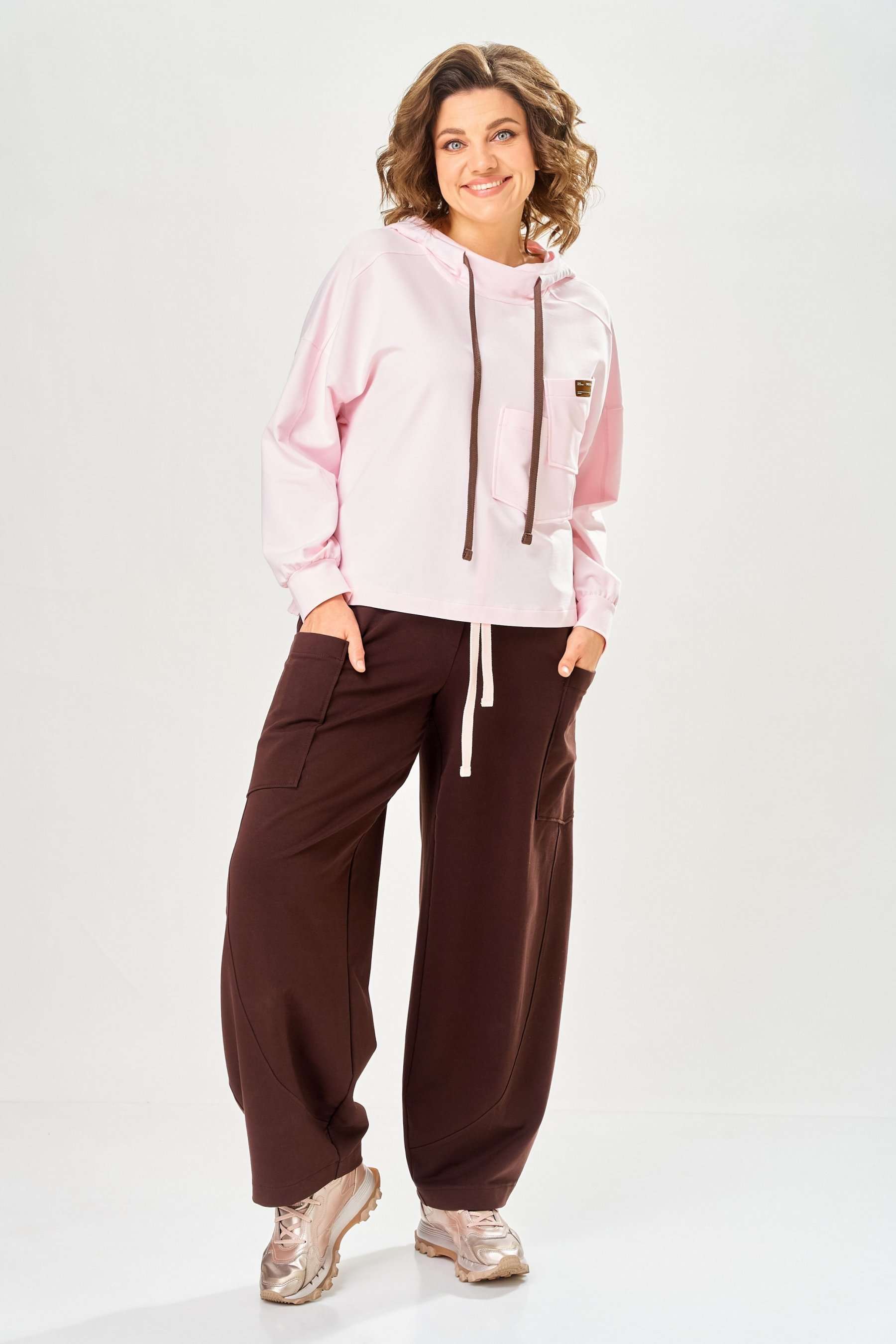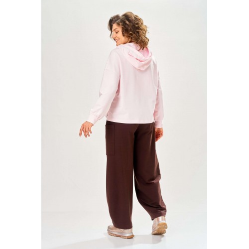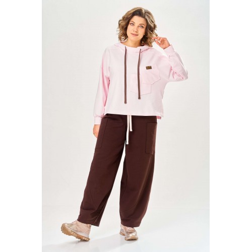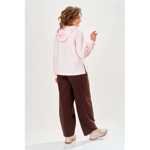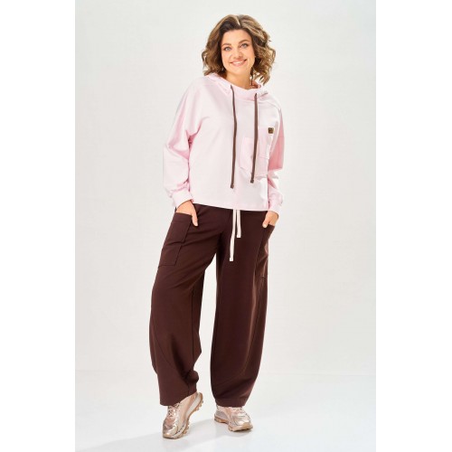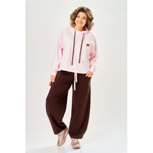 Стильный женский костюм, выполнен из футера. Состоит из свитшота и брюк. Свитшот свободного силуэта со спущенной линией плеча. Горловина оформлена капюшоном, по переду два накладных кармана. В боковых швах разрезы. Рукава с манжетом и сборкой по низу. На кармане декоративная нашивка. Брюки свободного силуэта, заужены к низу. В боковых швах карманы с подрезным бочком, на уровне бедер накладные карманы. Верх брюк оформлен поясом на резинке. В пояс вставлен шнур. Длина свитшота – 58 см Длина рукава – 44 см Ширина плеча – 25 см Длина брюк по боковому срезу – 108 см Длина брюк по шаговому шву – 78 см