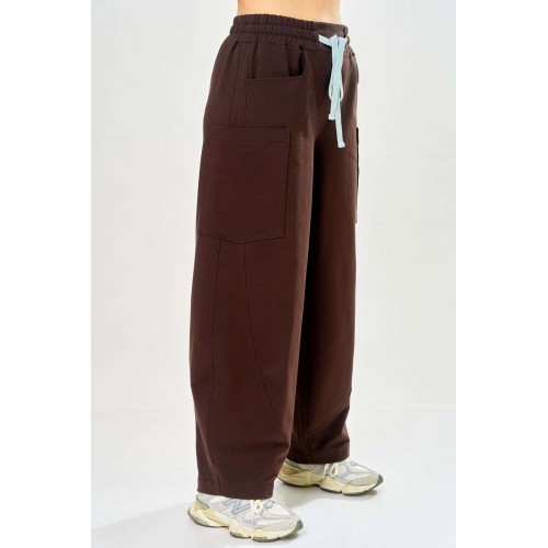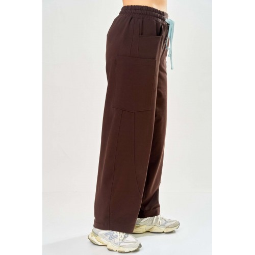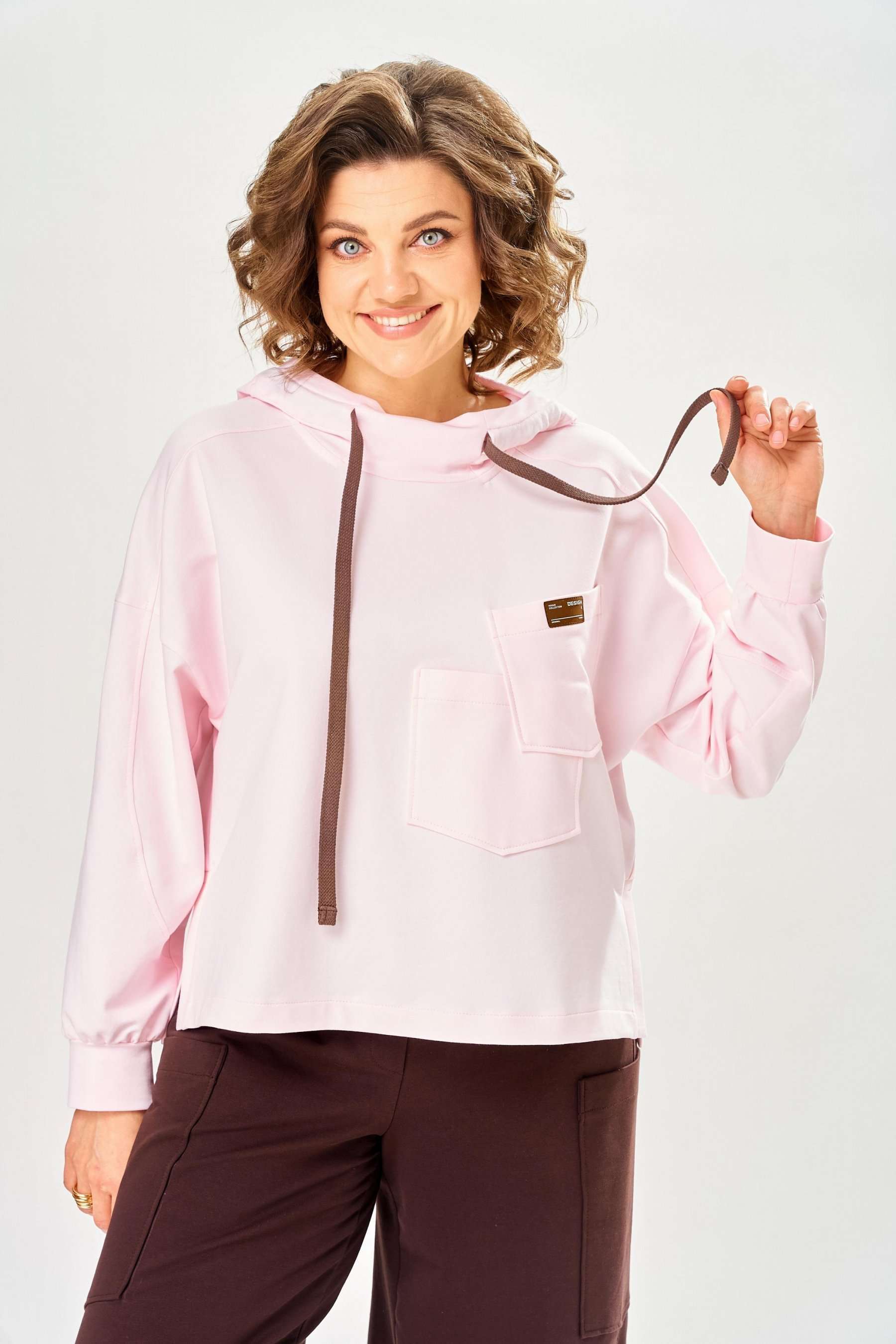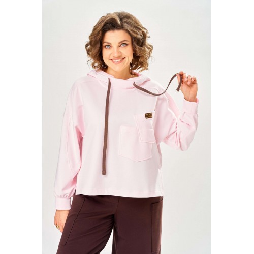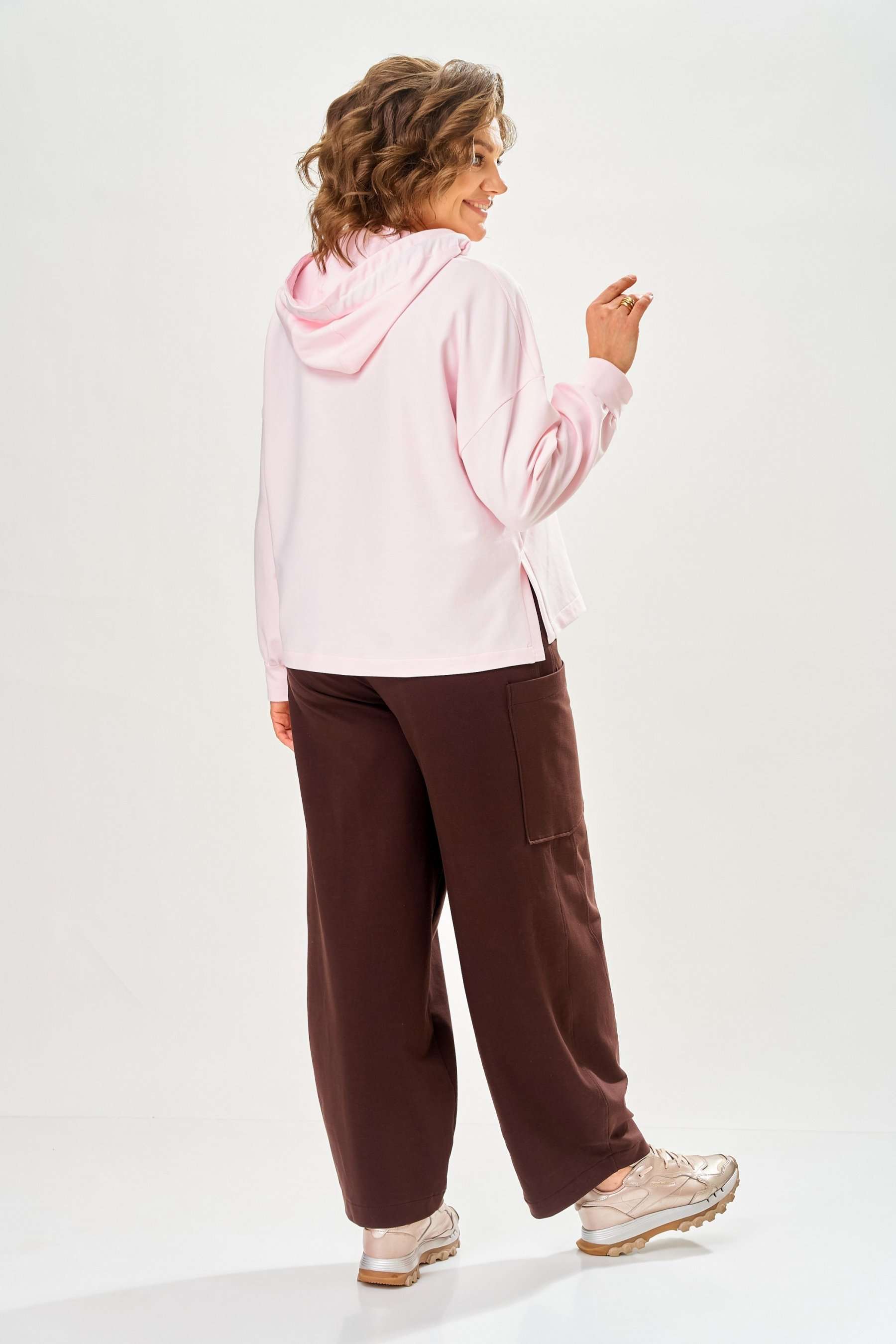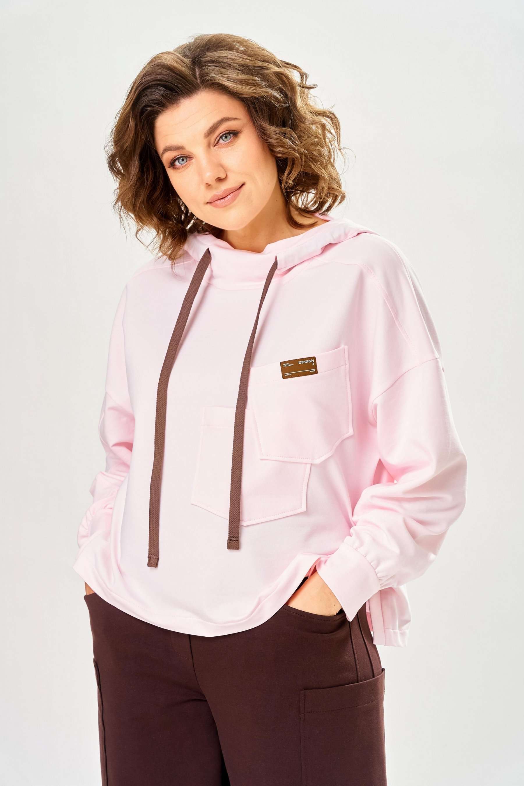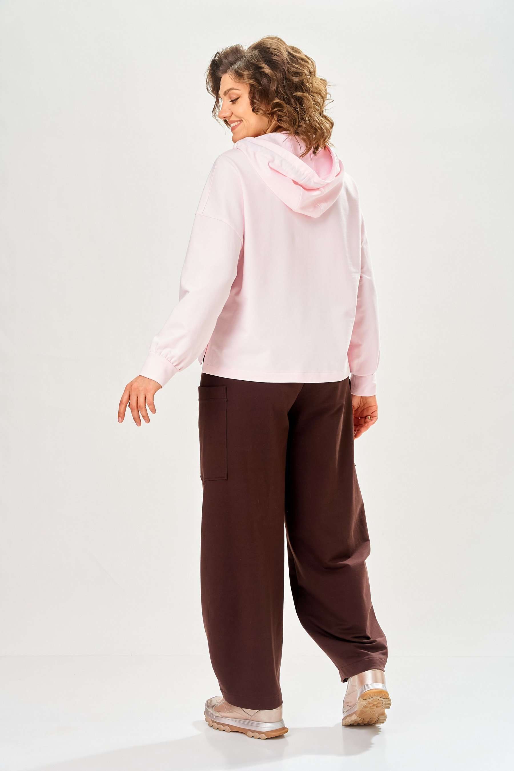 Стильный женский костюм, выполнен из футера. Состоит из свитшота и брюк. Свитшот свободного силуэта со спущенной линией плеча. Горловина оформлена капюшоном, по переду два накладных кармана. В боковых швах разрезы. Рукава с манжетом и сборкой по низу. На кармане декоративная нашивка. Брюки свободного силуэта, заужены к низу. В боковых швах карманы с подрезным бочком, на уровне бедер накладные карманы. Верх брюк оформлен поясом на резинке. В пояс вставлен шнур. Длина свитшота – 58 см Длина рукава – 44 см Ширина плеча – 25 см Длина брюк по боковому срезу – 108 см Длина брюк по шаговому шву – 78 см