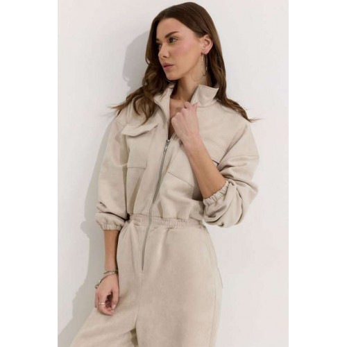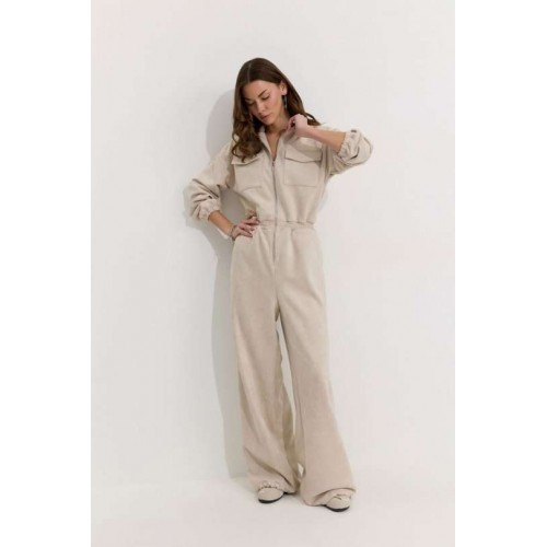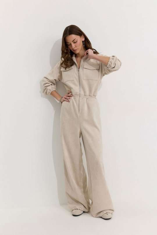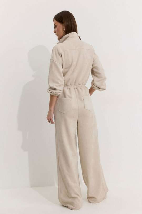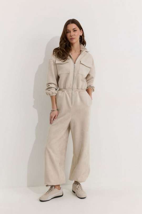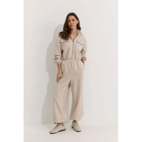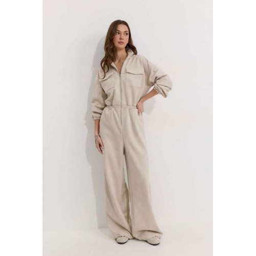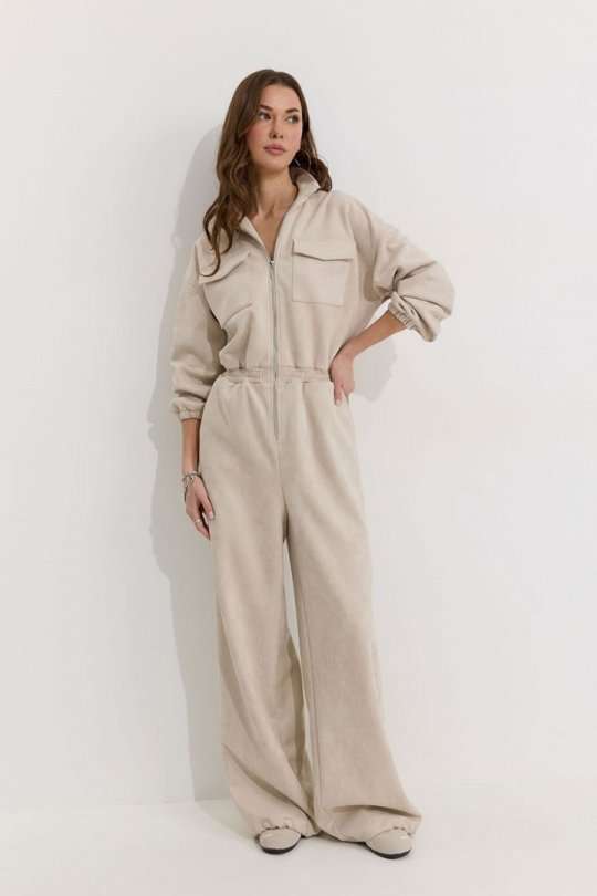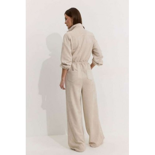 Комбинезон полуприлегающего силуэта с расширенными книзу брюками из трикотажного полотна “замша”. Горловина-стойка, по центру застежка на молнию. Рукав со спущенной линией плеча, по низу эластичная тесьма(резинка). По переду и спинке в районе талии притачной пояс, в пояс вставлена эластичная тесьма(резинка). По переду накладные карманы с клапанами. Брюки прямого силуэта, по переду и спинке карманы. По низу брюк предусмотрена кулиса с завязкой для регулирования степени прилегания. Обращаем ваше внимание, что фурнитура может отличаться от фото. Подходит на рост 164-170 см. Длина комбинезона (44-48р - 158см)(50-54р - 160см). Длина рукава от горловины (44-48р - 76см)(50-54р - 77см). Длина брюк от талии (44-48р - 110см)(50-54р - 111см).