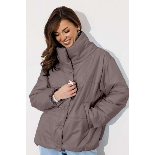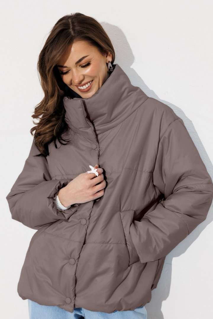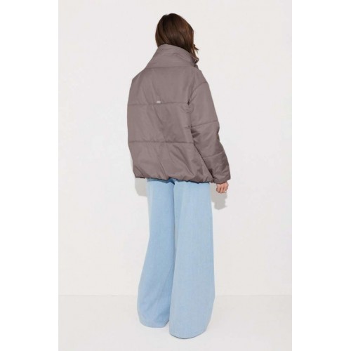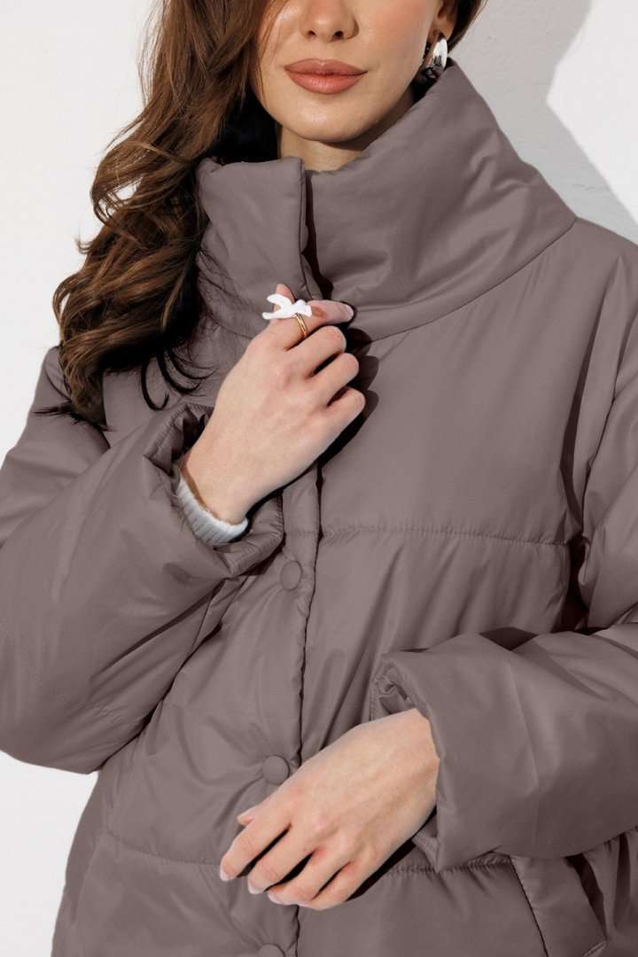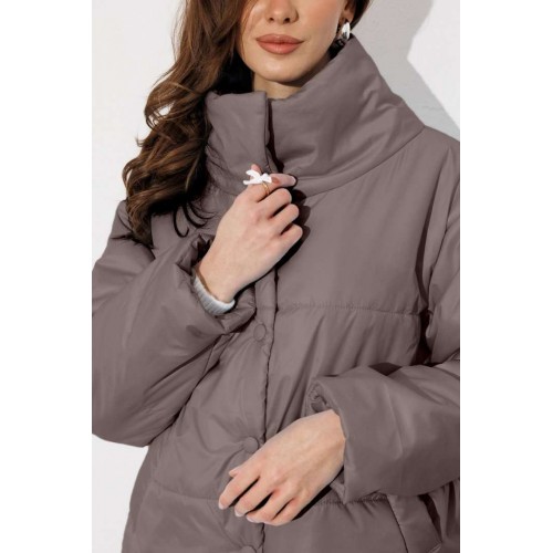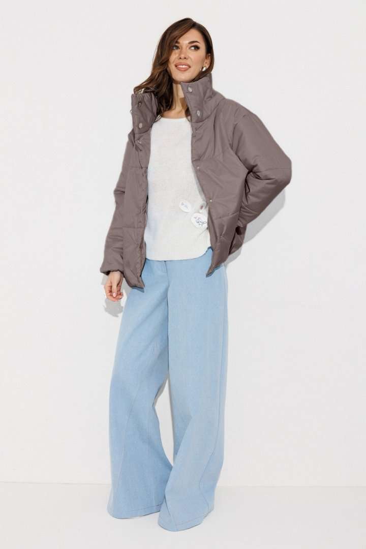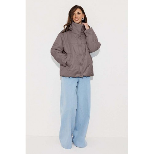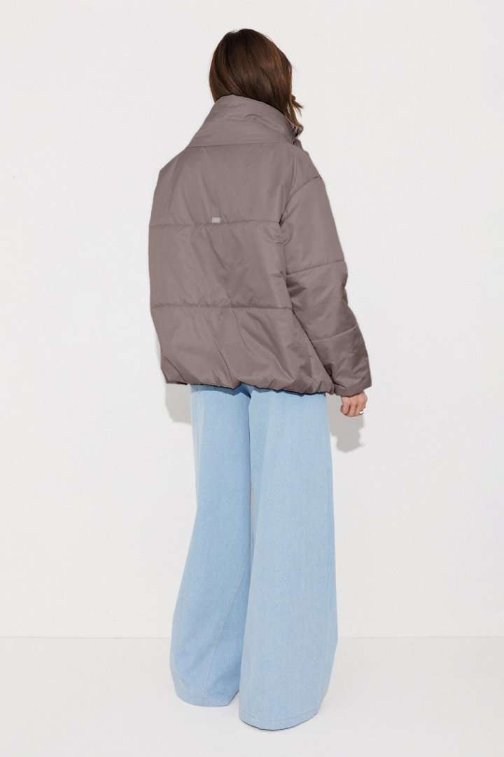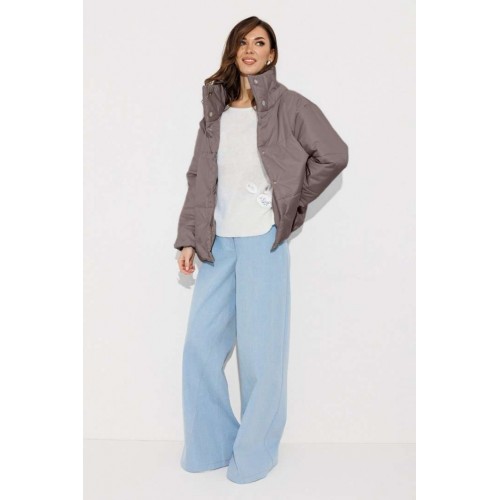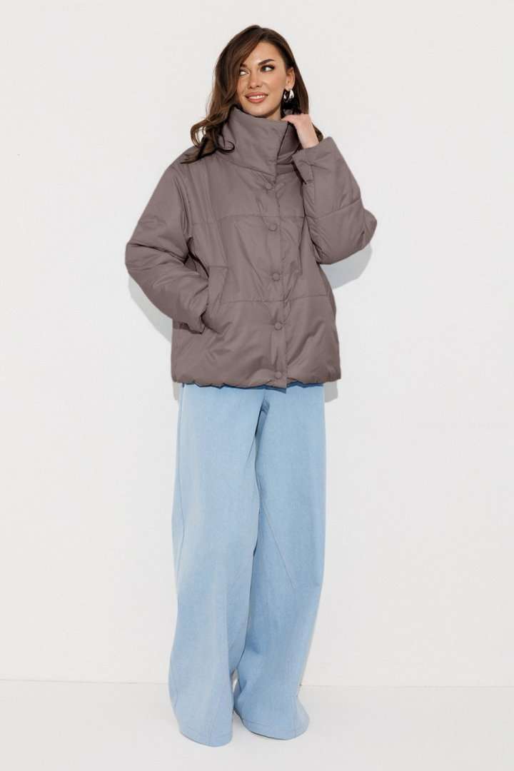 Куртка демисезонная (t до -5С) прямого силуэта с втачным рукавом внизу на резинке и со спущенной линией плеча. Полочка с центральной застёжкой на кнопки и карманы-листочки. По спинке нашивка. Воротник-стойка с застежкой на пришивные кнопки. Полочка и спинка по низу на резинке. Куртка из плащевой ткани со стежкой на синтепоне (isosoft 150г/м²) и подкладке.