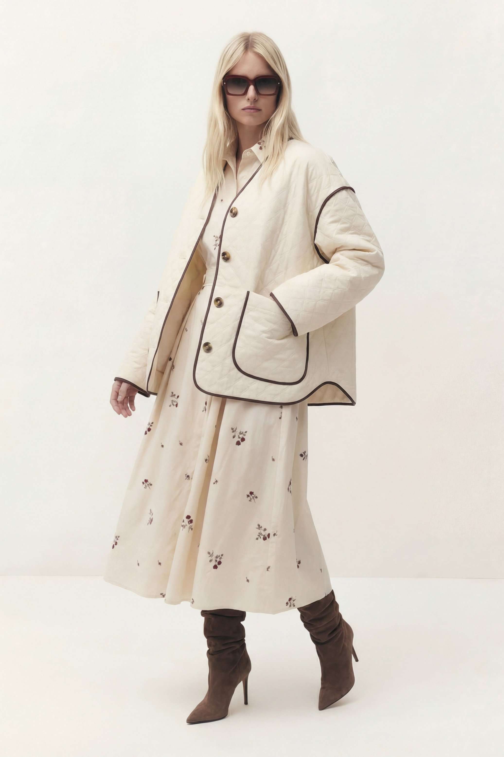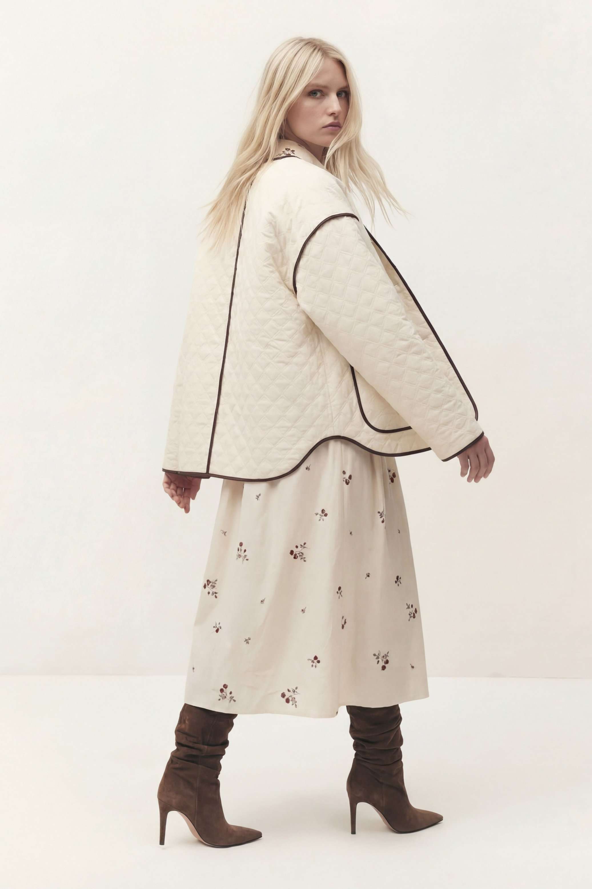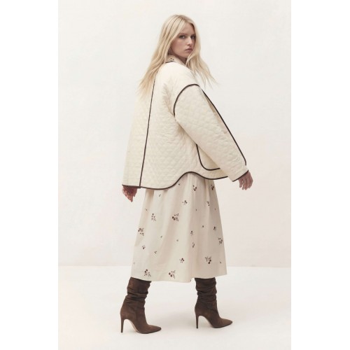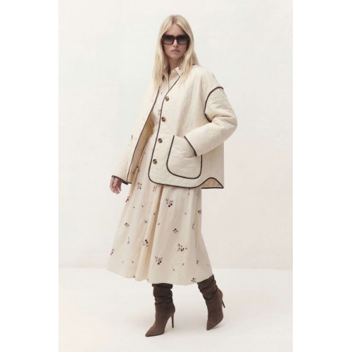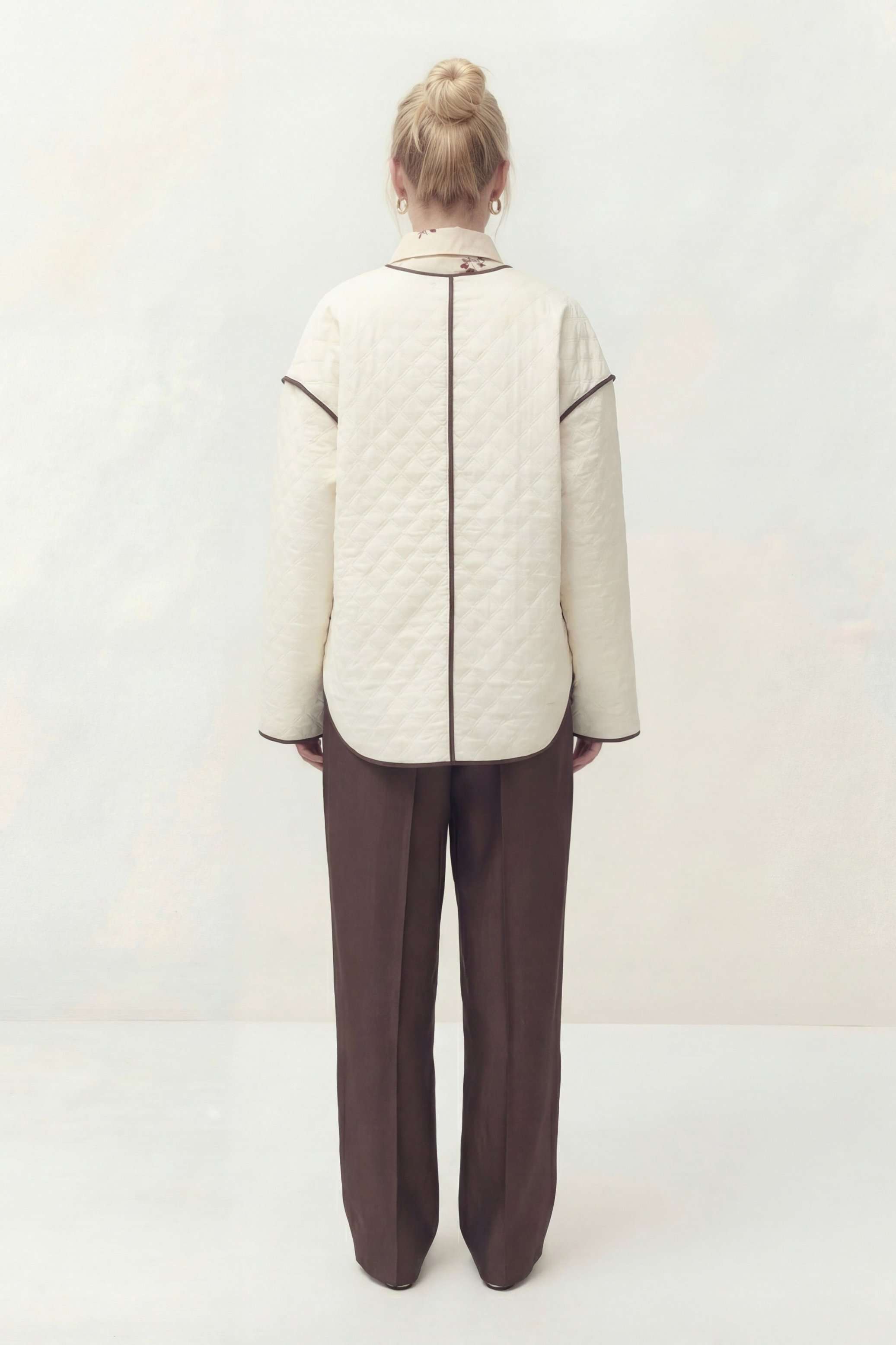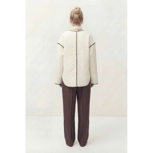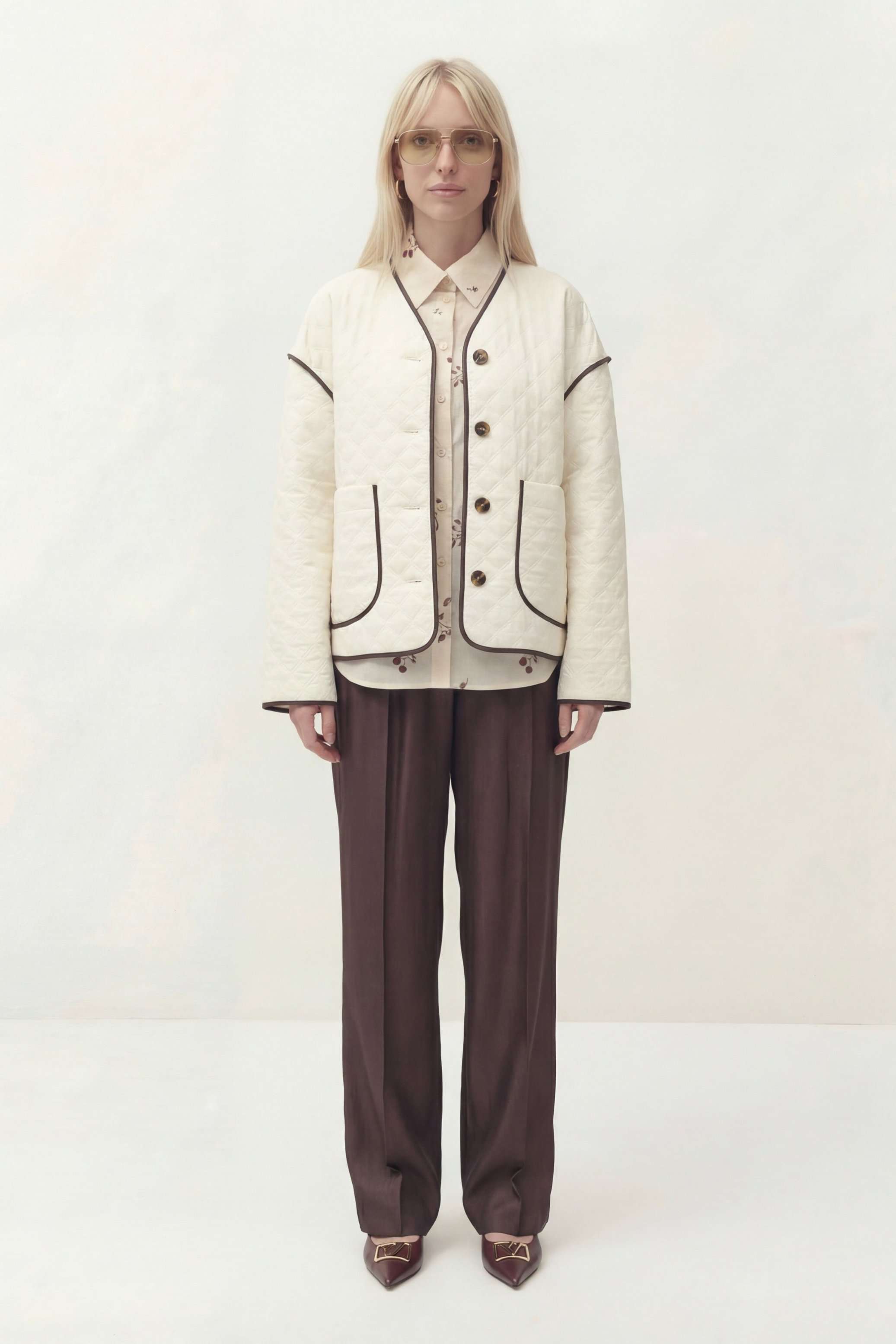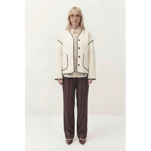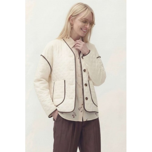 Куртка свободного кроя, облегченная, без подкладки и синтепона. Линия плеча спущена, рукав длинный. V-образный вырез горловины. Застежка однобортная на петли и пуговицы. По бокам накладные карманы. По спинке средний шов. Шов втачивания рукава, низ рукава, горловина, борт, карман, средний шов спинки обработан окантовкой из отделочной ткани. Куртка: Длина по спинке от высшей точки горловины: 73 см Длина рукава от горловины: 76 см ОГ: 122-126-130-134-138-142 см (размер 42-44-46-48-50-52)