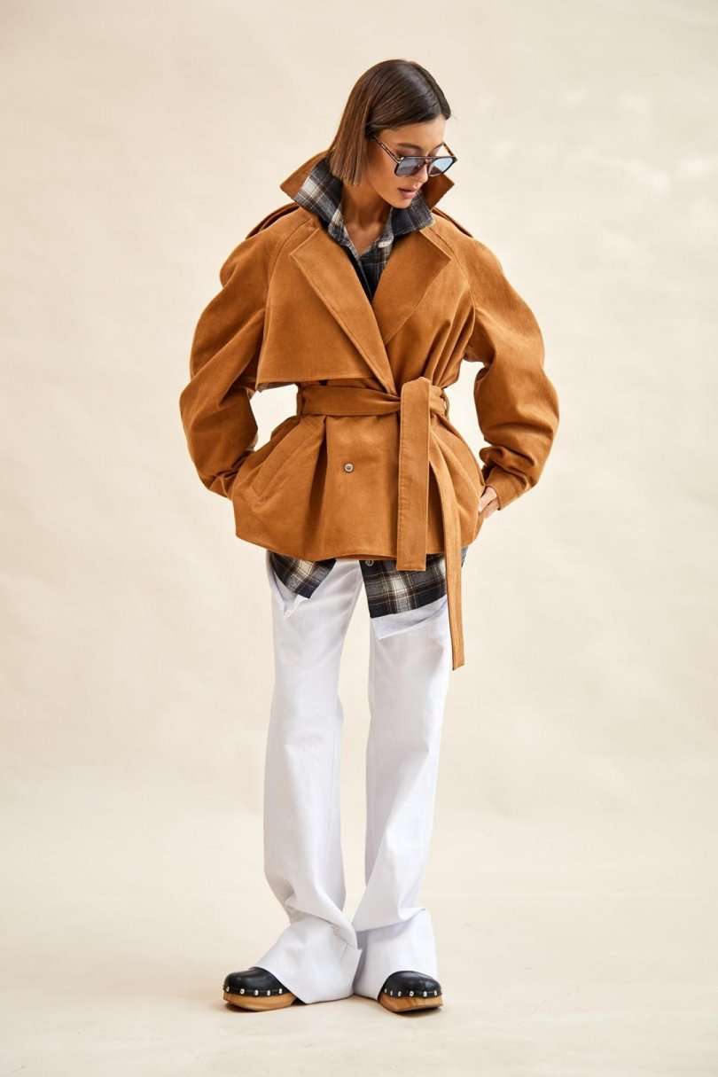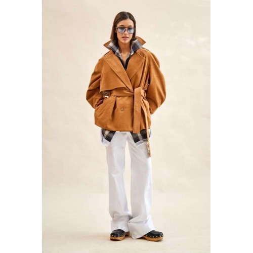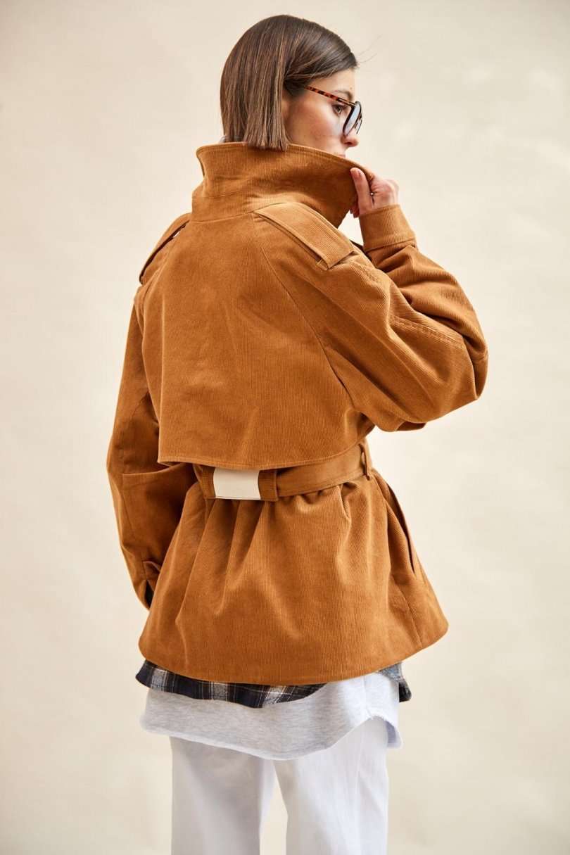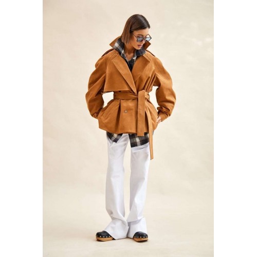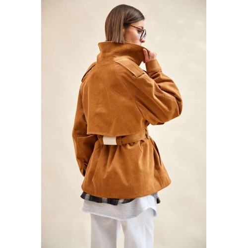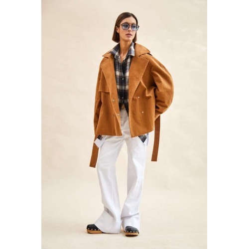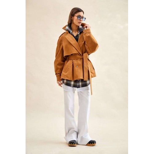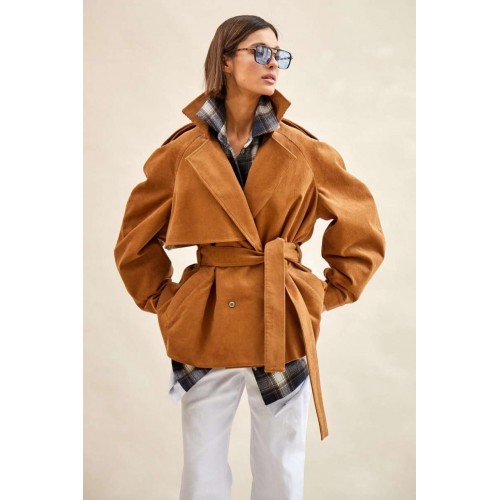 Тренч укороченный из вельвета: - расширенный силуэт; - двубортная застёжка на кнопки; - наклонные карманы с листочкой; - воротник пиджачного типа; - отлетная кокетка по спинке и переду; - рукав-реглан, двухшовный, со складками по локтевому шву, с прямыми манжетами с застёжкой на кнопку; - двойная пата по плечу; - широкая шлевка с кожаной этикеткой и тиснением; - съёмный пояс из основной ткани; - на подкладке.