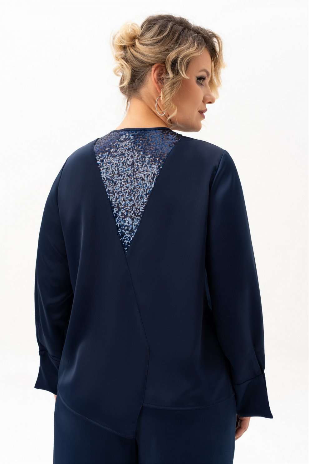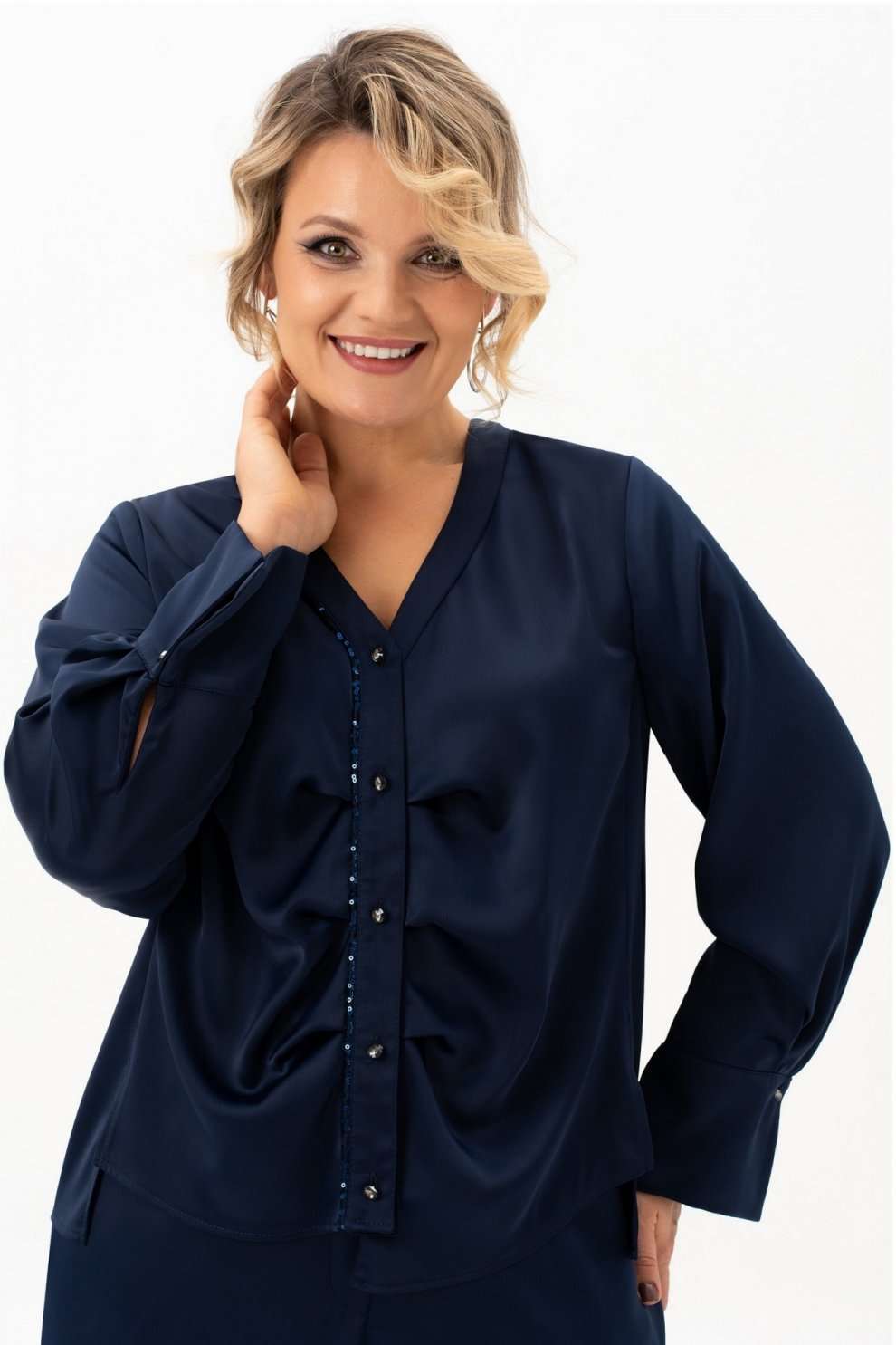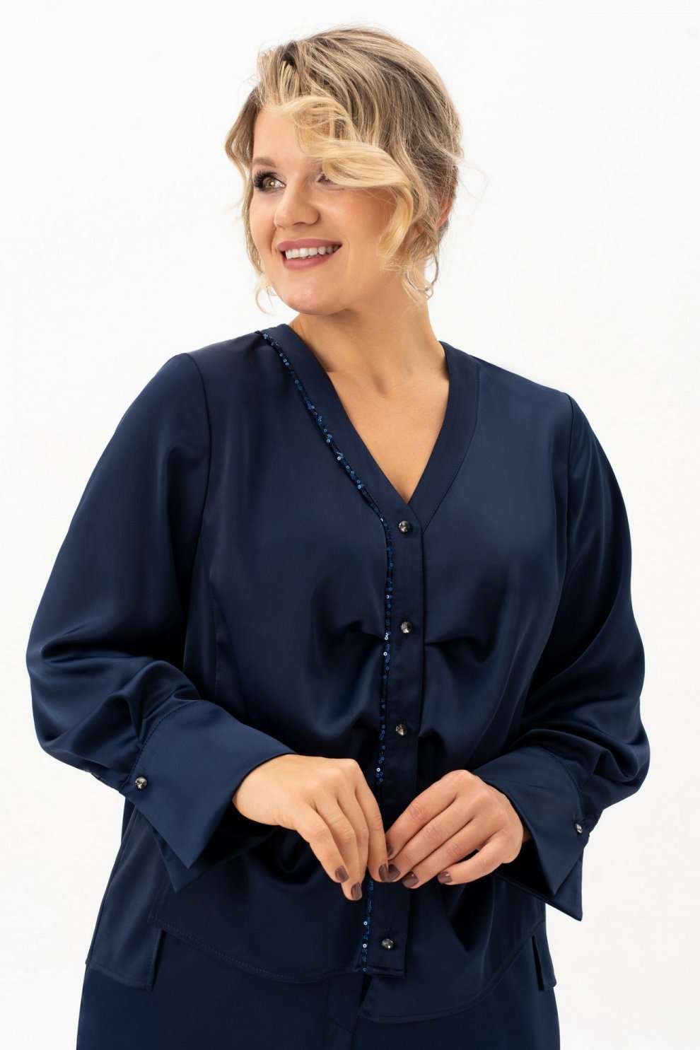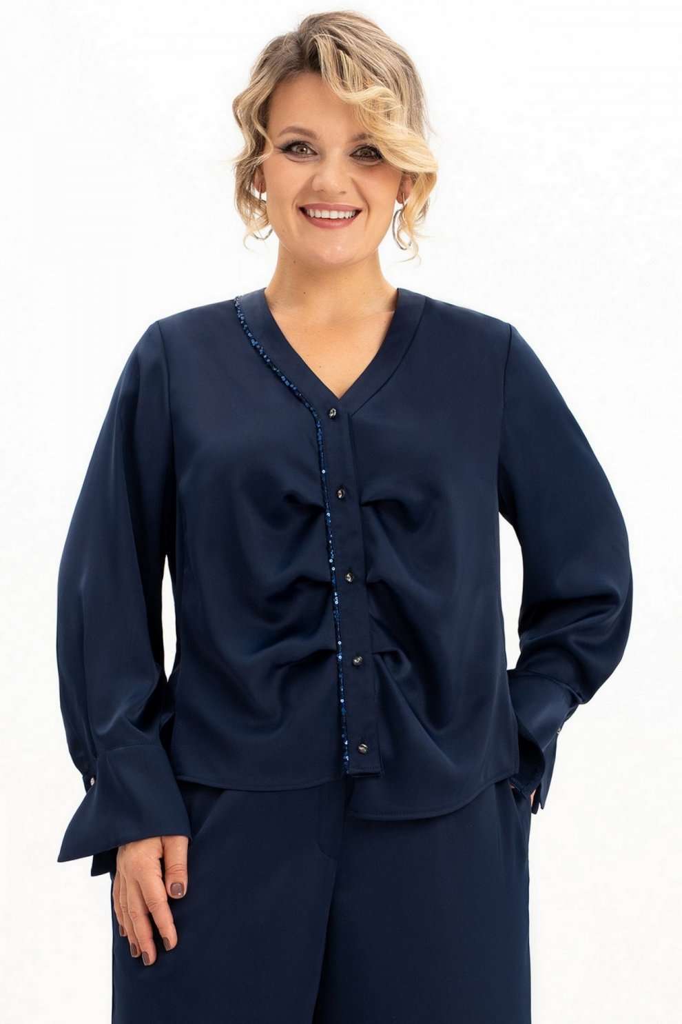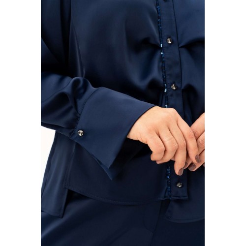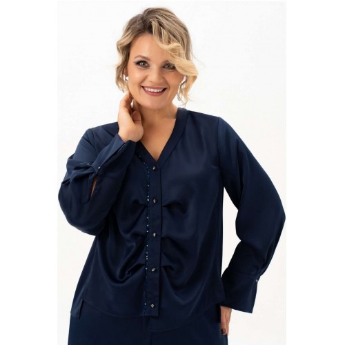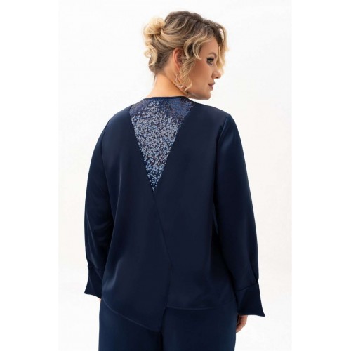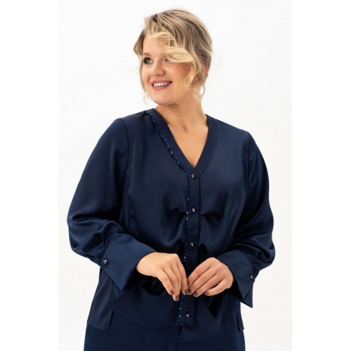 Блузка 4113-8-с Algranda (Новелла Шарм) — это идеальный выбор для особых случаев и повседневной носки. Коллекция бренда Альгранда предлагает изящный дизайн с длинными струящимися рукавами и без воротника, что придаёт облику легкость и женственность. Блузка выполнена из высококачественного полиэстера с добавлением эластана, обладающего мягкостью и эластичностью. Декоративные элементы из пайеток на спинке и вдоль планки добавляют блеска и изысканности. Асимметричный низ и силуэт с вертикальными разрезами подчёркивают фигуру и визуально стройнят. Длинна изделия составляет 68 см, а длина рукава — 62 см, что делает её идеальной для весны и осени. Насыщенный синий цвет создаёт гармоничный образ для делового офиса и праздничных мероприятий.
