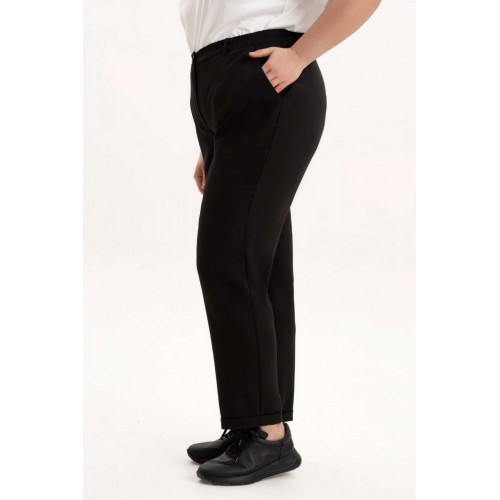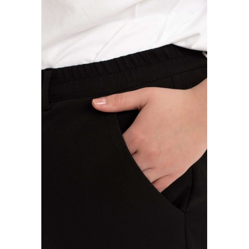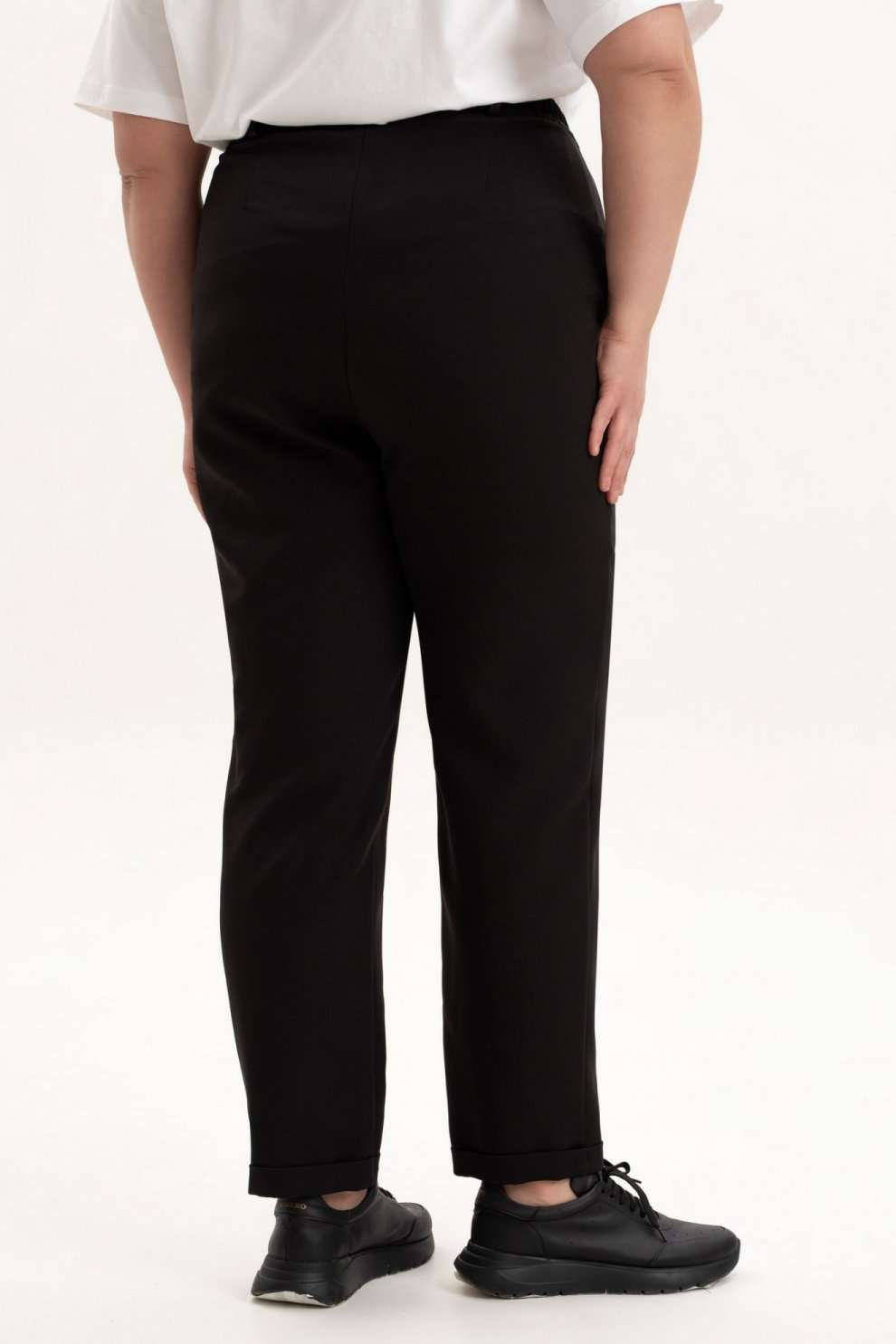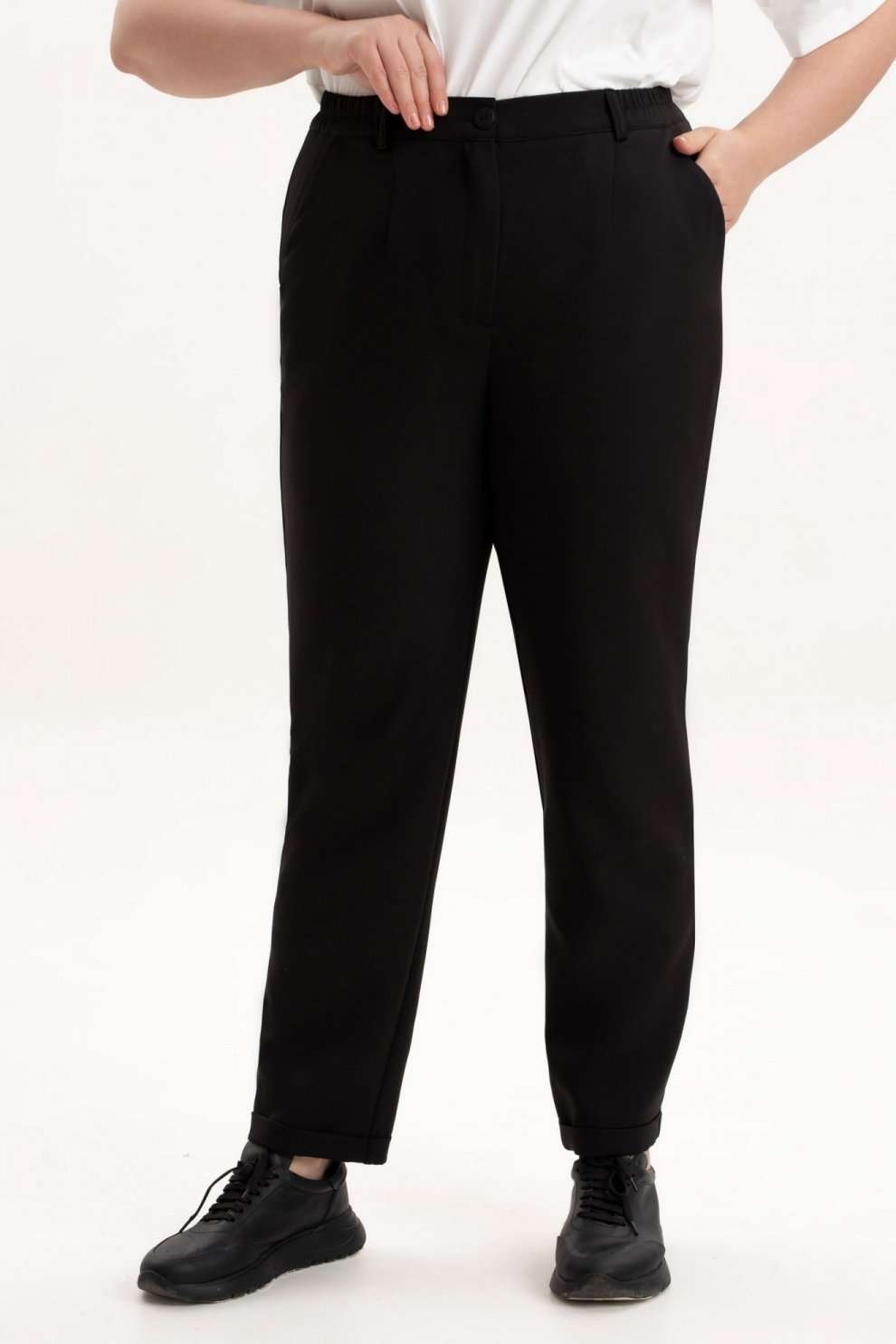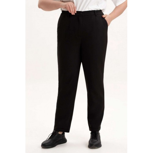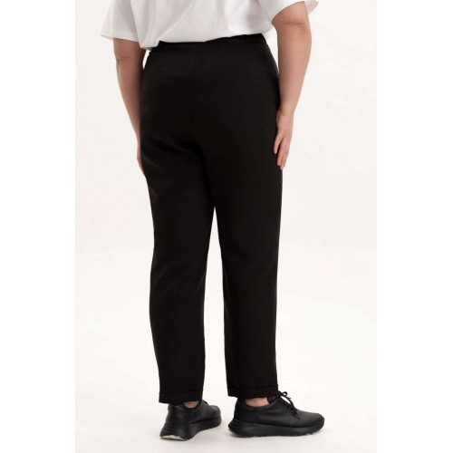 Брюки женские на резинке подчеркнут женственность и элегантность фигуры и станут незаменимым элементом базового гардероба. Брюки зауженные к низу, выполнены из качественной, приятной на ощупь костюмной классической ткани, которая не деформируется после стирки, не вытягивается и не скатывается при активном образе жизни. Брюки с высокой посадкой и эластичной резинкой на поясе обеспечат Вам идеальный силуэт, подчеркнут все достоинства фигуры и создадут максимальный комфорт в движении. Зауженные к низу штанины красиво оформлены и за счет удачного фасона невероятно стройнят. Женские брюки представлены в больших размерах - плюс сайз. Благодаря своему крою и выверенному лекалу подойдут как стройным так и полным женщинам. Брюки идеальны для создания строгих офисных луков и стильных повседневных, а также праздничных вечерних образов идеальны для работы, учебы, прогулок и мероприятий.. Данная модель выгодно подчеркнет Ваши достоинства, помогут создать офисный, нарядный, вечерний и повседневный образ в стиле кэжуал. Однотонный черный цвет этих брюк гармонично сочетаться с любым верхом. Прекрасный вариант на осень, зиму и весну. Высокая посадка брюк удлияет ноги и стройнит. Подходят полным девушкам и для стиля оверсайз. По низу брюк обработаны манжеты. Пояс частично на резинке, застежка на молнию и петлю с пуговицей.