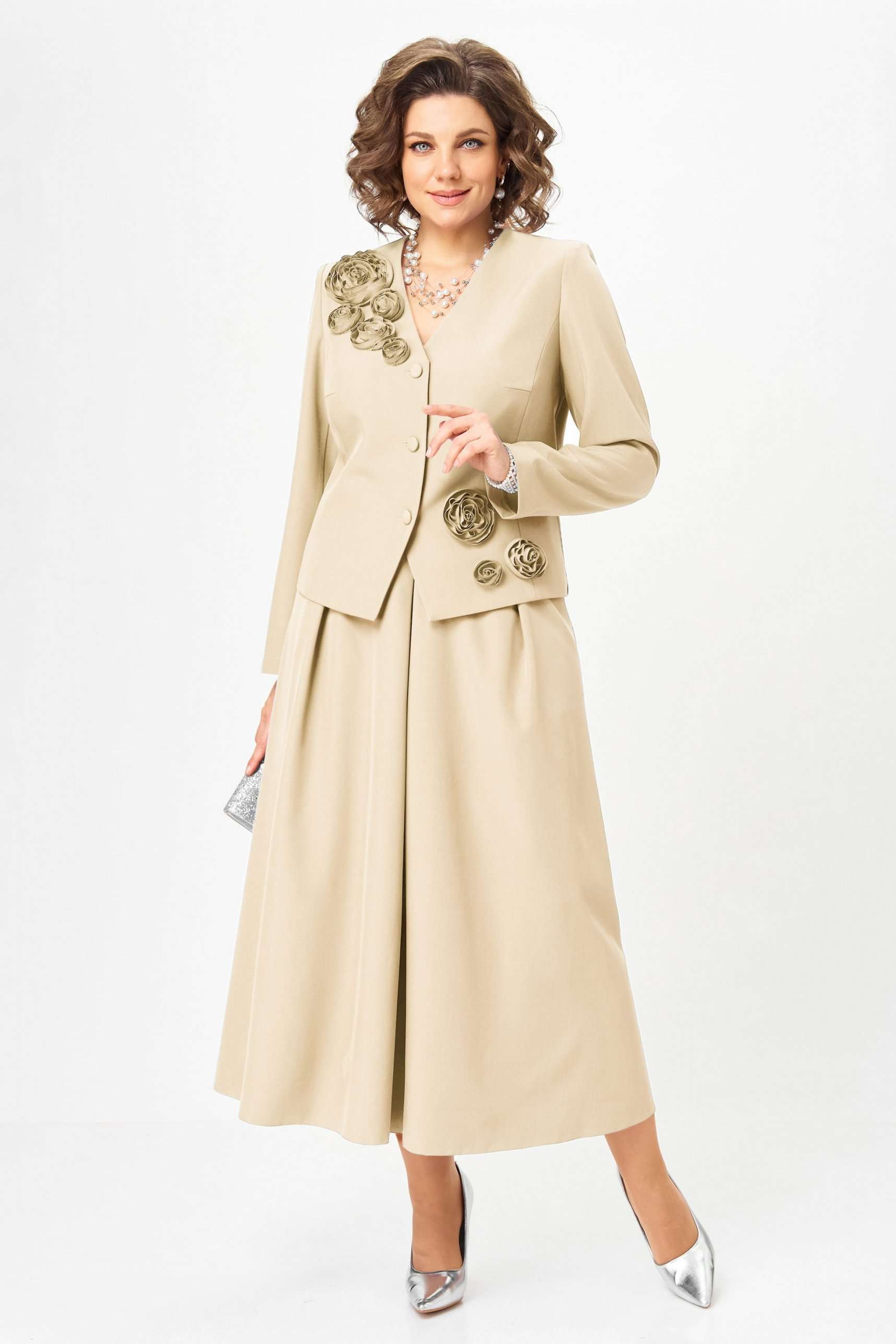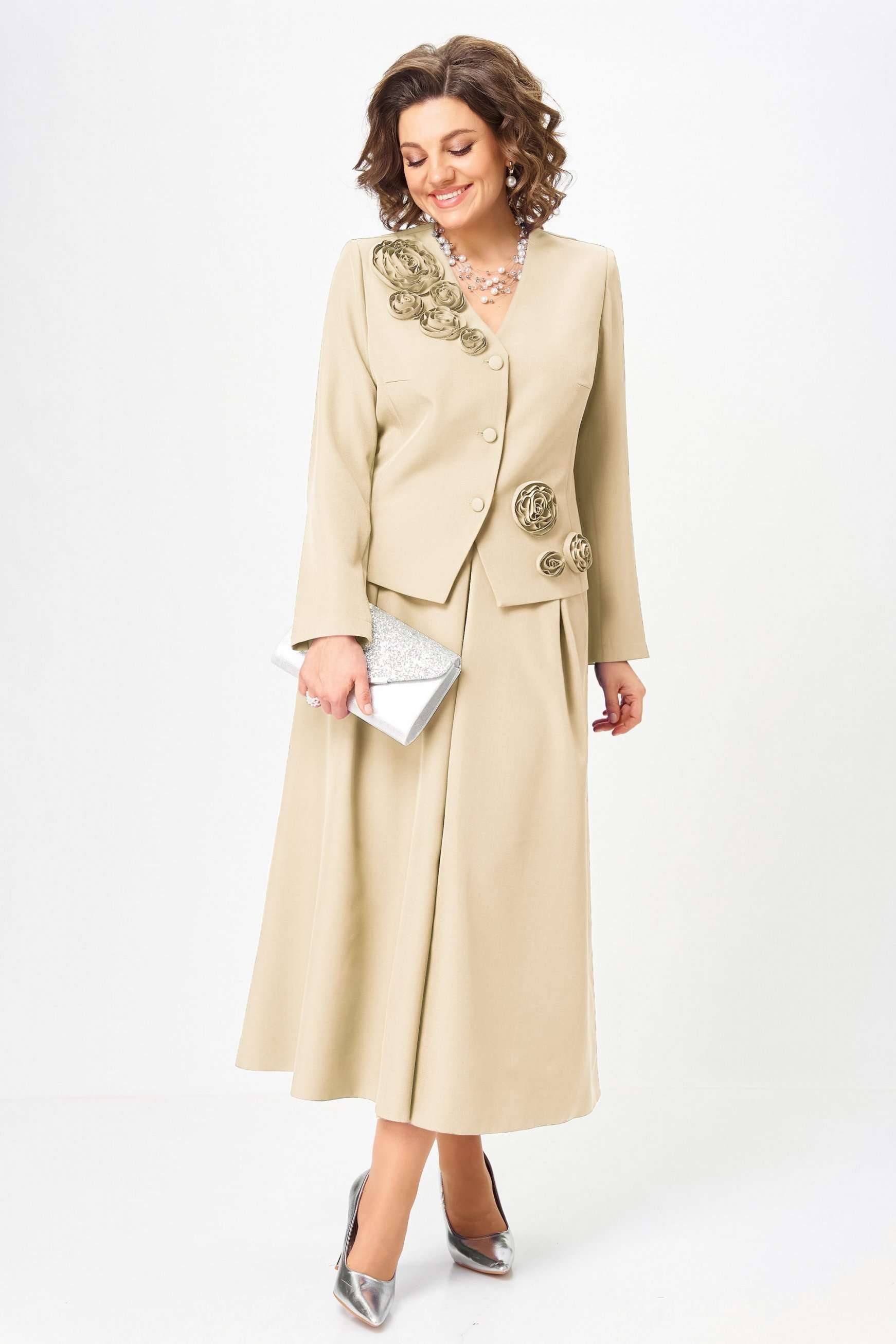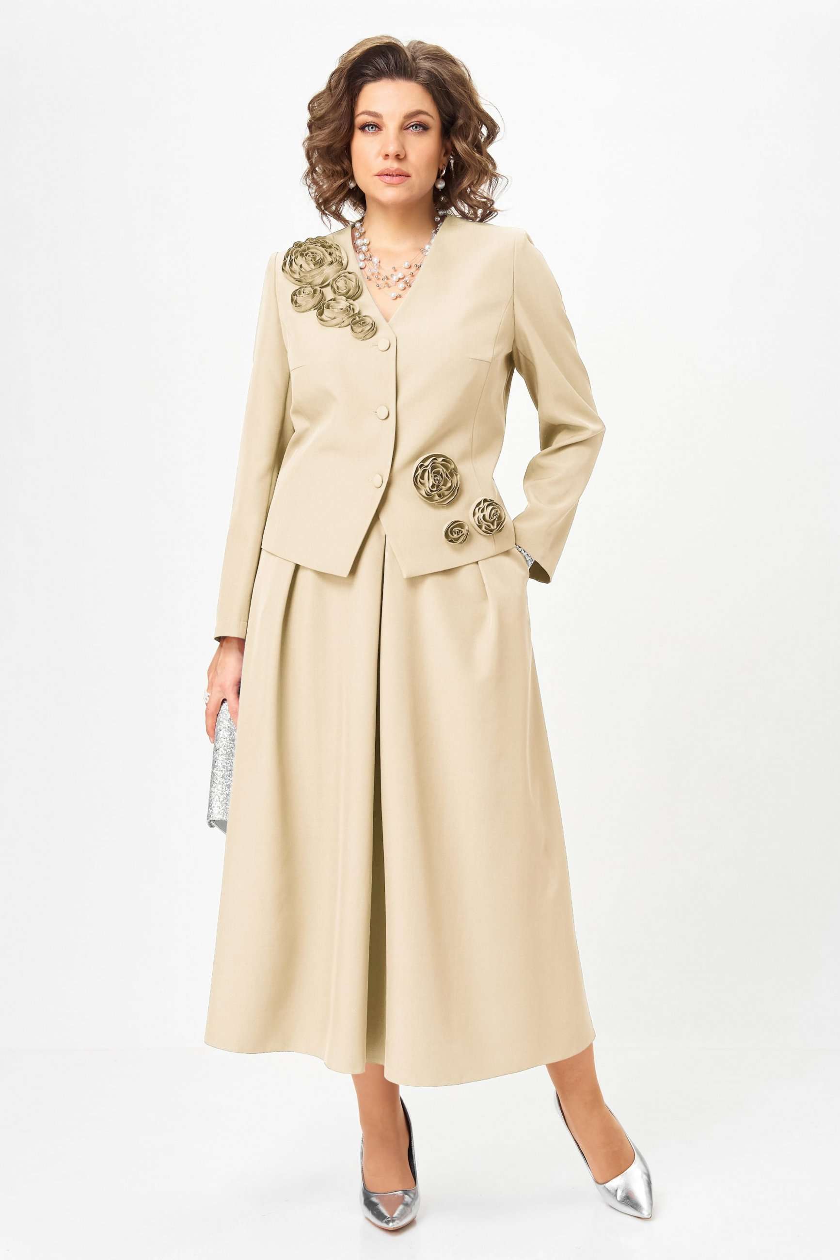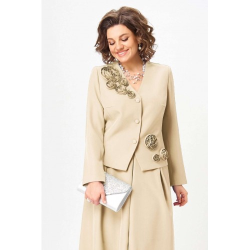 Элегантный юбочный костюм, стильный и универсальный наряд для торжественных и праздничных мероприятий. Обеспечит вашему образу максимум внимания и комплементов , благодаря безупречному подбору цвета и художественному оформлению цветочной аппликации ! Жакет с подкладкой по полочке , полуприлегающего силуэта с v образным вырезом , рукав втачной двух шовный . Юбка без подкладки, на поясе с боковыми резинками, расклешенного силуэта со складками по переду и боковыми карманами . Длина жакета - рр 50,52 - 55см, рр 54,56 - 58см Длина рукава - 61,5см Длина юбки - 90см